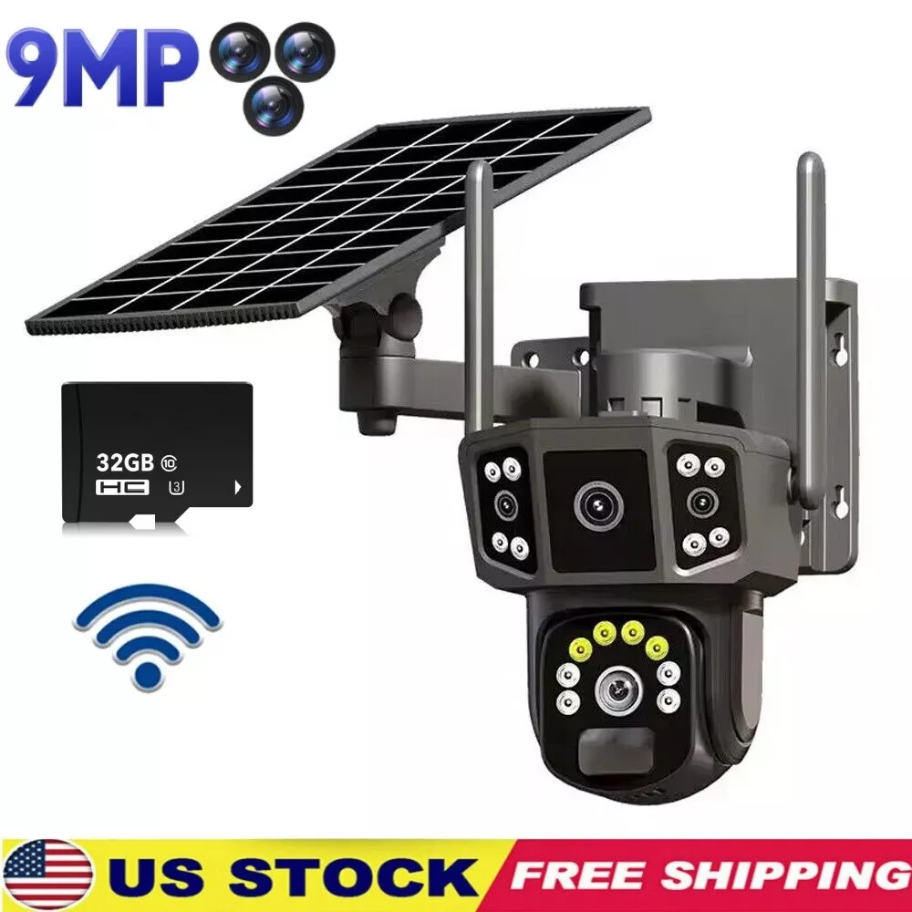 Three Lens 9MP WiFi Solar IP Camera Wireless Outdoor CCTV PTZ Home Security Cam