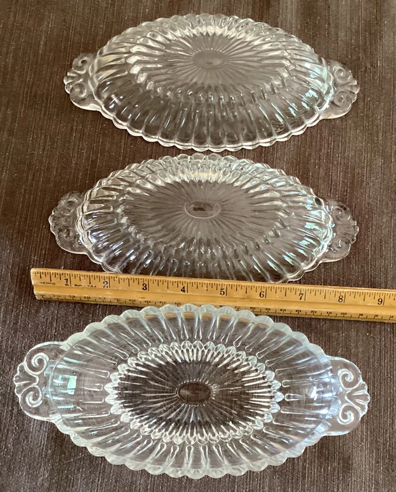 Add a touch of vintage charm to your table setting with this set of three clear glass dishes. Perfect for serving relish or ice cream, these oval-shaped bowls feature a swirled handle for easy and comfortable use. Measuring 8 1/2" x 4" x 1 1/2" in size, these dishes are made of durable glass material and come in a beautiful clear color. Have questions, please write. Shipped USPS Mail