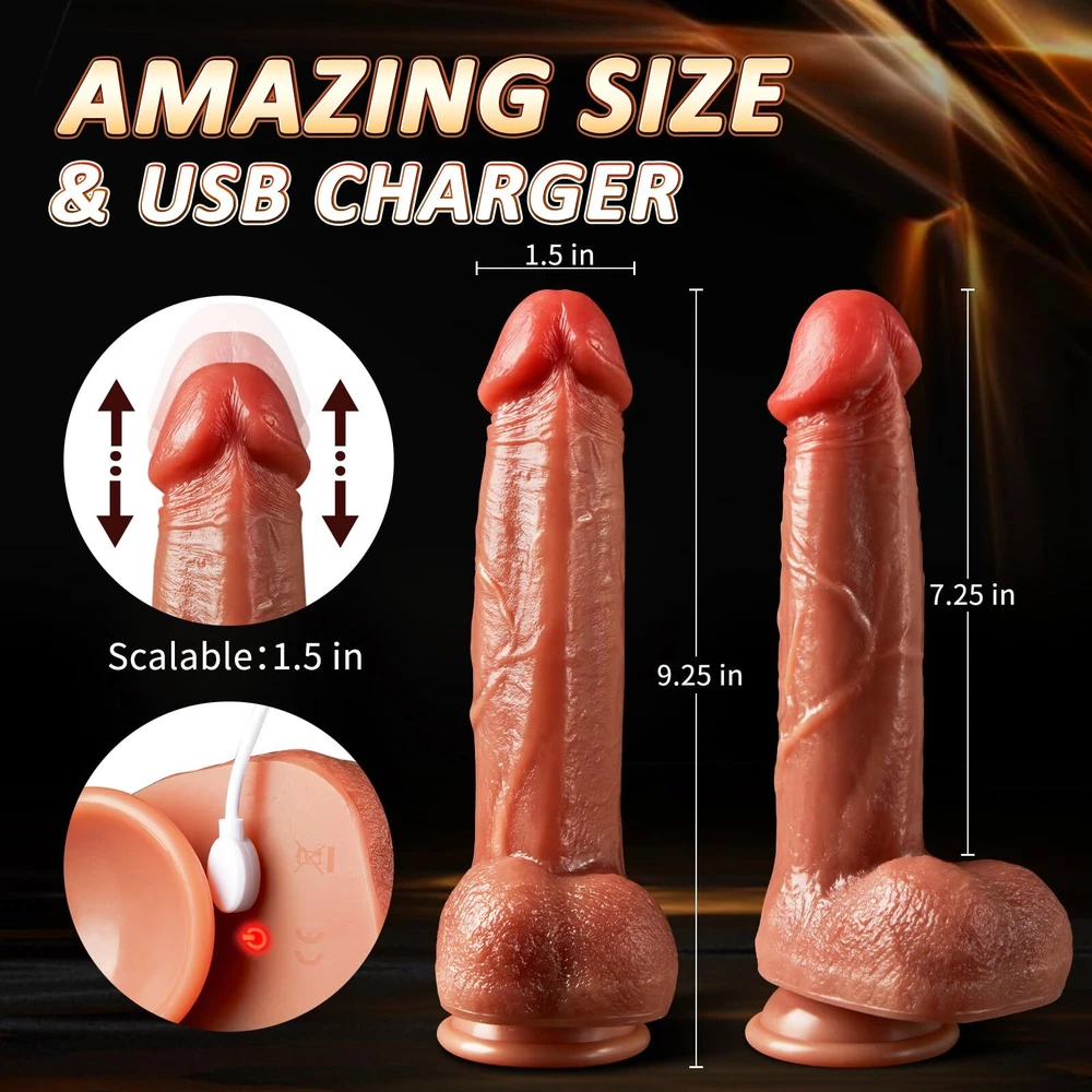 Thrusting Dildo Vibrator Sex Toys with 5 Thrusting 5 Vibrations Modes, 9.25 inch Vibrating Dildos for Women Clit G Spot Anal Play, Adult Sex Toy with Strong Suction Cup for Women Men Couple Pleasure, Remote Control Waterproof Female Realistic Dildo Swing Rotating 104°F Heating Lifelike Penis for G-spot Anal Butt Plug Stimulation DISCREET PACKAGING We will ship your package discreetly in an unmarked box, Your used id, name or information will only be available to us ,other buyer can't see If you have any questions, please contact us, We are care about your shopping experience and the performance of the product. Features(About the item): ❤ 【2024 Upgrade Dildo】What makes this thrusting dildo different is that it is almost like the real one, including size, softness, texture and color. The 5 thrusting modes are very powerful and more suitable for wild players, and the 5 different frequency vibration modes allow you to have fun with different sensations every time. Also perfect for deep throat exercises, it is perfect as a sex toy and this dildos must can become your best partner. 107°F Heating, Remote Control which will definitely meet all your needs! ❤ 【Realistic Dildo】The amazing thing is that we have conquered new technology, using the highest quality liquid silicone to create a dildo that is almost indistinguishable from a real one; whether it's the glans, veins, sponges or balls, it's all a one-to-one simulation to give you a better feeling of experience. ❤ 【3 IN 1 Adult Toys】In terms of functionality, we have combined the features of a dildo and a G-spot vibrator to perfectly design this new thrusting dildo vibrator with a remote control that allows you to control either the vibration or the retractable alone, or both functions working together. It can be both a G-spot vibrator and a thrusting dildo, allowing you to get multiple functions for the price of one product. ❤ 【5 Powerful Vibration & 5 Thrusting Modes】I believe that only advanced technology can develop a powerful and quiet motor, equip this motor to the dildo to become a powerful vibrator. 5 different vibration frequencies with rhythmically changing stretching will bring you to orgasm quickly and also allow you to choose your preferred pace of sex, do not worry about your partner's physical ability, turn on your pleasure mode and end this pleasurable game anytime. ❤ 【Strong Suction Cup】It works best if you're prepared to get a little wet before attaching the vibrating dildo to a smooth surface. Once a strong suction has been created, it can take a fair amount of pushing and shoving, leaving your hands free to add to the experience in other ways, freeing up your hands and adding more fun. This G-spot dildo is perfect for anal sex lovers and we highly recommend it if you are curious about mystical stimulation. ❤ 【Easy Charging & Secret Packaging】The charging port of this dildo is on the bottom, the charging port is hidden and next to the power button, so it is hidden and stays waterproof. From this, you don't need to go to the store to buy batteries, just a quick charge to start the day off right; the package arrives wrapped in a black package that doesn't reveal any of your privacy, so you don't have to worry about giving away your secrets! Package Listing 1 x Telescopic Thrusting Heating Rotating Dildo Anal G-Spot Vibrator Sex Toys for Men Women Couples 1 x USB charge cable 1 x Instruction User manual 1 x Remote Controller Reasonable Size & USB Magnetic Charging The thick dildos vibrator is USB magnetic charging, it designed according to ergonomics and can reasonably stimulate points. Whether you are working, traveling or going out, you can take it with you. Remote Control Button Design The real feel vibrating dildo massager can be remotely controlled, and there are 3 different buttons on the remote control, corresponding to the vibration button, the switch button, the telescopic button and the heating button. Discreet Packaging The lifelike dildo couple sex toys is privately packaged, and shipped discreetly, No one knows what product is in the package, and there will be no embarrassment when receiving the package, ensuring your privacy.