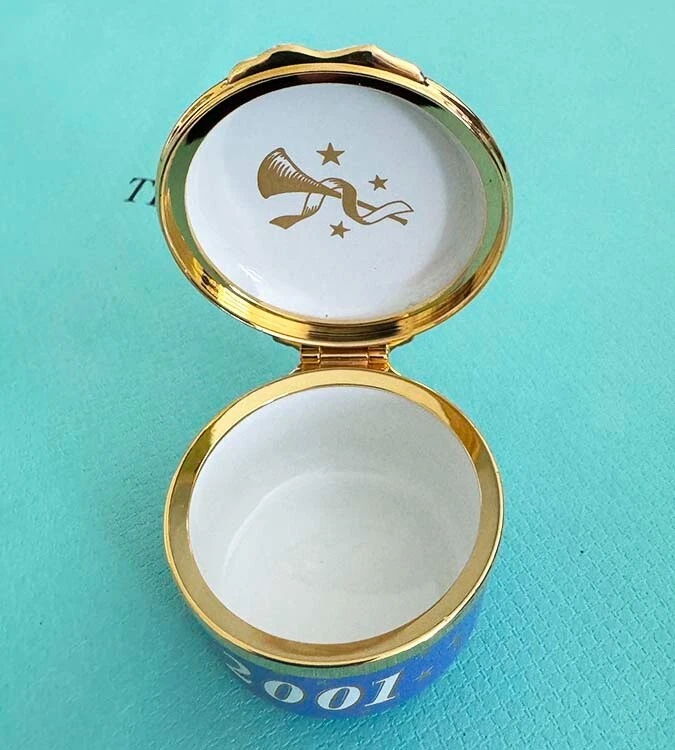 ** CELEBRATE THE SEASON....FESTIVE VINTAGE HOLIDAY MAGIC.... *Wonderful... TIFFANY & CO DESIGNED ARTISTIC... HALCYON DAYS ENAMELS 2001....With Baby CHERUB DRAPED IN GOLDEN RIBBONS PLAYING A GOLDEN HORN...CELEBRATION! CHRISTMAS...HAPPY NEW YEAR!...CHEERS! Artistic...Lovely Blue with Gold Stars, Ribbons, Creamy Light Cherub...Handsome Golden Metal Detailings... Golden Horn, Ribbons, Stars on inside lid... Year: 2001 on the side. HAPPY NEW YEAR! Printed on the Bottom of Small Trinket or Pill Box: HALCYON DAYS ENAMELS ENGLAND DESIGNED BY TIFFANY & Co. Enamel, Quality Hand Crafted, Hinged Small Round Trinket Box Made in England. Comes with Small T&Co Blue Box. NICE Pre-Owned Condition. Little Light wear. Hinge works fine...Closes well. **PLEASE see Photos above as part of the description. Porcelain Trinket Box only. (**No Presentation Box**) Carefully wrapped for shipping via Mail. No International Shipping. Shipping in US only. TY. Thank you for looking! * HAPPY ALOHA HOLIDAYS!*
