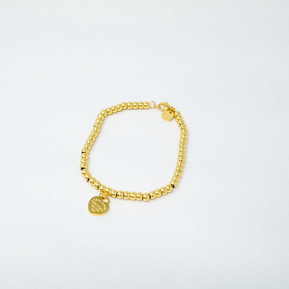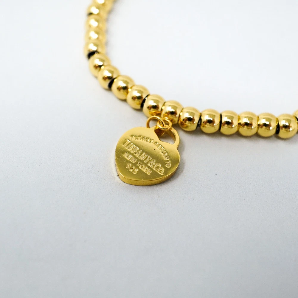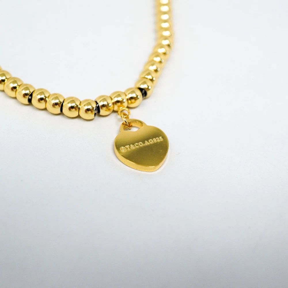 Tiffany & Co. 925 Gold Tone Beaded Link Heart Charm Bracelet 18cm Gift Box Set