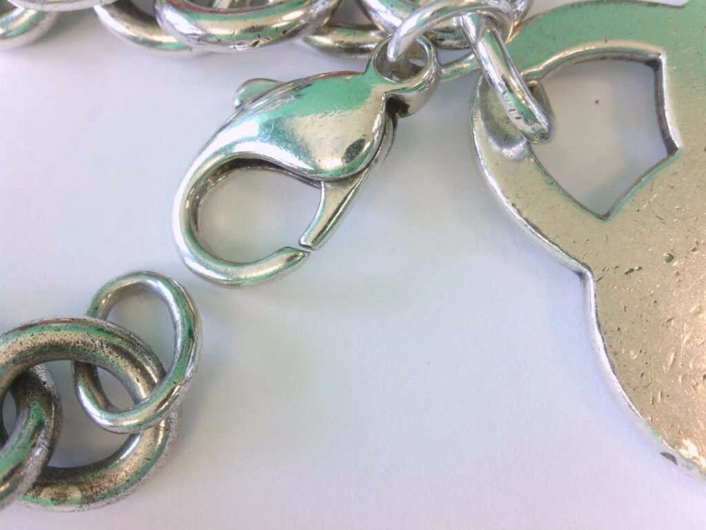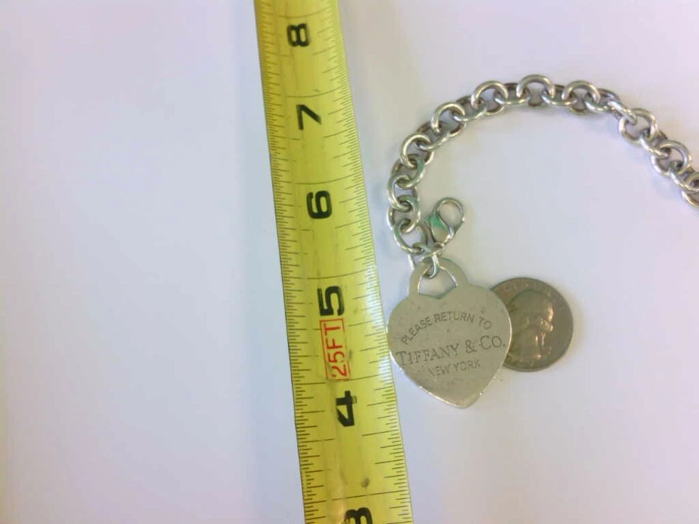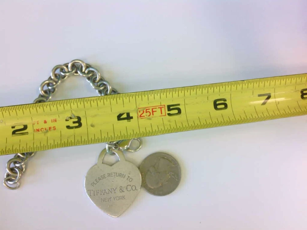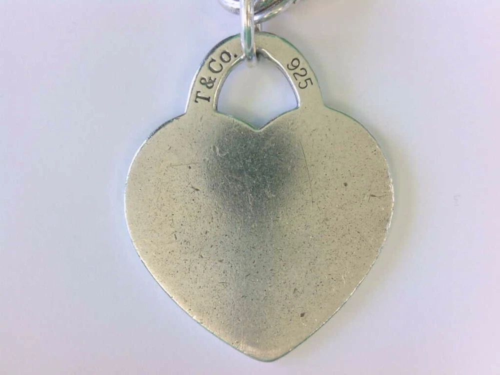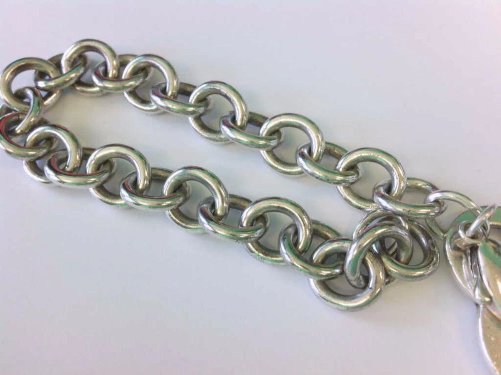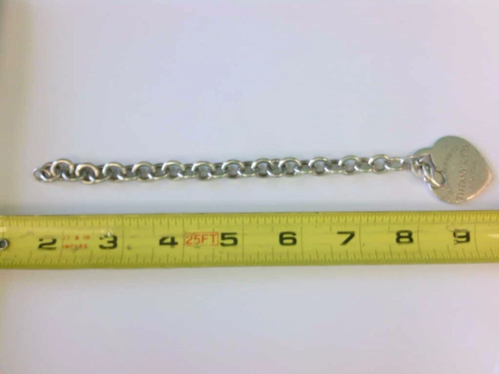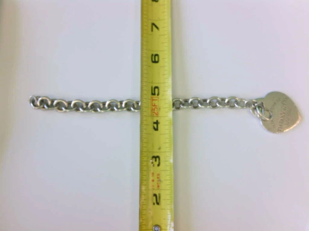 You are viewing a Tiffany & Co 925 SS LARGE Heart Tag Charm Bracelet. 7 1/2".BUY NOW!! Read below for further details... DOES NOT INCLUDE ORIGINAL BOX OR POUCH. WILL BE IN THE BAG YOU SEE IN THE PICS. THERE IS NO MONOGRAM. THIS IS THE LARGE HEART VARIETY. I DO NOT KNOW IF THIS BRACELET WILL FIT YOUR WRIST. THE HEART HAS SOME WEAR- ROUGH EDGES, HAIRLINES. SEE PICS. THIS IS A PRE-OWNED BRACELET WITH PRE OWNED WEAR AND HAS NOT BEEN PROFESSIONALLY POLISHED BY A JEWELER. ITS PRICED WELL FOR THOSE WHO UNDERSTAND A GOOD DEAL WHEN THEY SEE ONE. ITS NOT PERFECT. PLEASE MAKE SURE YOU CHECK OUT THE PICS AND READ DESCRIPTION. Seller's Notes: I have sold and currently listing some wonderful items to the great people of eBay. This is the exact item you will receive. Nice Tiffany & Co Sterling Silver 925 Heart Tag 6.5 inch Bracelet. The Charm and Bracelet have toning, hairlines, small dings and some wear. . Not monogramed. No issues with the lock. WEAR/GIFT READY. For Cleaning - PLEASE CONTACT A PROFESSIONAL JEWELER. As far as polishing it is my understanding that Tiffany & Co polishes their items for customers for no or little money. AGAIN - DOES NOT INCLUDE ORIGINAL BOX OR POUCH. WILL BE IN THE BAG YOU SEE IN THE PICS. Would add nicely to any collection. See high def pics to determine condition ,style, etc. PLEASE CHECK OUT MY OTHER AUCTIONS!! THANK YOU!! Particulars: Total weight- 35.2 grams. Length- 7 1/2 Inches Other measurements- Please see pics. Hallmarks- Tiffany & Co, 925. AGAIN - NO ORIGINAL BOX OR POUCH IS INCLUDED. WILL BE IN THE BAG YOU SEE IN THE PICS. Item will be as pictured. Foreign bidders- total shipping weight will be 4 ounces. Bidding and Shipping: I will ship to 48 states. USPS Priority with tracking and insurance and signature. Buyer will pay a flat fee of $5.99. Alaska, and Hawaii will pay a shipping rate based on eBay. Overseas shipping using eBay Global Shipping- YES PLEASE NOTE: I WILL NOT SHIP THIS PERSONALLY- MEANING I WILL USE EBAY GLOBAL SHIP TO SHIP THIS ITEM THEREFORE OVERSEAS BIDDERS YOU WILL HAVE IMPORT CHARGES. I DO NOT KNOW OR AM I RESPONSIBLE FOR THOSE CHARGES. PLEASE CONSIDER THIS BEFORE YOU MAKE YOUR BID. THANK YOU. I WILL ALSO OFFER A 2ND OPTION - FOR THOSE WHO DO NOT WANT GLOBAL SHIP. IT MUST BE A RECOGNIZED COUNTRY THAT WILL ALLOW ME TO SHIP THRU EBAY. I WILL NOT CALL THIS ITEM A GIFT WHEN SHIPPING OVERSEAS. Please pay within 2 days after the auction is complete. I usually ship 1-2 days after receiving clear payment. Sometimes sooner depending on time constraints. Item sold "as is" We have the right to end this auction at anytime. I do not ship on Saturdays Great feedback is always appreciated!!! This is a "BUY NOW" auction. Priced to sell!! Will combine shipping- Just let me know. Thank you!! ____________________________________________________________________________ Tiffany & Co Bracelet bracelet ready to be added to your collection. If you have any questions please feel free to contact me at anytime. I usually respond within 24 hours sometimes sooner. Thank you and happy bidding!! PLEASE TAKE A MOMENT AND CHECK OUT MY OTHER AUCTIONS!!