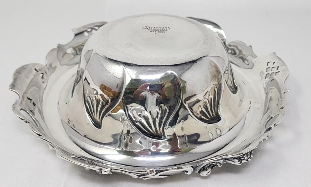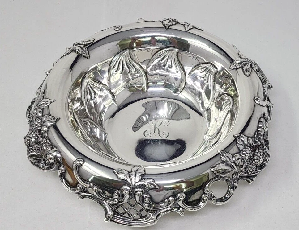 Tiffany & Co Blackberry Pattern 14619 Bowl Pierced Lip Rococo Curves ca 1900. Measures 9-3/4" wide X 3" high. Weighs 16.6 troy ounces. Monogrammed in center of bowl with the letter K 1880-1905. In EXCELLENT condition. No dings or dents. BEAUTIFUL. When you purchase multiple items, shipping costs will automatically be combined and will reflect our shipping discount. If for some reason, it is not combined for you, please contact us so that we can adjust it for you. We guarantee that items are accurately described and carefully packaged. If any item is not as described, it may be returned in its original condition for a full refund, after contacting us.