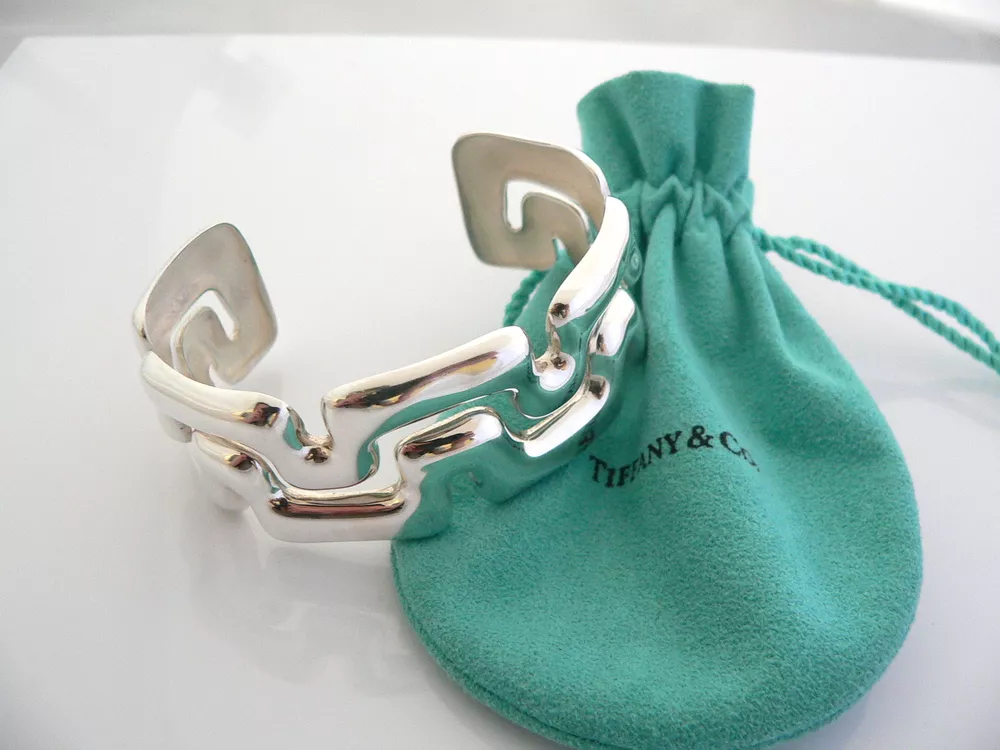 Overview: Offered for sale is a wonderful, super cool, and gorgeous Tiffany & Co Sterling Silver Puzzle Wide Cuff / Bracelet. Definitely a Tiffany piece that you will get your money's value for. It works perfectly with pretty much any attire your put on, AND is the perfect Tiffany statement piece. It is the perfect piece that fits a lifestyle on the go -- the cuff can be worn to pretty much any occasion! It is simple, elegant, and classic all rolled into one bracelet - it looks awesome worn alone, but is elegant and simple enough to complement your other jewelry pieces. Imagine wearing the cuff with your office attire... now imagine it with jeans or weekend wear ... Perfect anytime! It is a perfect Tiffany piece to start or add to your collection. As always, the item is fully hallmarked and guaranteed to be 100% authentic. Wonderful present for yourself or anyone you love! Will surely delight! Particulars: Size & Measurements: The cuff is 2.4 inches at its widest ends, with a 1.45 inch opening Metal & Hallmarks: Tiffany & Co. / 925 Solid 925 sterling silver Please check out my other unique and interesting Tiffany items on sale.