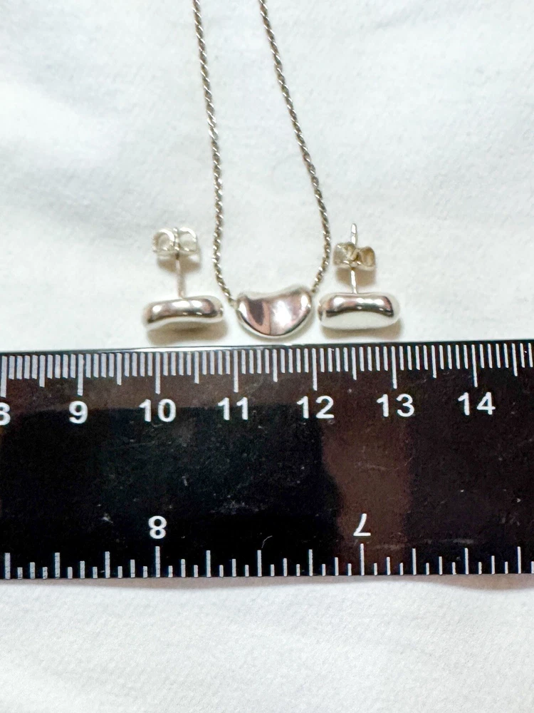 Just in time for Christmas!! Elevate your jewelry collection with the exquisite Tiffany & Co. Silver Elsa Peretti Bean Necklace and Earrings set. Crafted from high-quality .925 silver, this elegant ensemble features a beautifully designed bean pendant on a 16-inch chain, offering a delicate yet striking look. The total weight of the set is 8.22 grams, ensuring a lightweight feel while maintaining a luxurious presence. The necklace pairs perfectly with matching earrings, each showcasing the iconic bean shape that symbolizes beauty and simplicity. This set comes beautifully packaged in a Tiffany & Co. box along with a jewelry pouch, making it an ideal gift for yourself or a loved one. Embrace timeless elegance with this stunning Tiffany & Co. jewelry set.