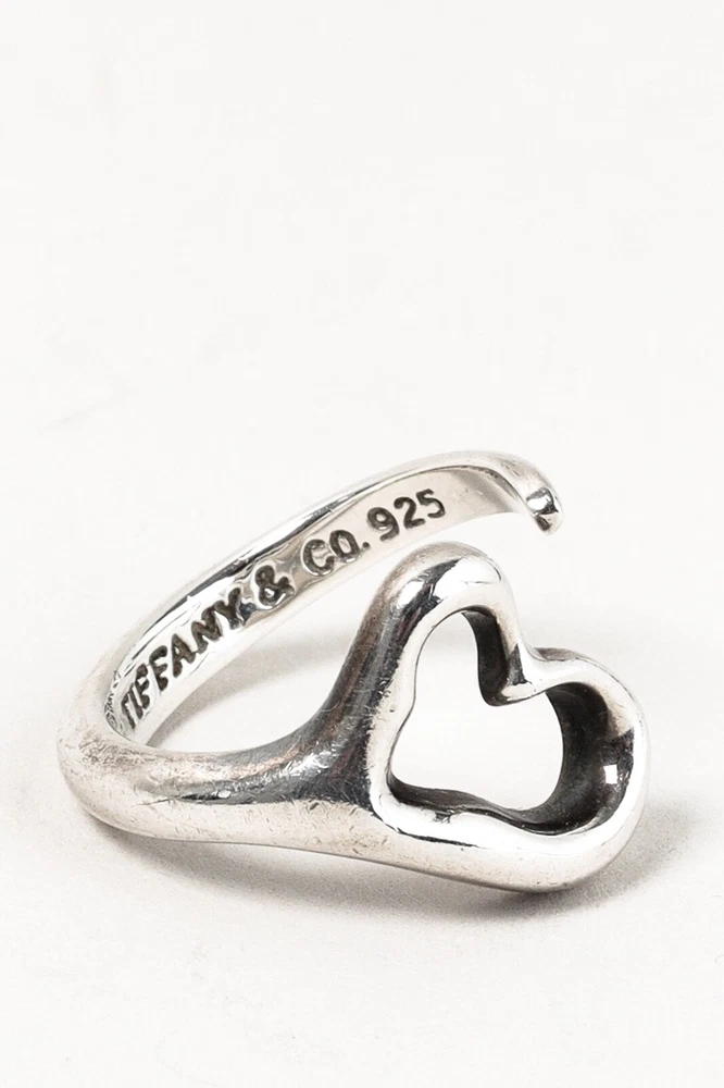 Celebrating the spirit of love, the Open Heart ring from Tiffany & Co. Elsa Peretti is crafted in a sterling silver, and its simple and evocative cutout heart is a timeless and elegant design. Size: 5 Condition: Excellent; very light tarnishing on edge of heart. Comes with dustbag. Approximate Measurements: Circumference: 2” (5 cm) Composition: Sterling silver.