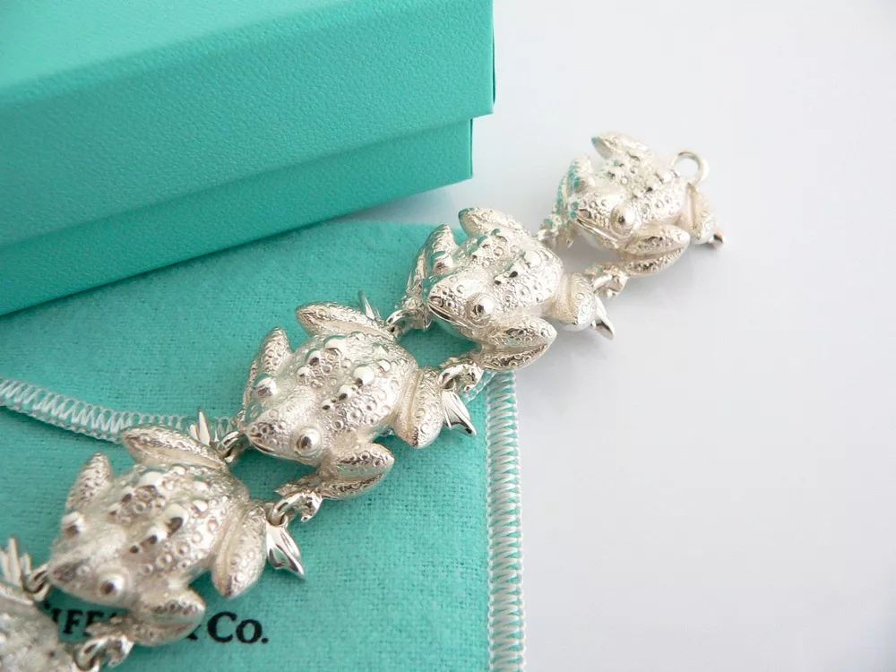 Feel like making a statement with your jewelry? Here's one that fits the bill wonderfully. Offered for sale is a gorgeous, very rare, and super awesome Tiffany and Co. Nature Frogs Link bracelet. A truly unique and awesome statement bracelet - you will be one of the few to own this piece (I am 100% sure of it!). It is the perfect piece to wear when you want to make a classy and elegant statement. This awesome piece is composed of bright and solid Tiffany silver formed in the shape of super cool Frogs linked together! Wonderful bracelet that fits a lifestyle on the go -- this piece can be worn to almost any occasion! Imagine the piece with your professional office attire ... Now imagine it with a little black dress ... One last, imagine it with jeans or a really cute sundress ... Perfect in every way! The item is versatile, very comfortable to wear, and is in excellent condition. A classic and perfect Tiffany piece to start or add to your collection. No longer in production, it is perfect for the collector. The item is fully hallmarked and guaranteed to be 100% authentic. It w ill come with its Tiffany pouch and box as shown! Perfect and ready for gifting! Wonderful present for yourself or anyone you love! Will surely delight! Particulars: Size & Measurements: The bracelet is 7.5 inches from end to end. Metal & Hallmarks: Tiffany & Co. / 925 Solid 925 sterling silver Please check out my other unique and interesting Tiffany items on sale.