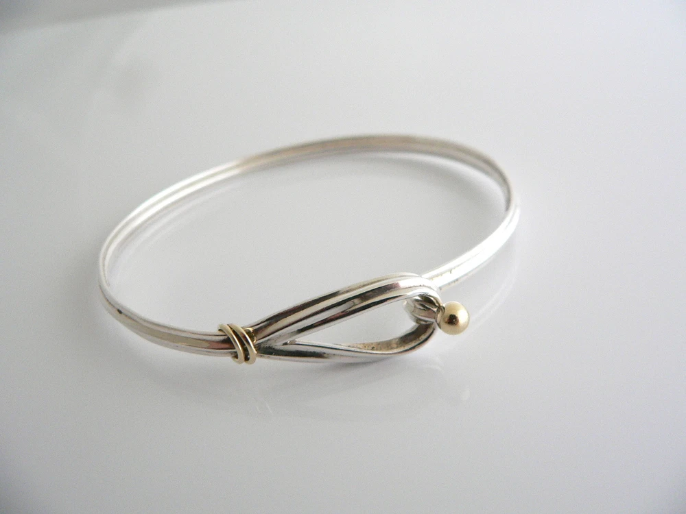 Overview: Offered for sale is a wonderful Tiffany and Co. Silver and 18K Gold Hook and Eye Bracelet / Bangle. The bangle is made from solid Tiffany silver and 18K gold, allowing you to combine the piece with almost any other piece of jewelry you already own. The style is classic Tiffany, making it a piece that you will most certainly use over and over again. It is very comfortable to wear, and is in excellent condition. Great piece to wear to work, or for just going to dinner with friends in jeans or a pretty dress. A great Tiffany piece to start or add to your collection. The bracelet is fully hallmarked and is guaranteed to be 100% authentic. Wonderful present for yourself or anyone you love! Will surely delight! Particulars: Size & Measurements: The widest part of the bangle is approx. 2.5 inches. Metal & Hallmarks: Tiffany & Co. / 925 / 750 Solid 925 sterling silver and 18K solid gold Please check out my other unique and interesting Tiffany items on sale.
