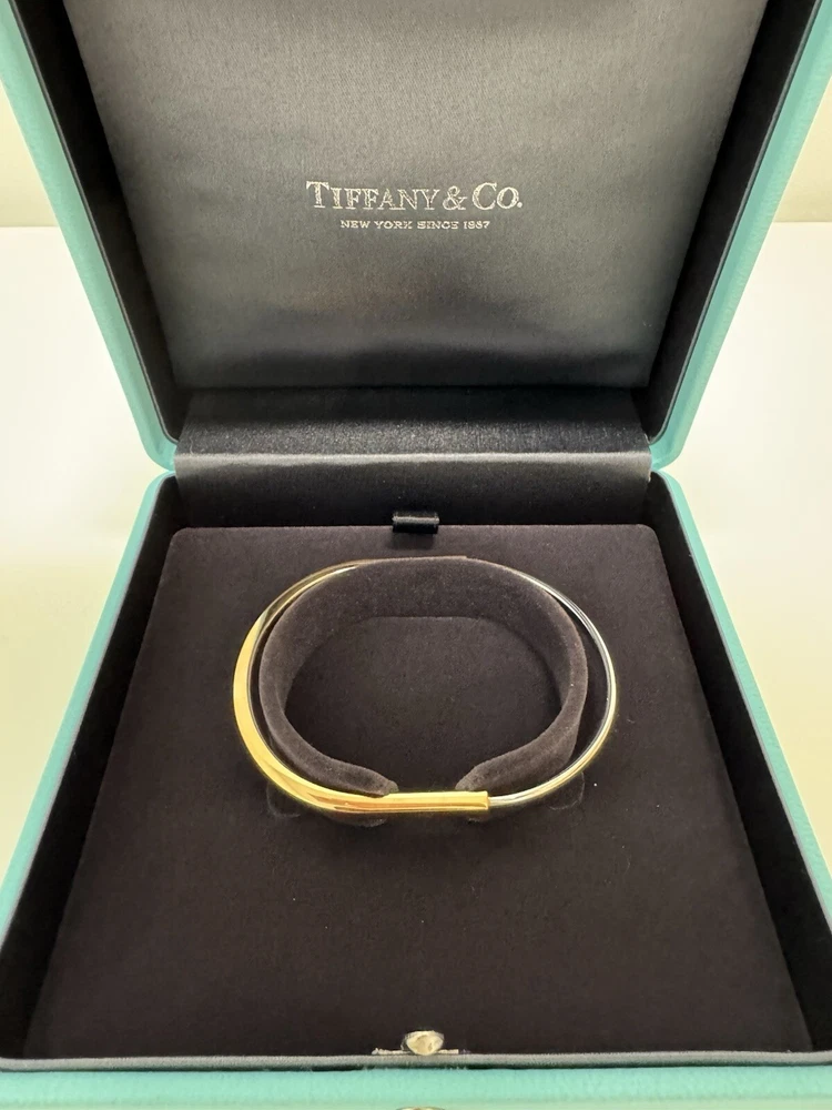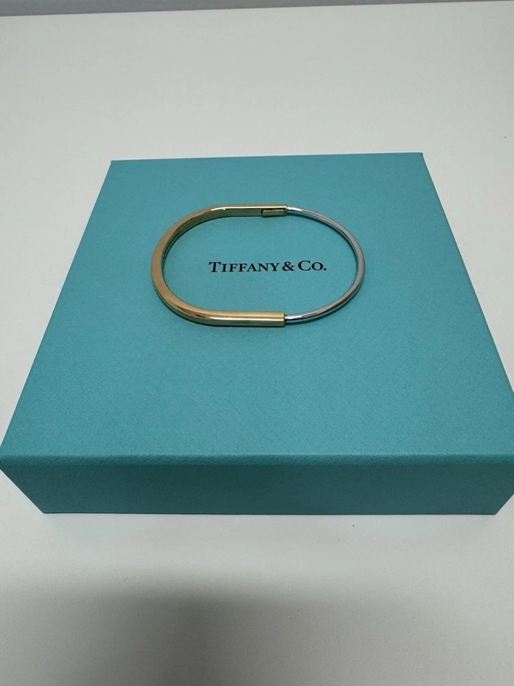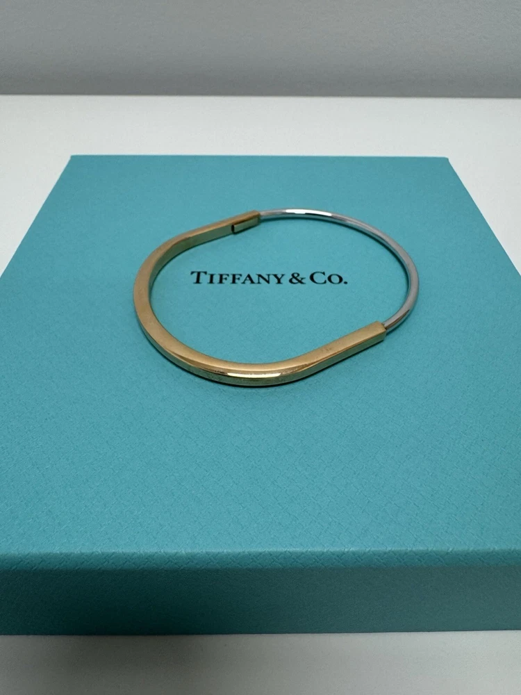 Tiffany Lock is an expression of love’s enduring protection, inspired by a padlock from The Tiffany Archives that dates to 1883. Designed to keep safe that which is cherished, Lock is a universal symbol of what matters most. This style is expertly crafted in 18k yellow and white gold. For maximum impact, pair it with other designs from the Tiffany Lock collection. Our 18k white gold is plated with rhodium to maintain its brilliance. Hidden closure SIZE MEDIUM - MSRP: $4,500 * 18k Rose and white gold * Motif size, narrow * Wrist size, medium