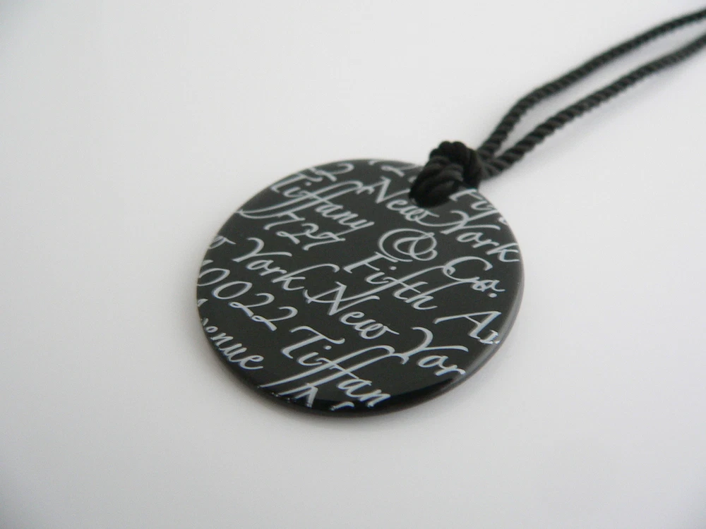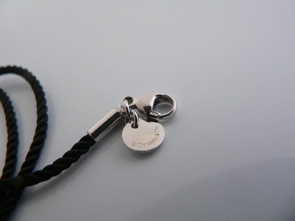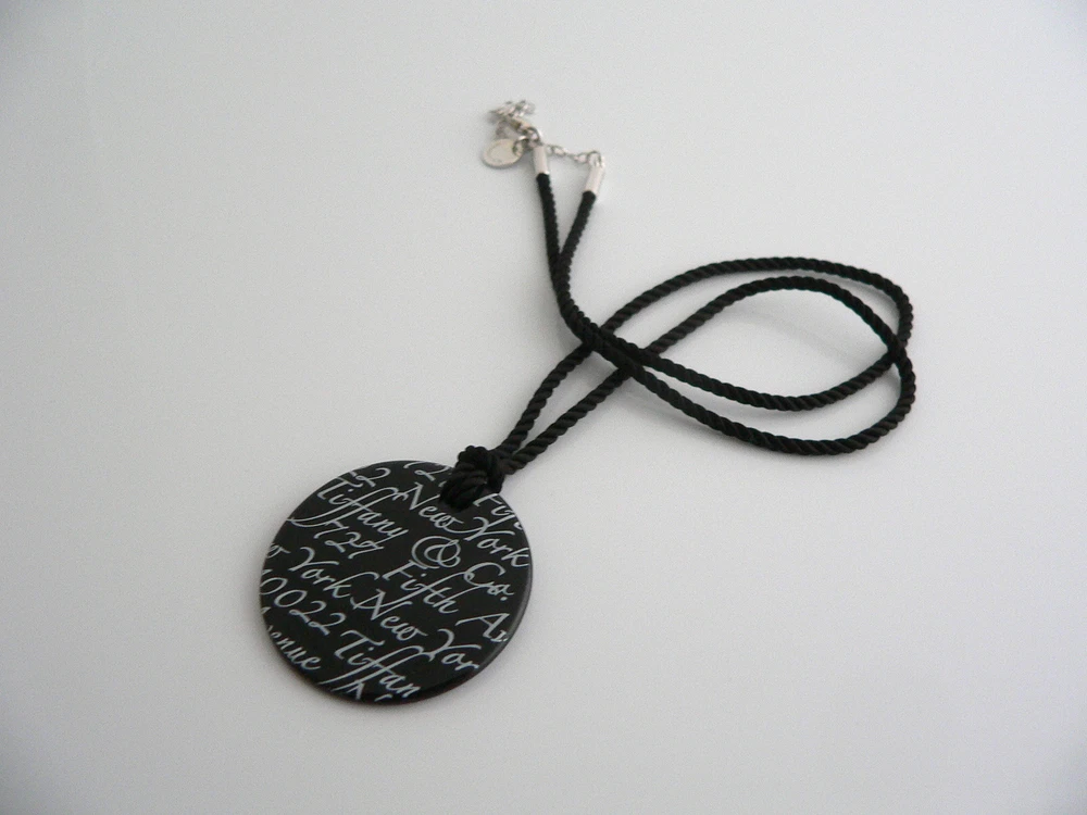 Overview: Have you been looking for an awesome Tiffany statement piece? No need to look any further - you just found it :) Offered for sale is a gorgeous and wonderful Tiffany and Co. Black Bone Notes Round Disc Necklace on a Silk Cord. Hanging from its extendable Tiffany silk cord is a gorgeous Black Bone Onyx Notes Circle pendant! Spectacular statement piece that adds the right touch of Tiffany style to any outfit! Wonderful necklace that fits a lifestyle on the go -- the necklace can be worn to almost any occasion! It is simple and yet looks extremely elegant. Imagine the piece with your professional office attire ... Now imagine it with jeans or weekend wear ... Perfect in every way! The item is very comfortable to wear, and is in excellent condition. A classic Tiffany piece to start or add to your collection. Both pendant and chain are fully hallmarked and guaranteed to be 100% authentic. Wonderful present for yourself or anyone you love! Will surely delight! Particulars: Size & Measurements: The pendant is 1.25 inches in diameter. The cord length is from 14.25 extendable to 16.25 inches (already knotted to the pendant) Metal & Hallmarks: Tiffany & Co. / 925 (circular tag on silk cord) T & Co. / Ireland (on pendant) Solid 925 sterling silver Please check out my other unique and interesting Tiffany items on sale.