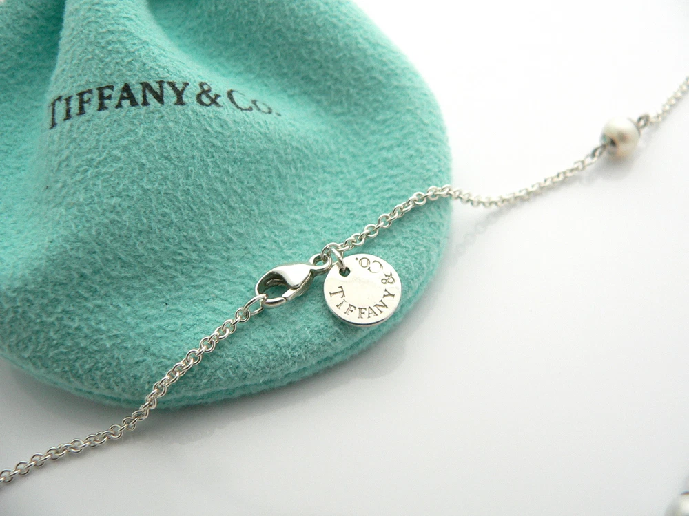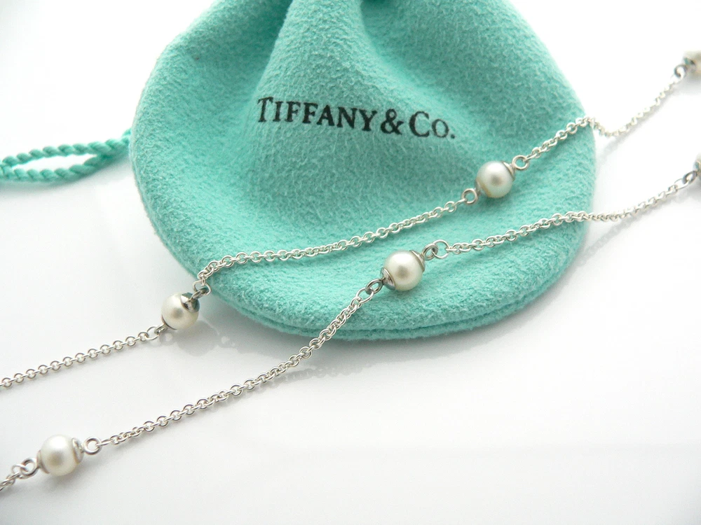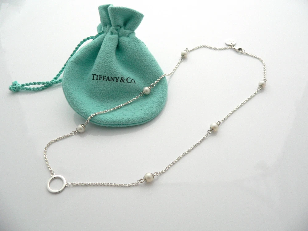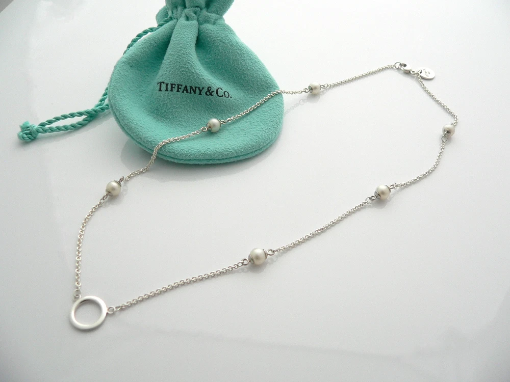 Overview: Everyone needs a Tiffany Pearl Necklace! Here is the one just for you. Offered for sale is a wonderful and gorgeous Tiffany & Co Pearls by the Yard Circle necklace. Definitely a Tiffany piece that you will get your money's value for. It works perfectly with pretty much any attire your put on, AND adds a nice feminine touch to it. The chain for this specific necklace is more substantial than others, yet the feel of the piece is still very delicate. It is a wonderful necklace that fits a lifestyle on the go -- the necklace can be worn to pretty much any occasion! It is simple, elegant, and classic all rolled into one necklace. The necklace works with a crisp open neck shirt, a pretty dress, or even a dark turtle neck come winter time (but let's not think of this right now :)). It is very comfortable to wear, and is in excellent condition. No longer in production, it is perfect for the Tiffany collector! It is a perfect Tiffany piece to start or add to your collection. As always, the item is hallmarked and guaranteed to be 100% authentic. It will come with its Tiffany pouch as shown! Perfect and ready for gifting! Wonderful present for yourself or anyone you love! Will surely delight! Particulars: Size & Measurements: The Gorgeous necklace is approx. 16 inches from end to end. Metal & Hallmarks: Tiffany & Co. / 925 Solid 925 sterling silver Please check out my other unique and interesting Tiffany items on sale.