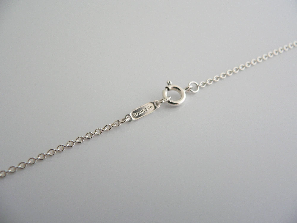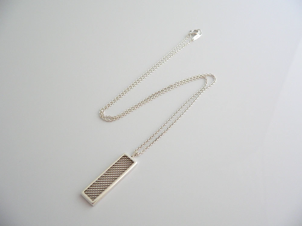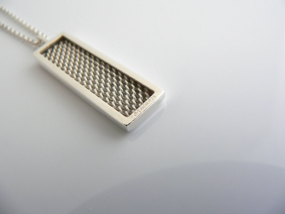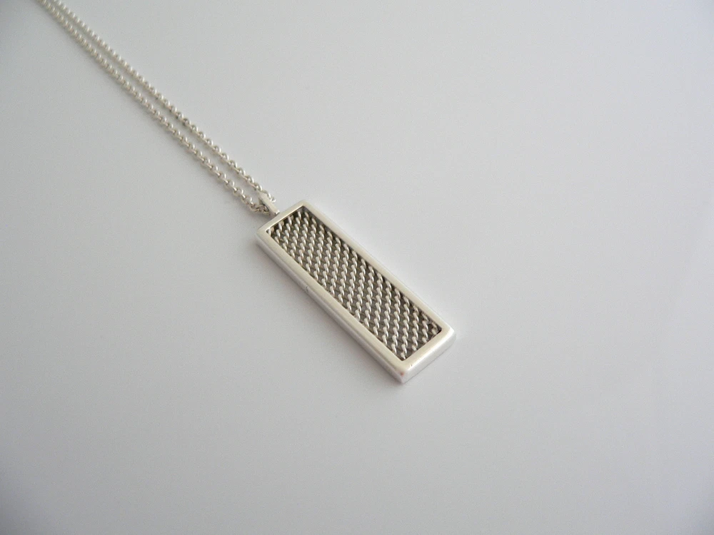 Overview: Everyone needs a Tiffany mesh necklace! Here is the one just for you. Offered for sale is a wonderful and gorgeous Tiffany & Co. Silver Rectangular Mesh Dangling necklace. Definitely a Tiffany piece that you will get your money's value for. It works perfectly with pretty much any attire your put on, AND adds a nice feminine touch to it. Hanging from its bright Tiffany curb chain is a Gorgeous and Cool Rectangular Mesh charm. It is a wonderful necklace that fits a lifestyle on the go -- the piece can be worn to pretty much any occasion! It is simple, elegant, and classic all rolled into one necklace. The necklace works with a crisp open neck shirt, a pretty dress, or even a dark turtle neck come winter time (but let's not think of this right now :)). It is very comfortable to wear, and is in excellent condition. It is a perfect Tiffany piece to start or add to your collection. As always, the item is hallmarked and guaranteed to be 100% authentic. Wonderful present for yourself or anyone you love! Will surely delight! Particulars: Size & Measurements: The chain is 18 inches from end to end. The Mesh pendant is approx. 1.25 inches. Metal & Hallmarks: Tiffany & Co. / 925 (on chain clasp) T & Co / 925 (on charm) Solid 925 sterling silver Please check out my other unique and interesting Tiffany items on sale.