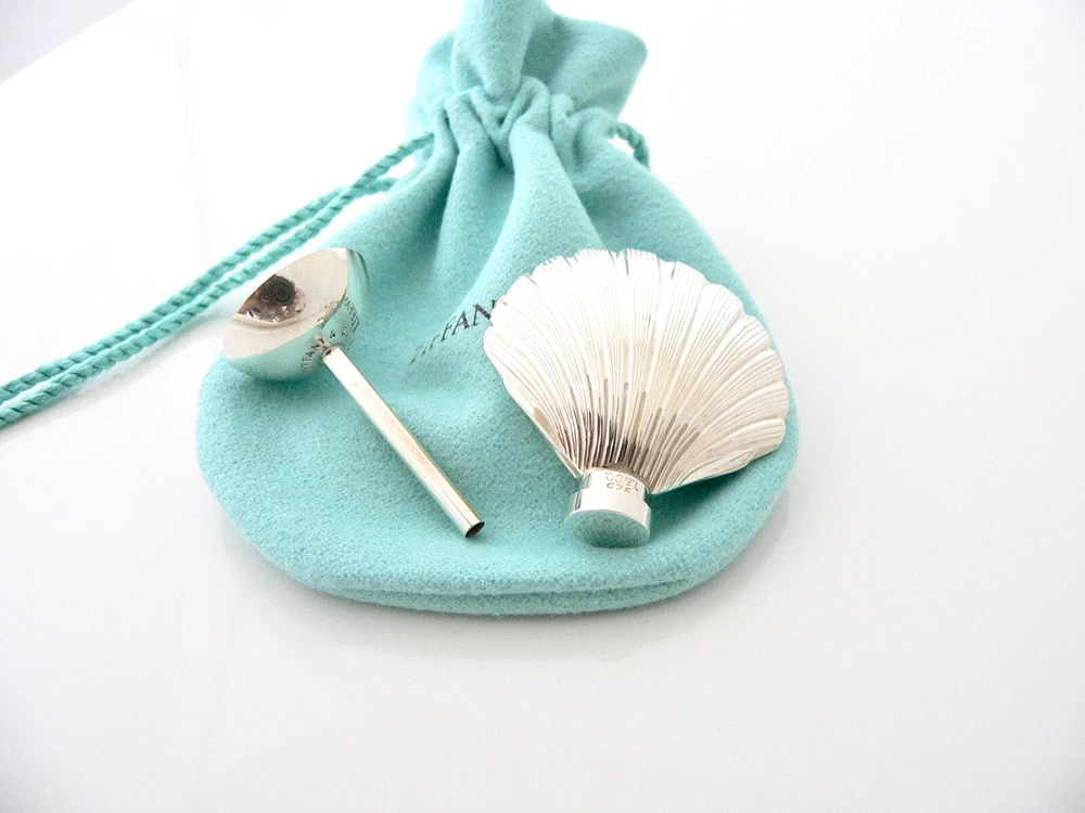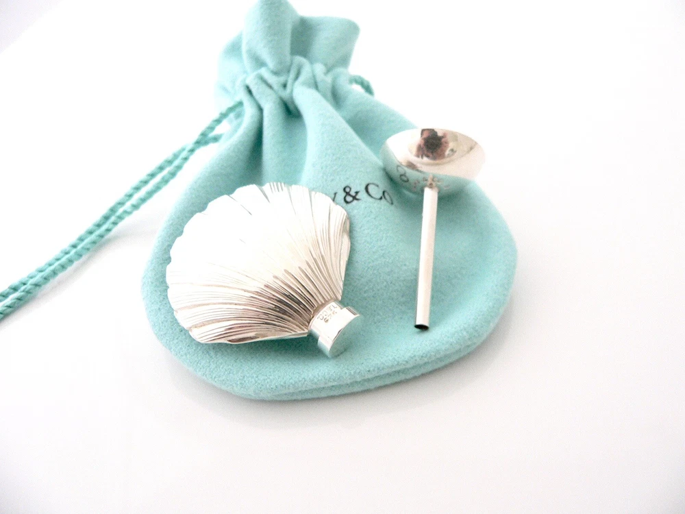 Overview: Offered for sale is a beautiful vintage Tiffany & Co. Sterling Silver Shell perfume bottle / dabber / funnel set. Super cool and unique Shell shaped perfume container. Definitely an amazing treasure to find! Very pretty and unique piece - you can use it as a perfume container, or just as nice piece to display since it is such a cool piece! It is almost like a work of art! Includes a Tiffany & Co. Sterling Silver funnel (of course :)) for easy filling of the perfume bottle! No longer in production, you will be one of the few that will have the fortune of owning this piece. Perfect for the Tiffany collector. As always, the item is fully hallmarked and guaranteed to be 100% authentic. It will come with its Tiffany pouch as shown! Wonderful present for yourself or anyone you love! Will surely delight! Particulars: Size & Measurements: The Shell Perfume Bottle is approx. 1.5 inches. Metal & Hallmarks: T & Co. / 925 (on Shell Perfume Bottle) Tiffany & Co / 925 (on Funnel) Solid 925 sterling silver Please check out my other unique and interesting Tiffany items on sale.