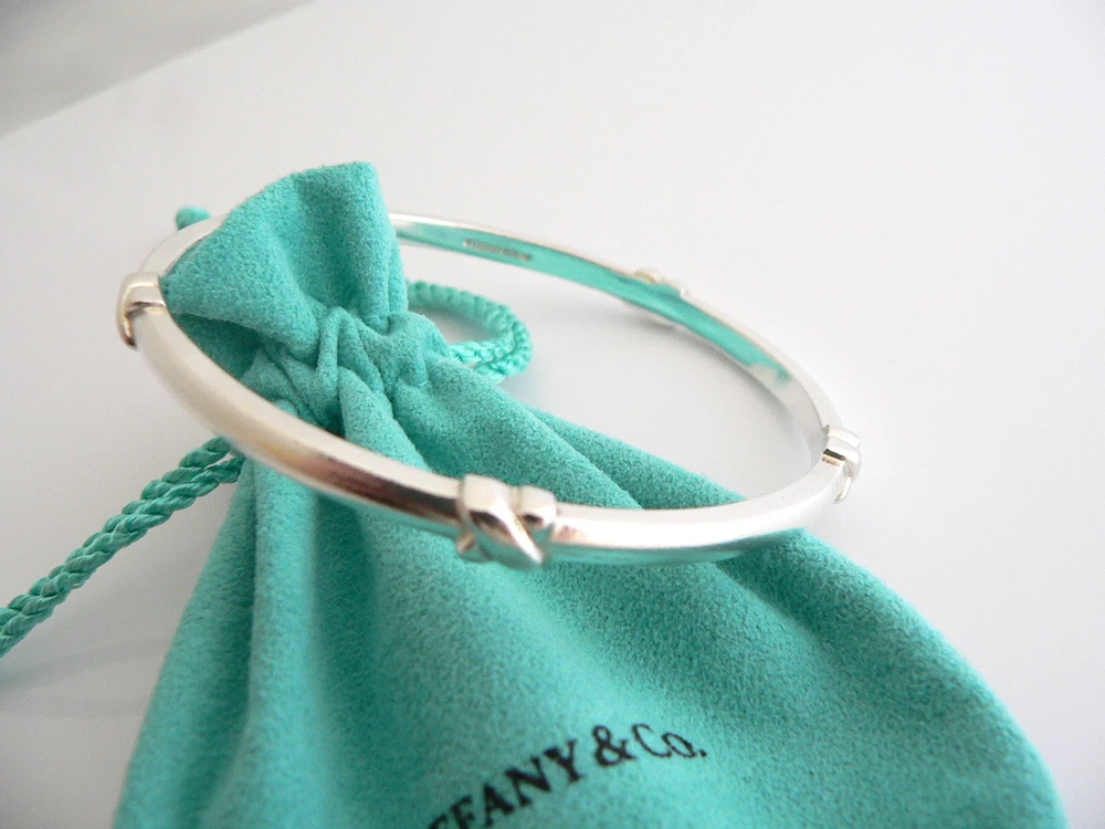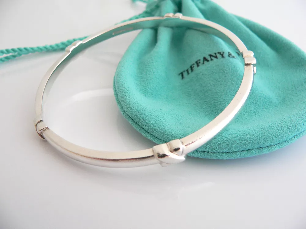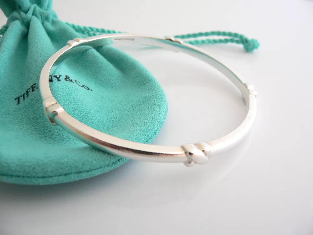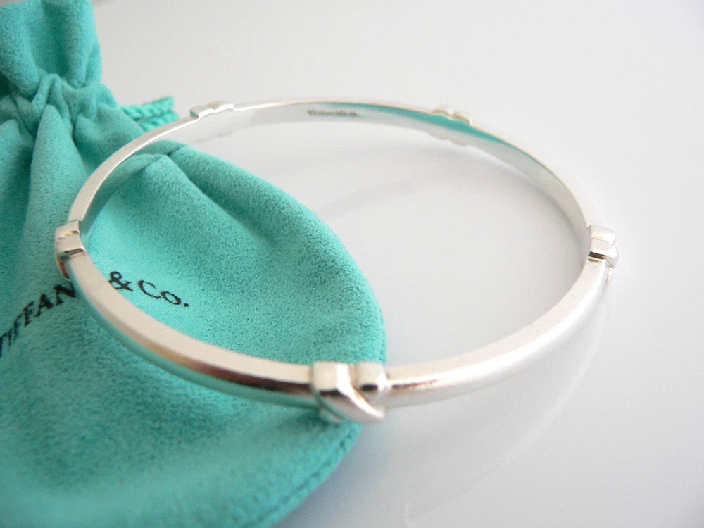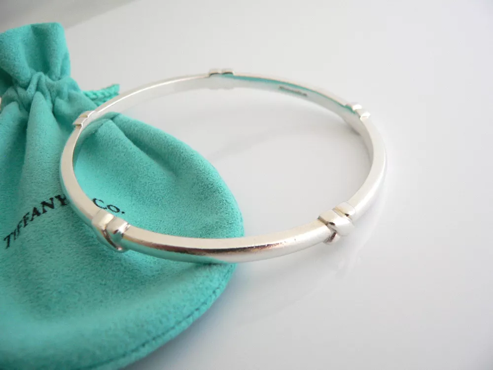 Overview: Everyone needs a signature Tiffany piece! Here is the perfect one just for you. Offered for sale is a wonderful and mint Tiffany & Co. Sterling Silver Signature Bangle. The piece is crafted from bright and substantial Tiffany silver, and yet retains a feminine and delicate feel to it. It is a wonderful bracelet that fits a lifestyle on the go -- can be worn to almost any occasion! It is simple, elegant, and classic all rolled into one item. Imagine the piece with your professional office attire ... Now imagine it with jeans or weekend wear ... Perfect way to add your Tiffany style to any outfit! The bangle is very comfortable to wear, and is in good condition. It is THE classic Tiffany piece to start or add to your collection. As always, the item is fully hallmarked and guaranteed to be 100% authentic. Wonderful present for yourself or anyone you love! Will surely delight! It will come with its Tiffany pouch as shown! Perfect and ready for gifting! The Blue / Pink / Black Enamel Signature Bangles are also available in a separate listing. Please have a look - The bangles look wonderful together! :) Particulars: Size & Measurements: The bangle's diameter is 2.55 inches. Metal & Hallmarks: Tiffany & Co. / 925 Solid 925 sterling silver Please check out my other unique and interesting Tiffany items on sale.
