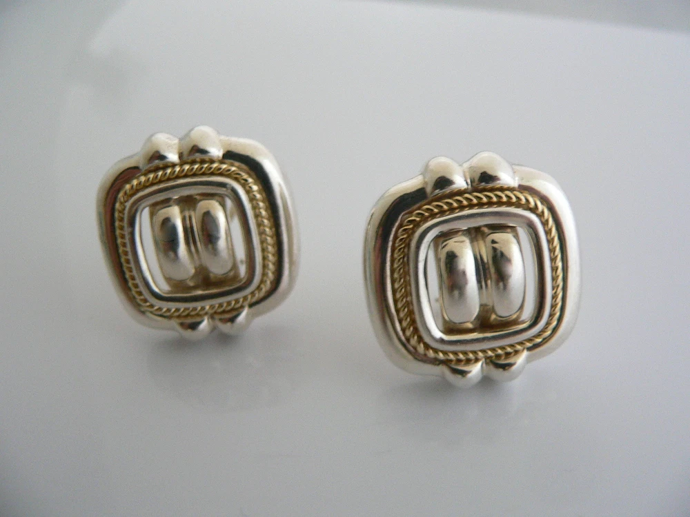 Overview: Time to pull your hair back and show off your awesome and gorgeous earrings! Offered for sale is a wonderful and very rare pair of Tiffany and Co. Sterling Silver and 18K Gold Square earrings. A very pretty pair that will certainly be a conversation starter! I am 100% sure you will get many compliments when you wear them, so be ready :) It is like wearing a piece of art - right on ears! Very versatile pair of earrings that works well with almost any outfit you put on. And beacuse it is two tone, it will go with pretty much any other piece of jewelry you already own! Imagine the piece with a nice sundress ... now imagine wearing it with jeans and a crisp white shirt ... or with your ultra chic cocktail dress ... Perfection! Certainly a wonderful treasure to find ... right here on Ebay! Great piece to start or add to your Tiffany collection. The earrings are fully hallmarked and is guaranteed to be 100% authentic. It will come with its Tiffany pouch as shown! Perfect and ready for gifting! Wonderful present for yourself or anyone you love! Will surely delight! Particulars: Weight: 25.4 grams Size & Measurements: The earrings are approx. 1 inch each. Metal & Hallmarks: Tiffany & Co. / 925 / 750 Solid 925 sterling silver and 18K gold Please check out my other unique and interesting Tiffany items on sale.
