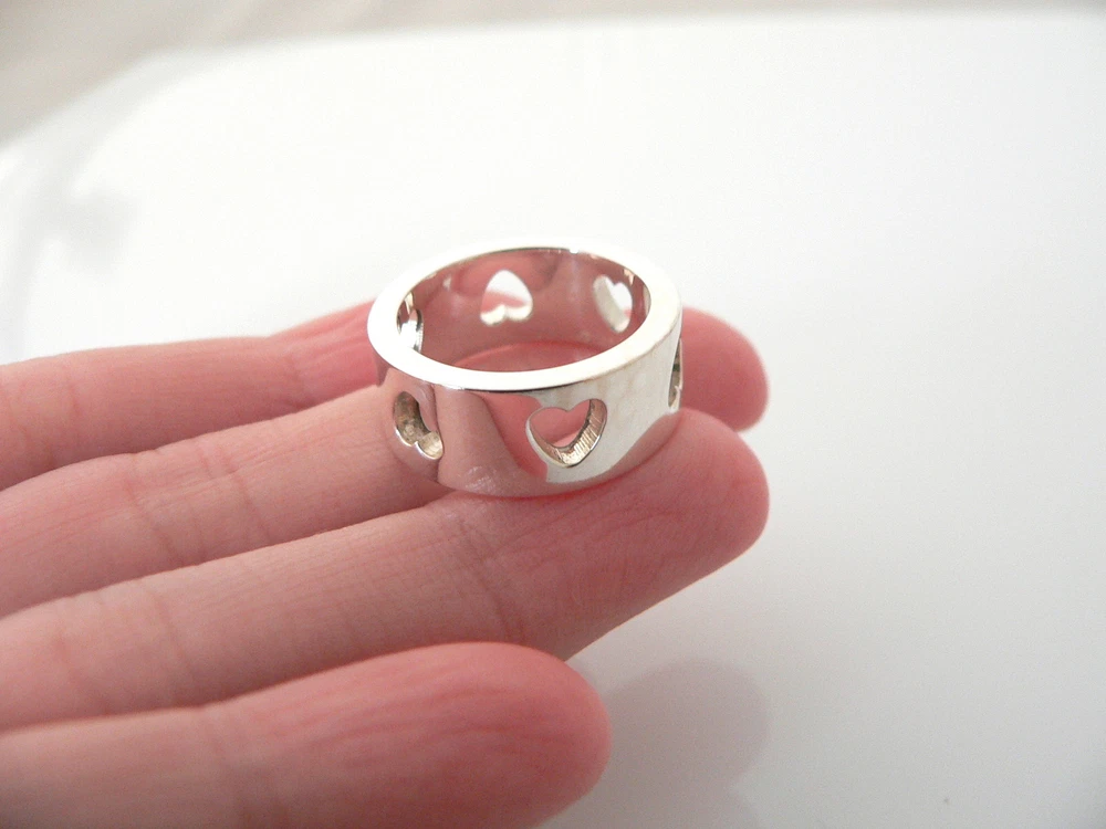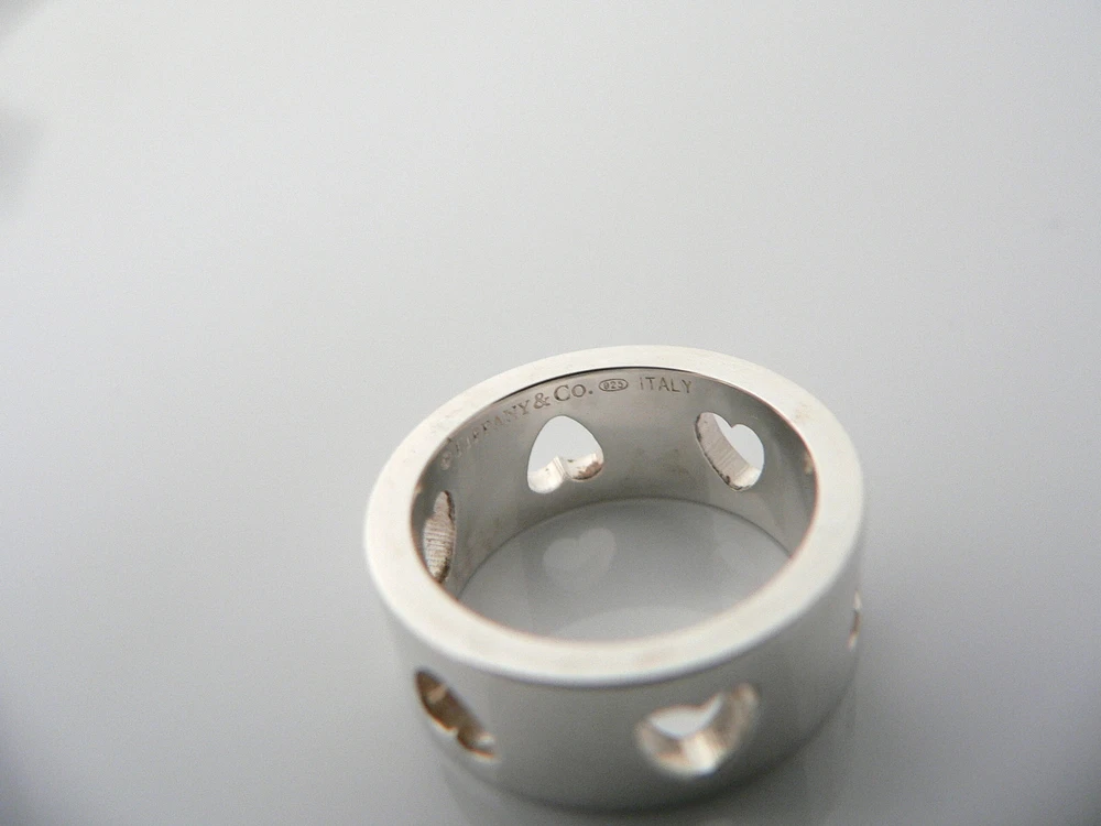 Here's the perfect cute little ring for you -- Also a great way to say "I love you" or I love me" :). Offered for sale is a gorgeous and rare Tiffany & Co Sterling Silver Stencil Cut Out Hearts ring. I am 100% positive that you will want to use it over and over again. Your friends will be fascinated by this gorgeous piece – it is almost like a work of art! The look of the piece is simple, playful, and very distinct. The ring is very comfortable to wear, and is in very good condition. It works with pretty much anything you put on … and adds a touch of Tiffany pizzazz to it! A perfect Tiffany piece to start or add to your collection. The ring is fully hallmarked and guaranteed to be 100% authentic. Wonderful present for yourself or anyone you love! Will surely delight! Particulars: Size & Measurements: The ring is a size 5.25 Metal & Hallmarks: Tiffany & Co. / 925 / Italy Solid 925 sterling silver Please check out my other unique and interesting Tiffany items on sale.