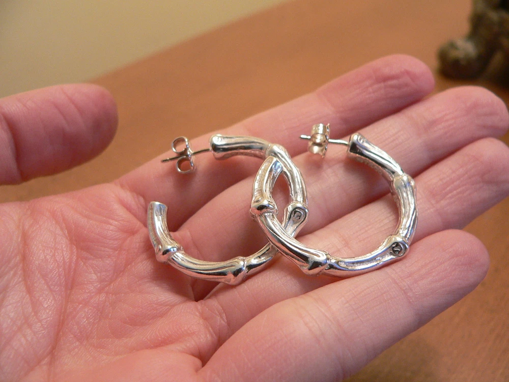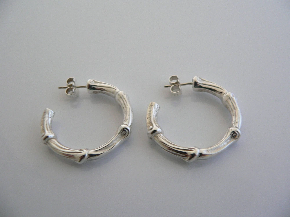Overview: Offered for sale is a gorgeous and rare Tiffany & Co Sterling Silver Large Nature Bamboo earrings. Made from solid and bright Tiffany silver, yet maintains its delicate and feminine feel! Looks and feels wonderful on your ears. I am 100% positive that you will want to use yours over and over again as well. Your friends will be fascinated by this gorgeous piece – it is almost like a work of art! The look of the piece is simple, classic, and very elegant. The pair works with pretty much anything you put on … and adds a touch of pizazz to it! The pair is in excellent condition! A perfect and rare Tiffany piece to start or add to your collection. The earrings are fully hallmarked and guaranteed to be 100% authentic. Wonderful present for yourself or anyone you love! Will surely delight! Particulars: Size & Measurements: The earrings are approx. 1.1 inch each. Metal & Hallmarks: T & Co. / 1996 / 925 Solid 925 sterling silver Please check out my other unique and interesting Tiffany items on sale.