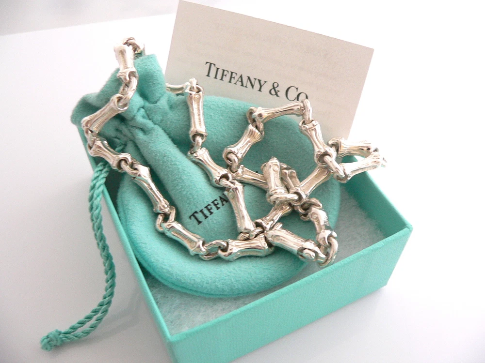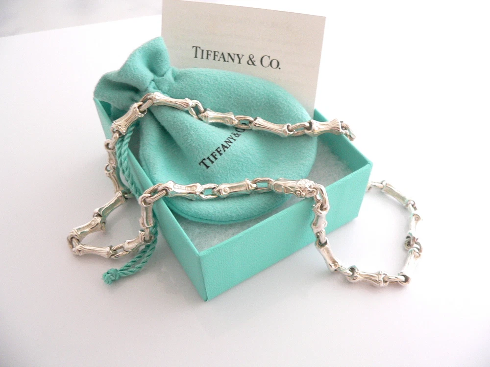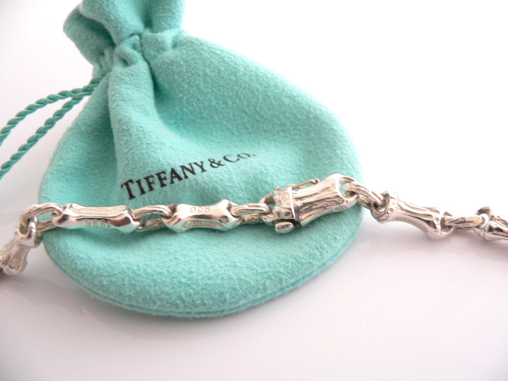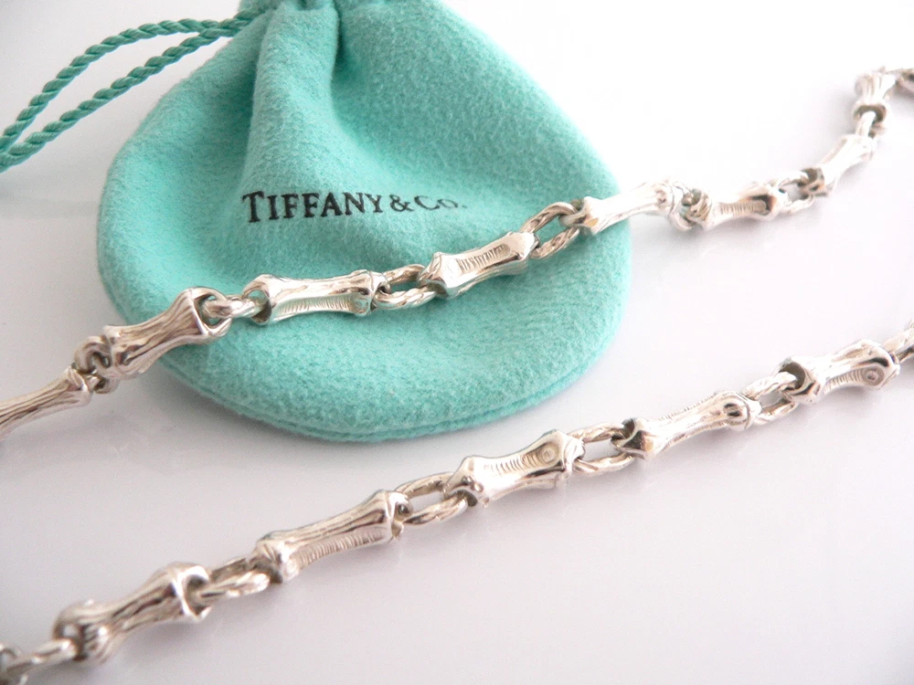 Overview: Offered for sale is a gorgeous and rare Tiffany & Co Sterling Silver Bamboo Link (19 Inch) chain necklace. Made from solid and bright Tiffany silver, yet maintains its delicate and feminine feel! Looks and feels wonderful, I am 100% positive that you will want to use it over and over again. Your friends will be fascinated by this gorgeous piece – it is almost like a work of art right on your neck! The look of the piece is simple, classic, and very elegant. The necklace is super elegant and chic; it works with pretty much anything you put on … and adds a touch of Tiffany style and pizazz to it! A perfect and rare Tiffany piece to start or add to your collection. The necklace is fully hallmarked and guaranteed to be 100% authentic. It will come with its Tiffany pouch, box, and sterling care card as shown! Perfect and ready for gifting! Wonderful present for yourself or anyone you love! Will surely delight! Particulars: Size & Measurements: The necklace is 19 inches long. Metal & Hallmarks: 1996 / T & Co. / 925 Solid 925 sterling silver Please check out my other unique and interesting Tiffany items on sale.