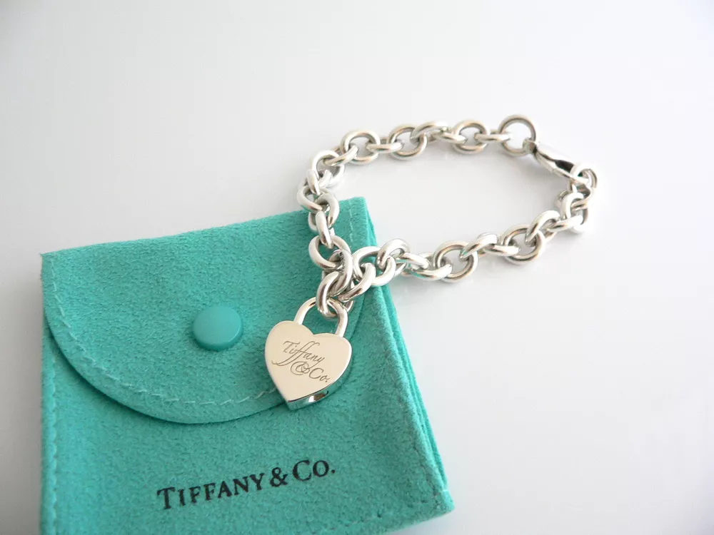 Offered for sale is a wonderful and rare Tiffany and Co. Sterling Silver Notes Heart Padlock bracelet. The piece is made from substantial and bright Tiffany silver, and yet retains a very feminine feel to it. Attached to its very substantial Tiffany Silver charm bracelet is a Heart padlock charm with "Tiffany & Co" written in beautiful script. The Notes Heart padlock charm can be removed from the bracelet, and thus can be used as a pendant on a necklace or placed on another charm bracelet! Super versatile! It is a classic Tiffany piece that will most certainly be a piece that you will be used over and over again, so it is great value for the money! It is a wonderful piece that fits a lifestyle on the go -- the bracelet can be worn to almost any occasion! It is versatile, elegant, and classic all rolled into one. Imagine the piece with your professional office attire ... Now imagine it with jeans or weekend wear ... Perfect! The bracelet is in very good to excellent condition. As always, both the charm bracelet and padlock charm are fully hallmarked and guaranteed to be 100% authentic. It will come with its Tiffany pouch as shown! Perfect and ready for gifting! Wonderful present for yourself or anyone you love! Will surely delight! Particulars: Size & Measurements: The bracelet is approx. 7.45 inches from end to end. Metal & Hallmarks: T & Co. / 925 (middle link of chain) Tiffany & Co / 925 (on padlock charm) Solid 925 sterling silver Please check out my other unique and interesting Tiffany items on sale.