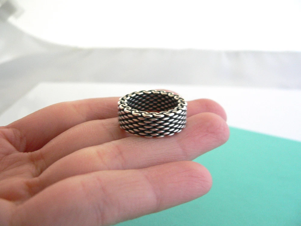 Overview: Offered for sale is a very pretty and mint Tiffany and Co. sterling silver Oxidized mesh ring. A very nice, bold piece that will certainly be a conversation starter! Adds just that touch of Tiffany style to any outfit! It is very versatile, comfortable to wear, and is in excellent / mint condition. Will work well with almost any outfit you put on - imagine the piece with a nice sundress ... now imagine wearing it with jeans and a crisp white shirt ... Perfection! Makes a great stacking ring as well! Great piece to start or add to your Tiffany collection. The ring is fully hallmarked and is guaranteed to be 100% authentic. Wonderful present for yourself or anyone you love! Will surely delight! Particulars: Size & Measurements: The ring is a size 5 Metal & Hallmarks: T & Co. / 925 Solid 925 sterling silver Please check out my other unique and interesting Tiffany items on sale.