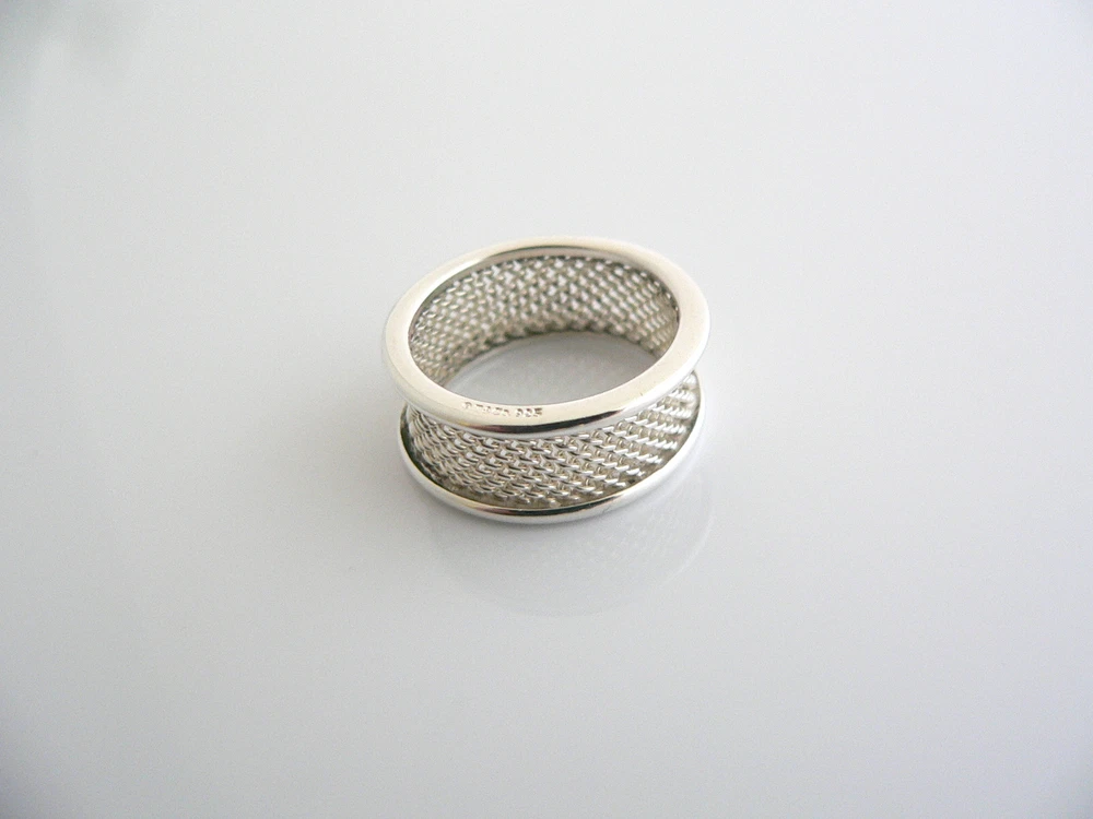 Overview: Offered for sale is a very pretty and mint Tiffany and Co. sterling silver narrow mesh ring. A very nice, bold piece that will certainly be a conversation starter! It is very versatile, comfortable to wear, and is in very good condition. Will work well with almost any outfit you put on - imagine the piece with a nice sundress ... now imagine wearing it with jeans and a crisp white shirt ... Perfection! Makes a great stacking ring as well! Great piece to start or add to your Tiffany collection. The ring is fully hallmarked and is guaranteed to be 100% authentic. Wonderful present for yourself or anyone you love! Will surely delight! Particulars: Size & Measurements: The ring is a size 5 Metal & Hallmarks: T & Co. / 925 Solid 925 sterling silver Please check out my other unique and interesting Tiffany items on sale.