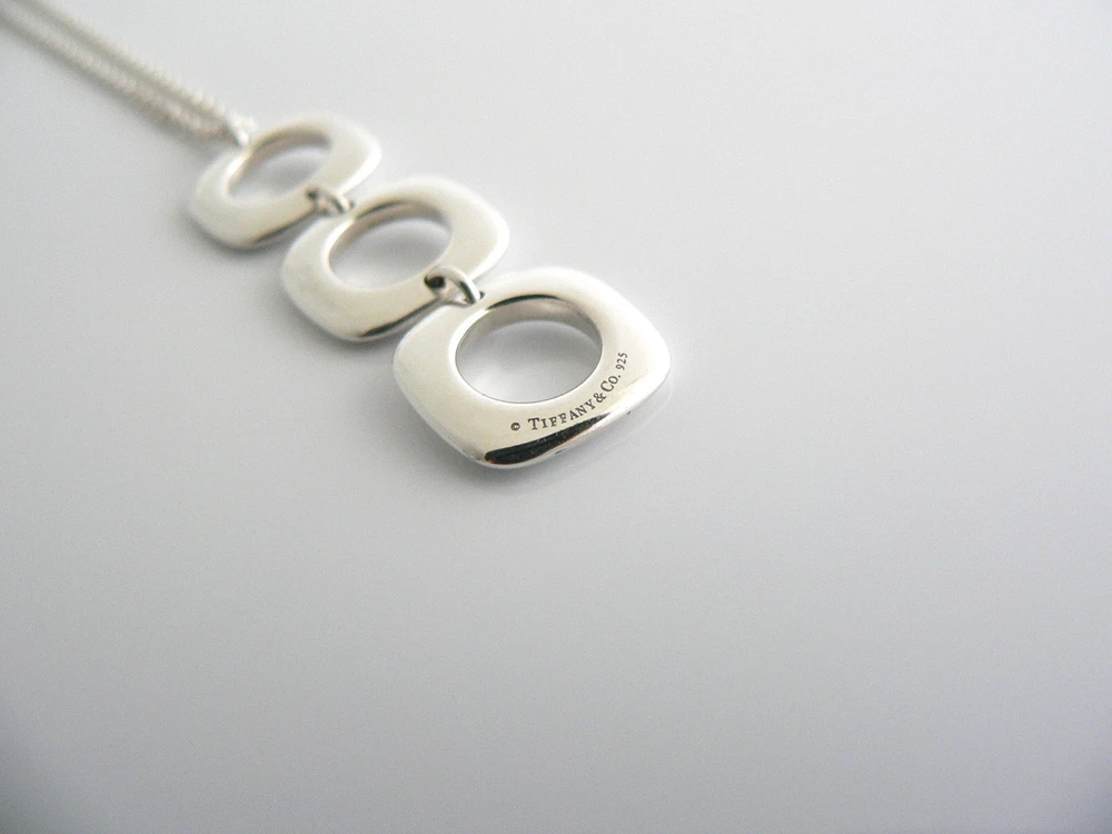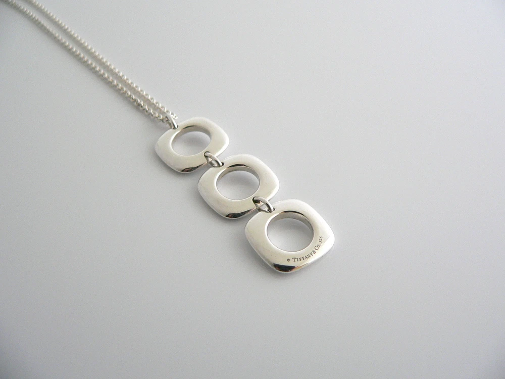 Overview: Offered for sale is a wonderful Tiffany classic. Whether you are just starting your Tiffany collection or are thinking of adding another piece, this one is perfect for you. Tiffany & Co.'s Dangling Cushion necklace is a Tiffany classic that will never go out of style. The piece makes a statement in its own subtle/simple way. It will most certainly be a piece that you will turn to over and over again, making it great value for your money. It is a wonderful necklace that fits a lifestyle on the go -- the necklace can be worn to almost any occasion! It is simple, elegant, and classic all rolled into one necklace. Imagine the piece with your professional office attire ... Now imagine it with jeans or weekend wear ... Very cool in every way! Looks just like a piece of modern art hanging from your neck - without the huge price tag of an art piece :) The item is very comfortable to wear, and is in great condition. Both pendant and chain are fully hallmarked and guaranteed to be 100% authentic. Wonderful present for yourself or anyone you love! Will surely delight! Particulars: Size & Measurements: The chain is approx. 16 inches from end to end. The pendant hangs 1.5 inches from the chain. Metal & Hallmarks: Tiffany & Co. / 925 (on pendant and chain) Solid 925 sterling silver Please check out my other unique and interesting Tiffany items on sale.