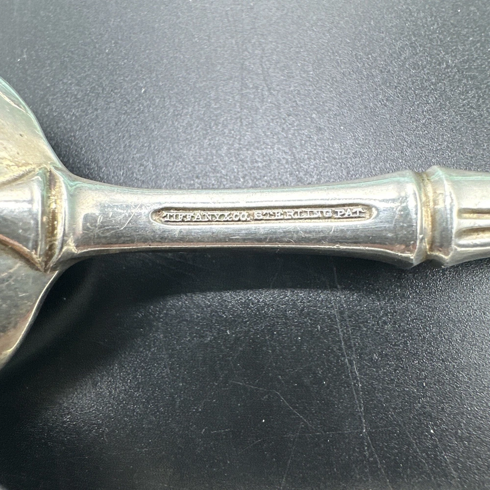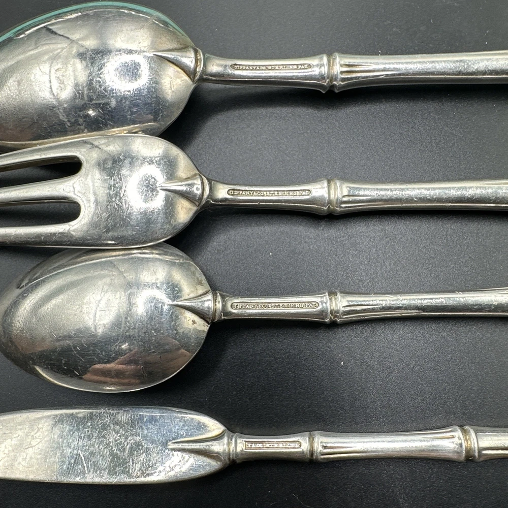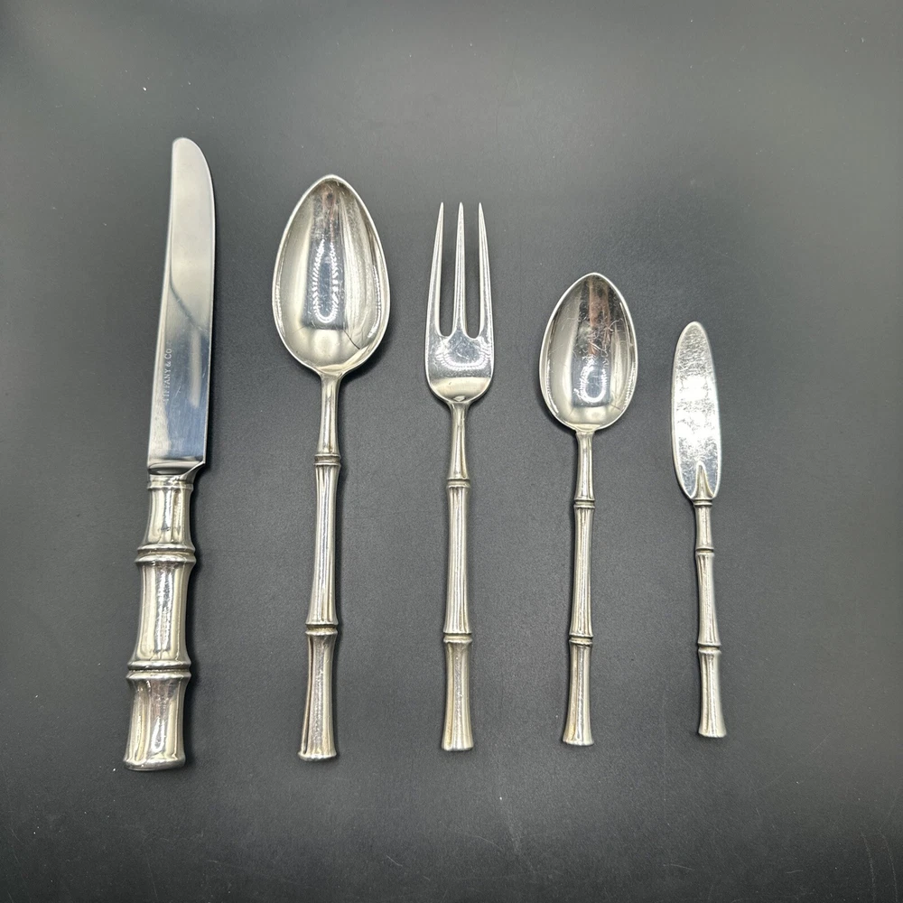 Elevate your dining experience with this exquisite 5-piece flatware set from Tiffany & Co. Crafted from sterling silver, this set features a stunning bamboo pattern that adds a touch of elegance to any table setting. The set includes a knife, butter knife, fork, teaspoon, and dessert spoon, all of which are expertly crafted with the finest materials. The Tiffany & Co. sterling silver flatware set is perfect for any occasion, whether you're hosting a formal dinner party or enjoying a casual meal with family. The set is post-1940 and has been crafted with an aesthetic movement style, making it a timeless addition to any collection. Add this beautiful set to your collection today and enjoy the luxury and elegance of Tiffany & Co.