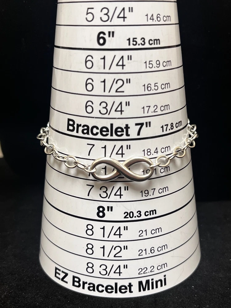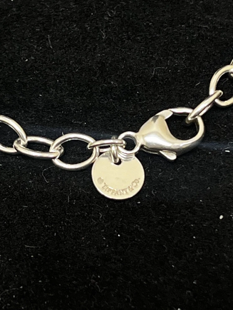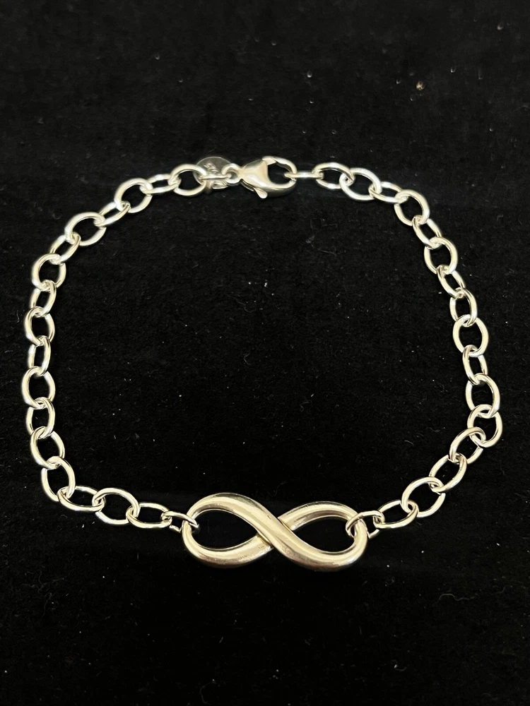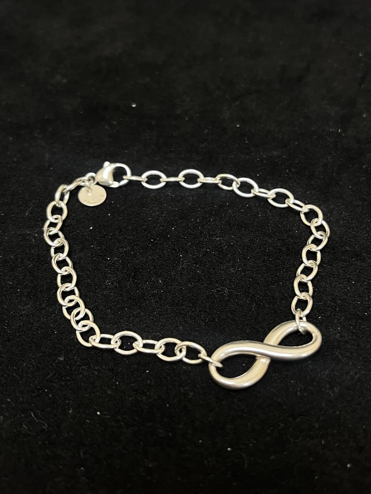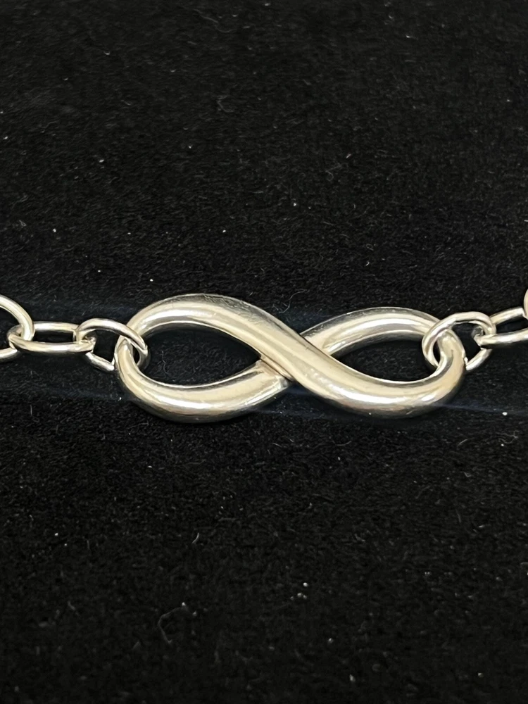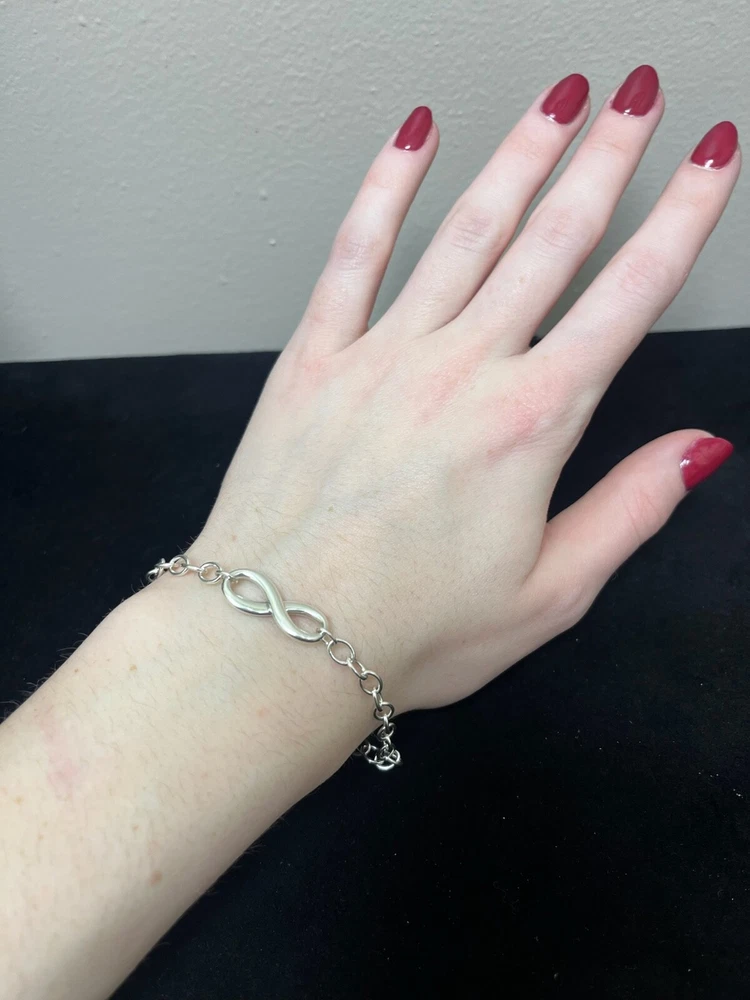 THIS IS A TIFFANY AND CO. STERLING SILVER INFINITY BRACELET. IT HAS A LARGE INFINITY CHARM IN THE MIDDLE AND ON THE OPPOSITE END, A LOBSTER CLAW CLASP WITH A CIRCULAR TAG STAMPED “TIFFANY AND CO.” AND “AG 925”. THERE IS MINIMAL WEAR TO THIS PIECE. PLEASE SEE PHOTOS BEFORE YOU PURCHASE.