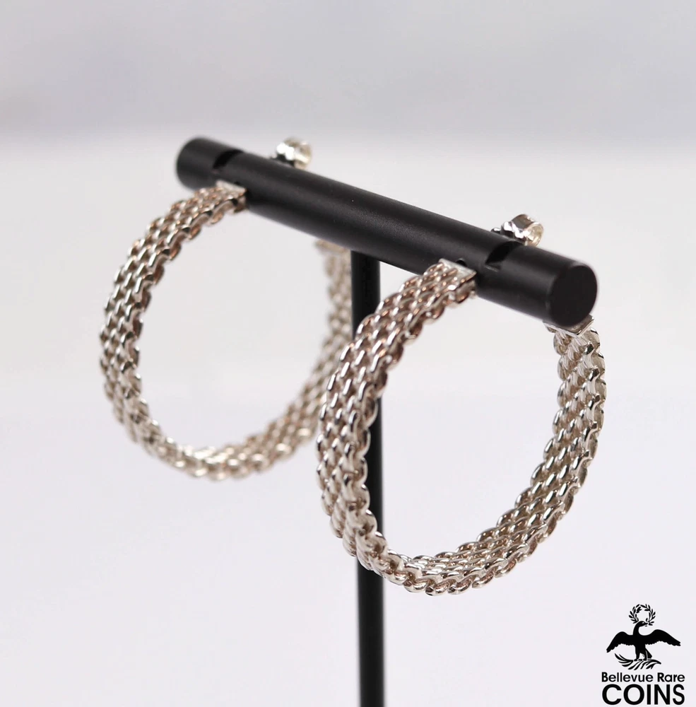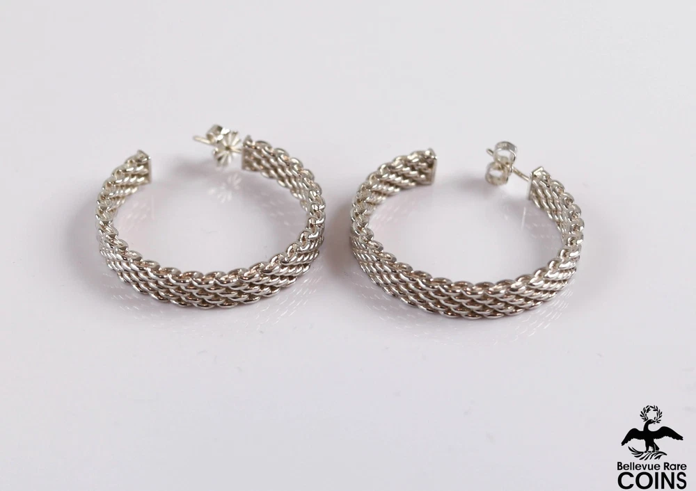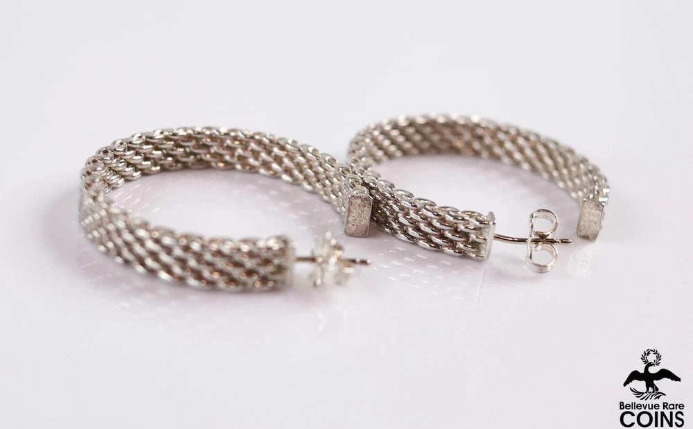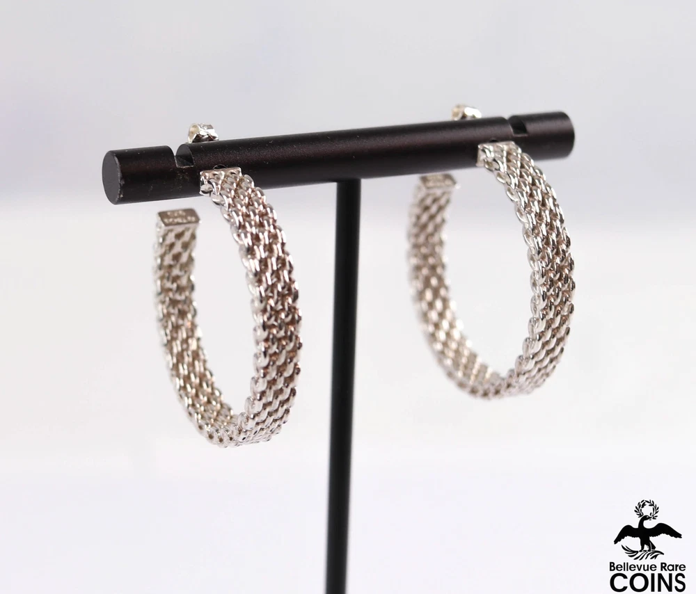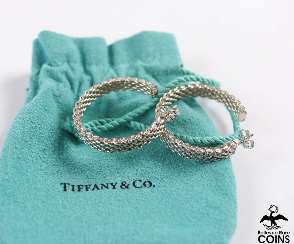 Tiffany & Co. Sterling Silver Mesh Weave Large Hoop Earrings w/Pouch Tiffany & Co. Sterling Silver Mesh Weave Large Hoop Earrings w/Pouch *Tiffany & Company is a worldwide name and elite jewelry company that spans almost 200 years old, with many artist and designer pieces that are sure to stun and captivate. Luxury and style are captured in every piece! *Specifications: Metal: Sterling .925 Silver Total Weight: 11.7 grams Length x Width: 32mm x 5mm (each earring) *Please SEE PHOTOS for condition. If you should have any questions or concerns, please feel free to message us Monday - Friday 9:00am - 5:00pm via ebay’s “Ask question” button below. We add hundreds of new coin and bullion listings weekly. We encourage you to check out our other listings and our eBay auctions! Click Here To See All Bellevue Rare Coins Gold Bullion L istings Shipping & Returns: $4.00 USPS Ground Advantage shipping within the United States, unless otherwise noted in listing. Shipping and Handling: Domestic Shipments - Bellevue Rare Coins provides $4.00 United States Postal Service (USPS) Ground Advantage shipping with tracking for all shipments within the United States, unless otherwise specified. International Shipments - All International orders are shipped via eBay's International shipping program. International Shipping and handling fees will be determined at check out. Please contact us for shipment fee estimates. Combined Shipping - Bellevue Rare Coins offers combined shipping for domestic buyers who have won multiple auctions. We will send out updated invoices with discounted shipping costs on Monday mornings. Please wait until you receive the updated invoice from us to make your payment. We do not offer combined shipping for International Buyers. Return Policy - Bellevue Rare Coins has a 30-calendar day return policy. All returns must be shipped within 30 calendar days of receiving the product. All returned items must be in their original packaging. All return requests must be made within 30 calendar days of customer receiving the merchandise. When returning merchandise, please include the item number, as this will expedite the refund process. Bullion Returns - Customer may (at Bellevue Rare Coins' discretion) be required to pay for any market loss on their returns. Any market gain on refunds shall remain the property of Bellevue Rare Coins. Listing Information: Product Photography - Bellevue Rare Coins does not use stock photos. Items in our listings have been photographed by our team in-house, so you can trust that you're making an informed purchase, ensuring transparency and authenticity. Messages - We greatly value your messages and are committed to responding to your questions and inquiries as promptly as we can. Nevertheless, please understand that immediate responses may not always be possible. Kindly note that we are unable to respond to messages on weekends, but we assure you that your inquiries are important to us, and we will get back to you during our working hours as soon as possible. About Bellevue Rare Coins Bellevue Rare Coins is a family-owned and operated business who have been proudly offering their services since 1979. We are the leading rare coin and currency dealer in the Greater Seattle Area who also specialize in jewelry and estate items. We are focused on delivering a simpler experience to our customers. Providing a reputation that dramatically affects our consumers in a positive way. We ensure that our clients always feel welcome and valued.