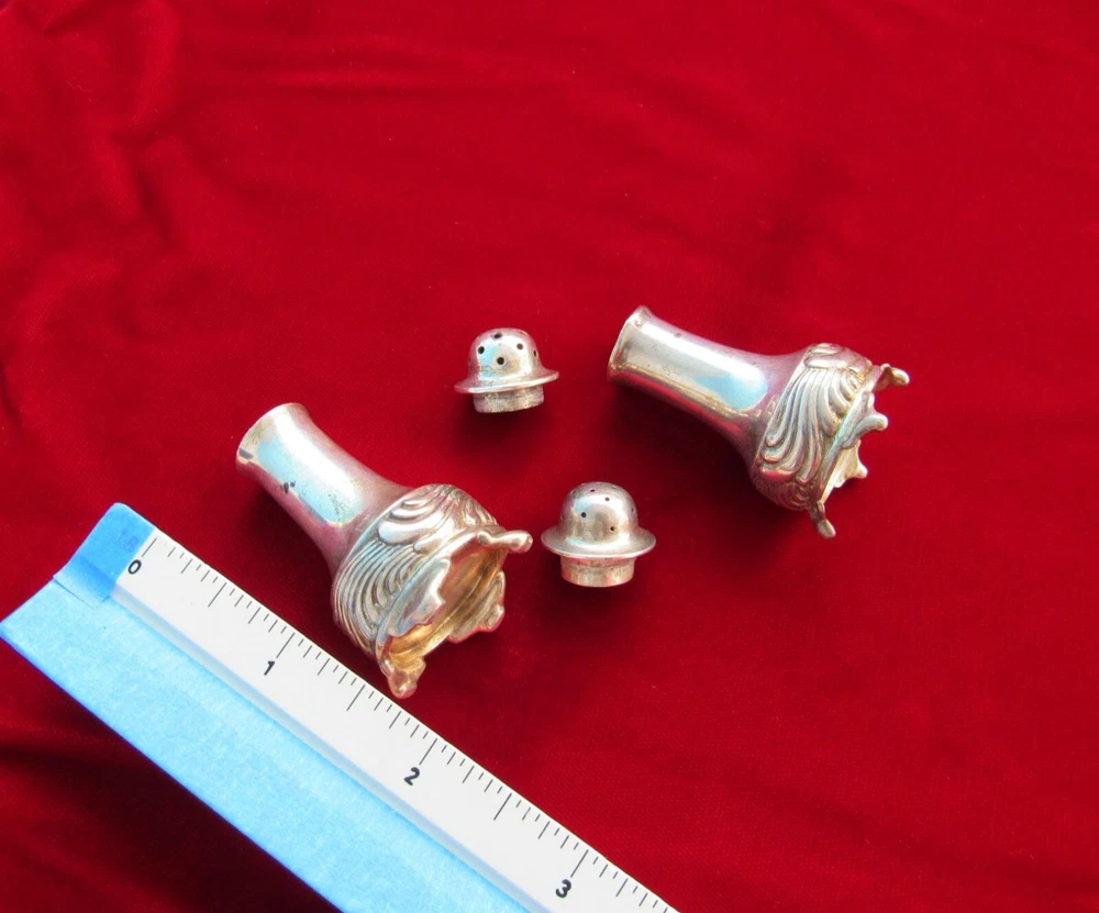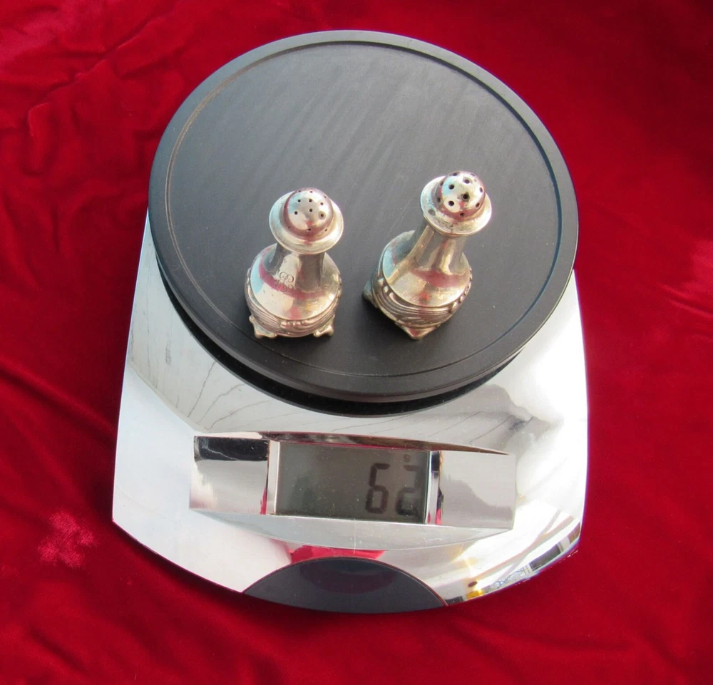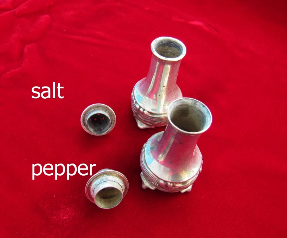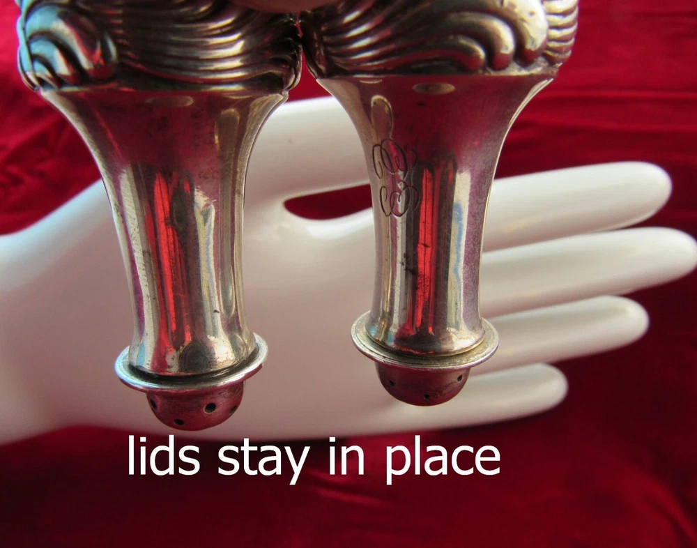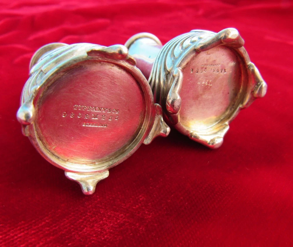 Heavy-gauge sterling salt & pepper shaker set for an individual diner's place setting in the Wave Edge pattern of 1884 This rare set is early production having been made 1884-1890 under directorship of Edward Moore (see "M" mark). These are in antique unpolished condition & no monogram removal. Tiffany & Co. designed the shakers distinguishable each from the other by hole size in lids and by foot design so the user knew what each shaker contained. Size 2 1/4 inches tall x 1 1/8 wide Weight 62g (empty of course) Interlocking script "EC" monogram From non-smoking home I insure & pack securely against damage in transit. Check my other listings & my feedback - satisfaction all around! PRICE was reduced Dec14. If does not sell by Dec18, listing may be ended. Available to lower 48 states only.