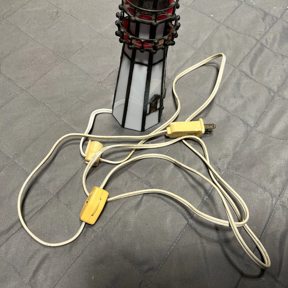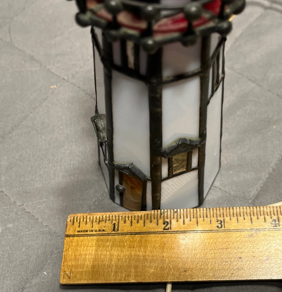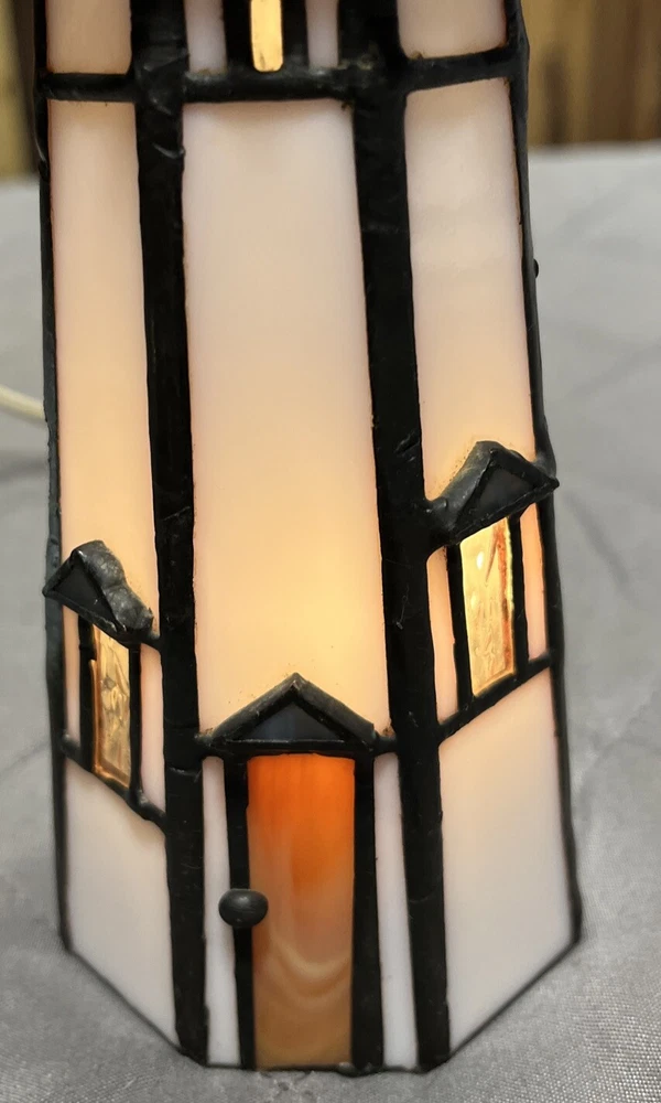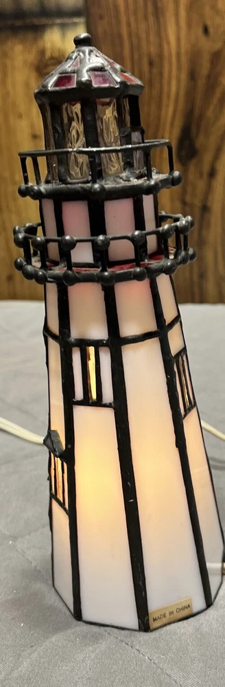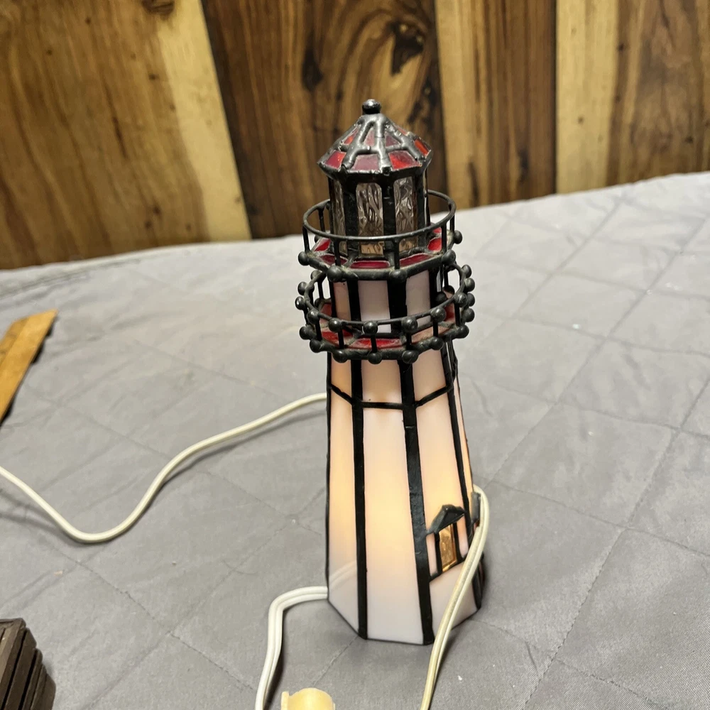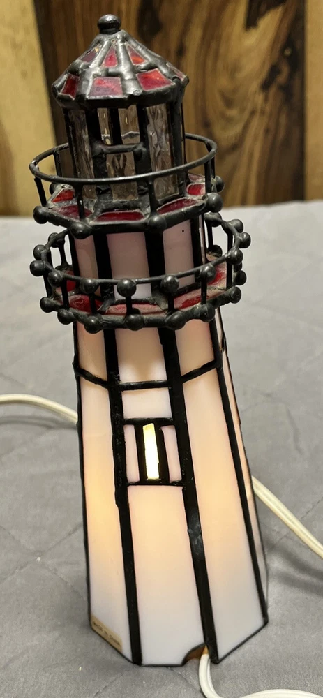 This charming night light will add a touch of coastal elegance to any room in your home. Crafted from high-quality stained glass and modeled after a classic lighthouse design, this piece is a licensed reproduction from the 1990s. The intricate detailing and multicolor hues make it a unique and eye-catching addition to your collection. Powered by corded electricity, it is both functional and beautiful.