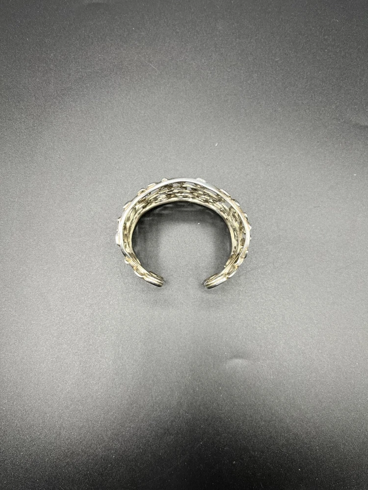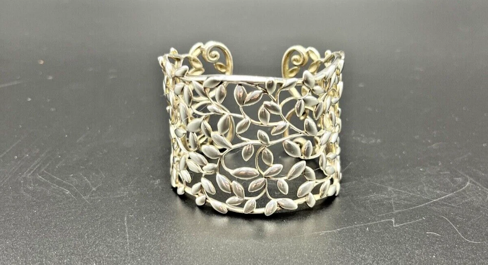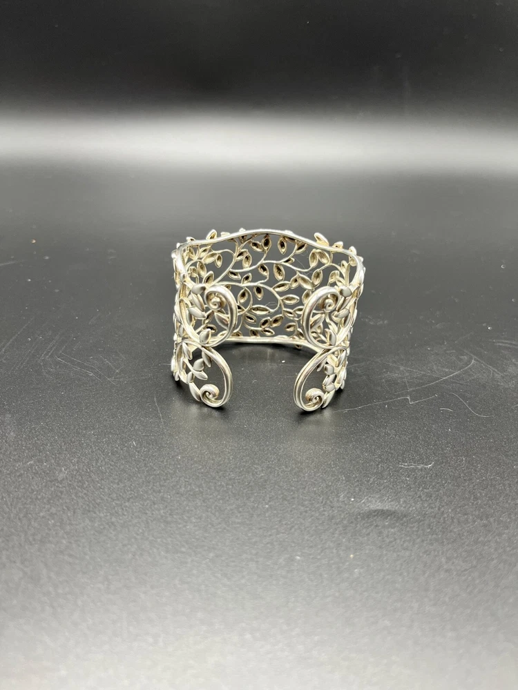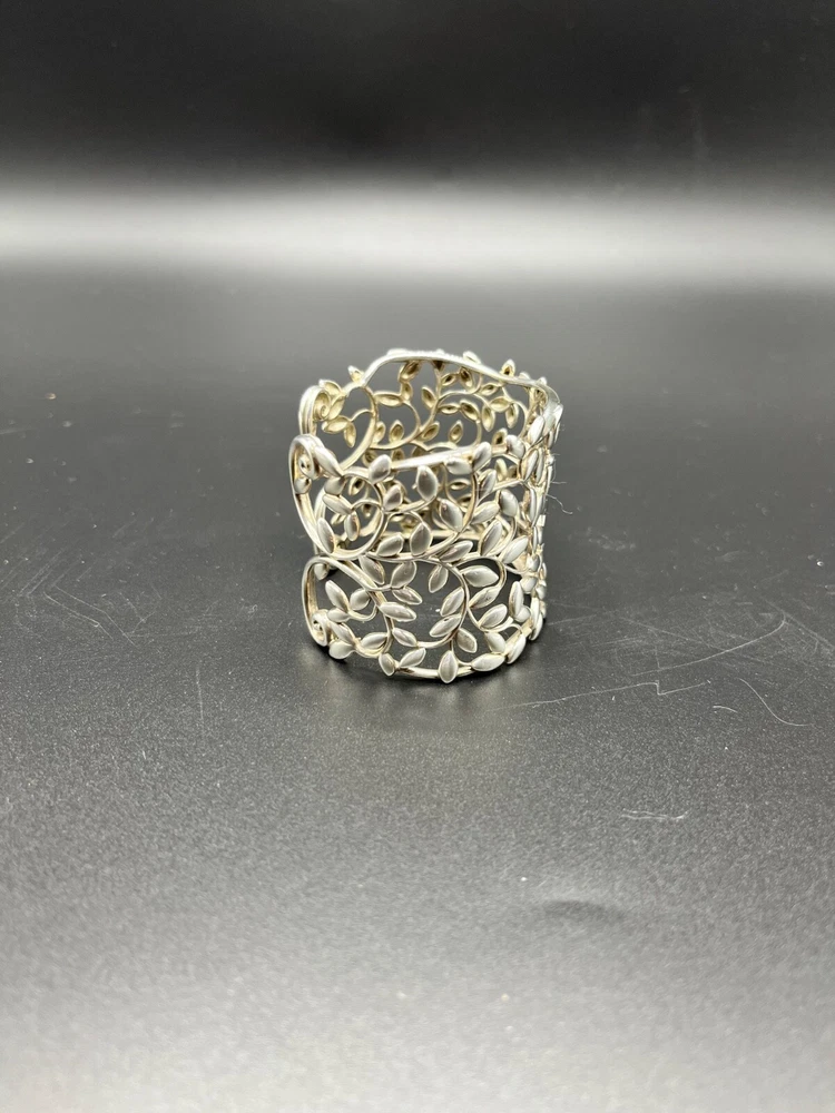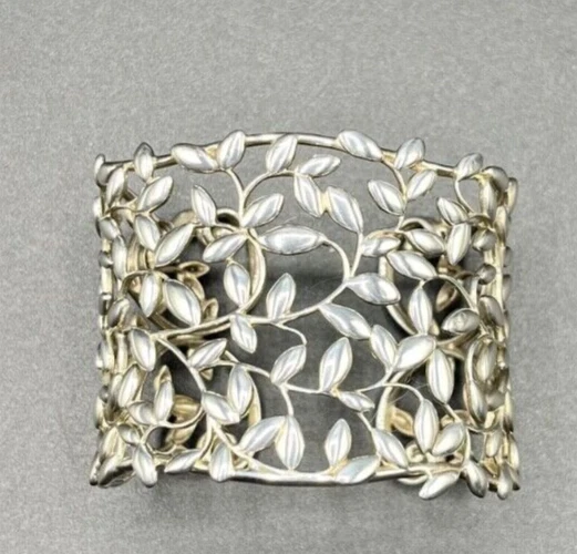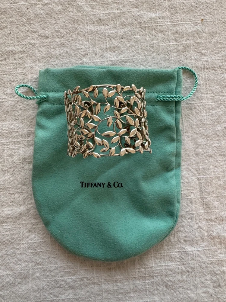 The Tiffany's Paloma Picasso® Olive Leaf Cuff is a bracelet made by Tiffany & Co. It is a cuff-style bracelet made of sterling silver with a leaf shape and a peace theme. The bracelet is designed by Paloma Picasso and is part of the Tiffany & Co. Paloma Picasso collection. The bracelet is silver in color and is size small, but it is resizable. Currently selling for $1,900! The cuff is almost 2" thick and comes with Tiffany's signature blue pouch. Product number: 60021868