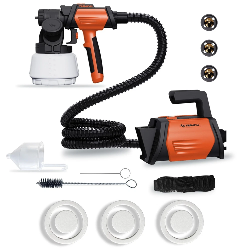Tilswall Shark 800 Spray Gun, featuring a stunning new design that combines aesthetics with power. Equipped with an 800W high-efficiency motor, it delivers a spray volume of 1200mL/min, significantly enhancing work efficiency. With a maximum spray viscosity of 120 din-S, it's compatible with a wide range of oil-based and water-based paints. The gun's modular design, along with a convenient strap, minimizes hand fatigue, making spraying tasks much easier. A 2.5-meter air hose and 3-meter power cord expand your working radius, providing greater flexibility during operation. Additionally, it comes with durable brass nozzles in sizes 1mm, 1.5mm, 2mm, and 3mm, allowing you to choose from horizontal elliptical, vertical elliptical, or circular spray patterns to meet various application needs. Whether for professional jobs or DIY projects, the Tilswall Spray Gun is your perfect companion! 【Innovative Side Feed】The Tilswall Shark 800W paint spray gun improves the way you add paint. You can easily add paint from the side without turning the paint can, so you can make the most of every drop of paint easily and efficiently 【4 Nozzles and 3 Spray Modes】This electric paint spray gun is equipped with 4 brass nozzles (1mm/1.5mm/2mm/3mm). The larger ones are suitable for painting large areas and the smaller ones are used for detail work. It also offers 3 spray modes: horizontal oval, vertical oval and round. Ideal for spraying on fences, furniture, cabinets, garden tables and chairs, etc 【98in Hose + 118in Power Cord】The Tilswall 800w paint spraying system has a split head and main body design and an auxiliary strap to minimize the weight of the handpiece and facilitate spraying work. The included 2.5m hose and 3m power cord effectively increase the operating radius, making spraying movements more convenient and flexible 【High Viscosity Compatibility】Tilswall wall paint spray gun supports spray viscosity up to 120 din-S and is compatible with a wide range of paints (oil-based, water-based, colored). Its HVLP adjustable control knob regulates spray volume 【About Tilswall Spray Gun You Will Get】a spray can cover, a 2.5 meter air hose, 3 big seals and 3 small seals, 4 brass nozzles, 3 spray can shapes, a viscosity cup, a cleaning needle, a brush, and a needle If you have any problems with the quality of the paint sprayer within 1 year, please contact us, and we will try our best to find a satisfactory solution. We will try our best to find a satisfactory solution
