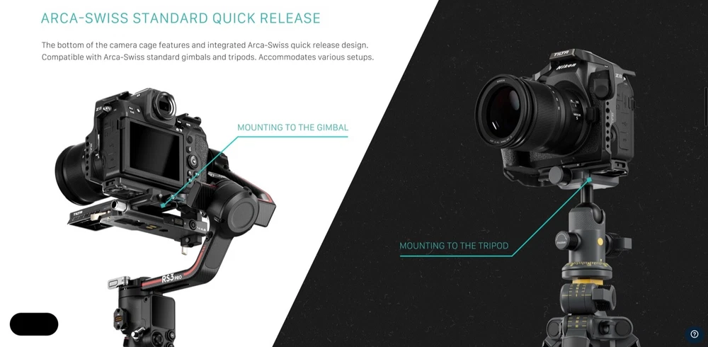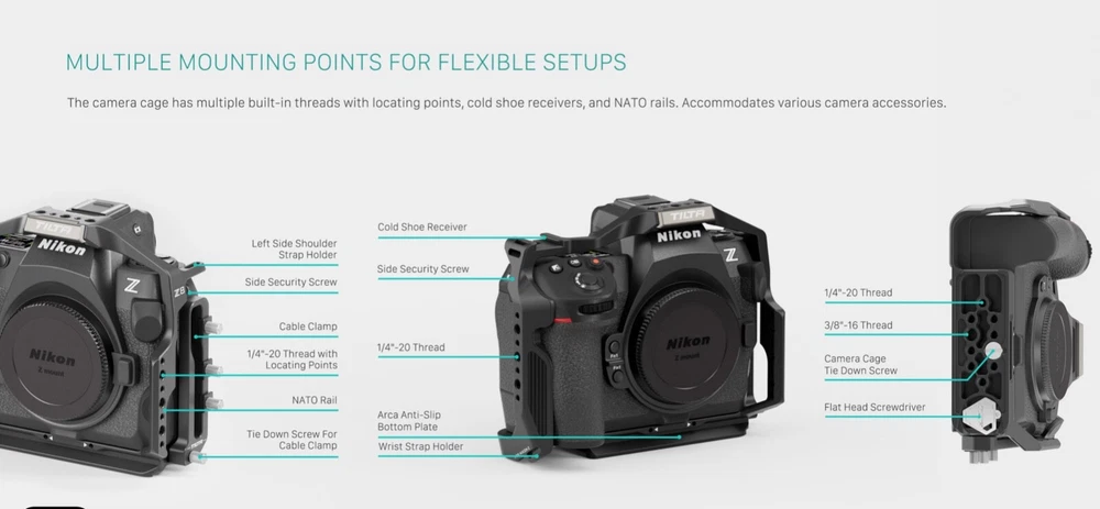 Brand-new, sold by authorized Tilta dealer, reduced in price to help us move some of our overstock. Tilta Camera Cage for Nikon Z8 Pro Kit - Titanium Gray SKU: TA-T55-B-TG UPC: 810076278308 OVERVIEW [MOUNT ACCESSORIES] via Cold Shoe Receiver, NATO Rail, 3/8"-16 and 1/4"-20 Threads with Locating Points [NATO TOP HANDLE] Expands Mounting Options while Improving Flexibility for Operating & Handling [ARCA BASEPLATE] Supports 15mm Rod Based Accessories and Quickly Transitions to DJI Ronin [WOODEN HANDLE] Features Ergonomic Design and Adjustable Positions for Maximum Comfort [CABLE CLAMP] Secures Cables in Place with Convenient Thumb Screw Design MANUFACTURER'S DESCRIPTION Introducing the Pro Camera Cage Kit for Nikon Z8, the ultimate professional solution for improving the functionality of your camera in a video production or photography environment. The Full Cage cage protects your camera via its aluminum alloy frame and features flexible options for mounting accessories such as a Cold Shoe Receiver, NATO Rail, 3/8″-16 and 1/4″-20 threads with locating points. The cage features an integrated ARCA-Swiss bottom plate which allows users to quickly transition between compatible tripods and gimbals like the DJI Ronin RS3 Pro. The cage features a secure and form fitting design that utilizes two points of contact and features thumb screw based cable clamp that allows users to better secure essential cables. The included NATO Rail Attachment and NATO Based Top Handle offer additional options for handling and operating, especially helpful when shooting low angles shots. The Top Handle expands mounting options by providing additional 1/4″-20 threads and an extra Cold Shoe Receiver, ideal for an external monitor via our Cold Shoe Monitor Bracket. This kit includes a NATO based Wooden Handle which features an ergonomic design and a rotatable attachment points which allows users to find the ideal operating position and allows you to re-position quickly when needed. The included LWS Baseplate allows users to mount rod-based accessories such as follow focus motors or matte boxes while the modular ARCA based design allows users to quickly switch between this baseplate and other support systems or gimbals. PACKING LIST Full Camera Cage for Nikon Z8 Tiltaing Compact NATO Top Handle Tiltaing 18mm NATO Rail Attachment HDMI and USB-C Cable Clamp for Nikon Z8 Tiltaing Advanced Left Side Wooden Handle Tiltaing Advanced Left Side Handle Attachment Type VIII Tilta 15mm LWS Arca Manfrotto Dual Baseplate 2 Aluminum Rod 15*200mm