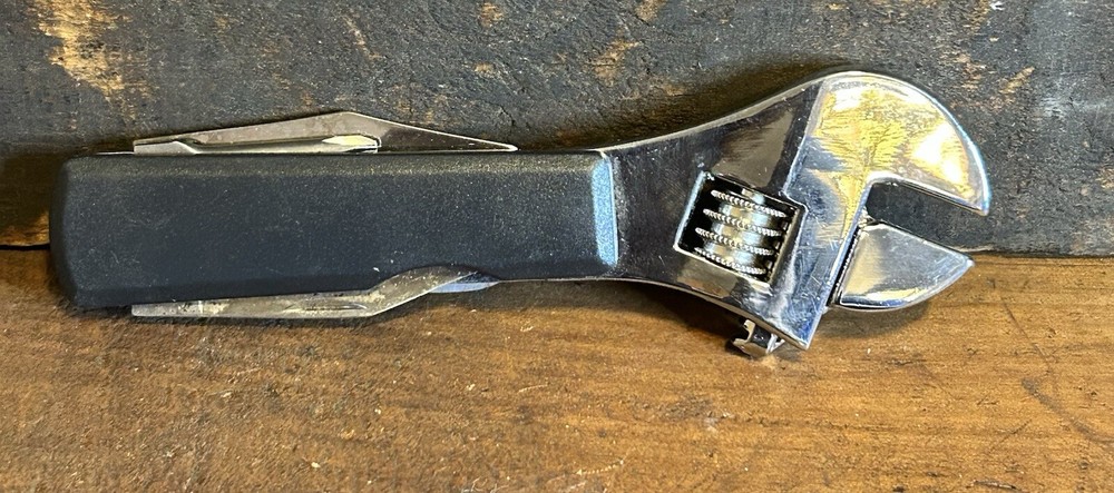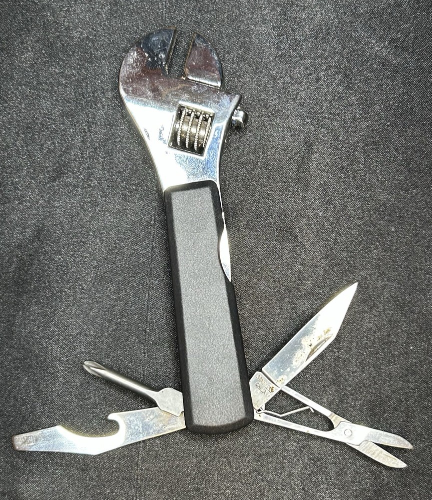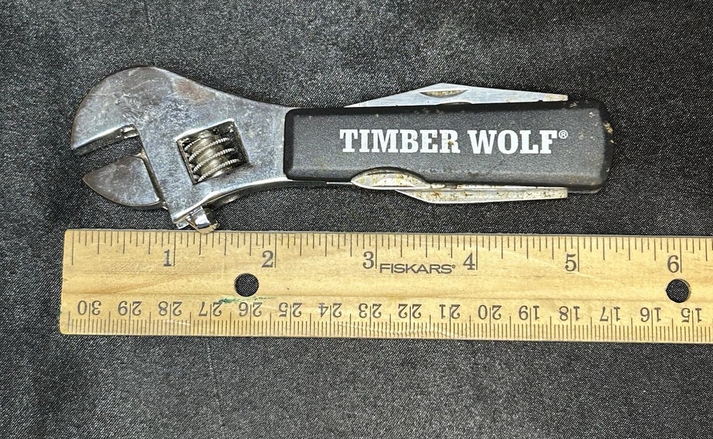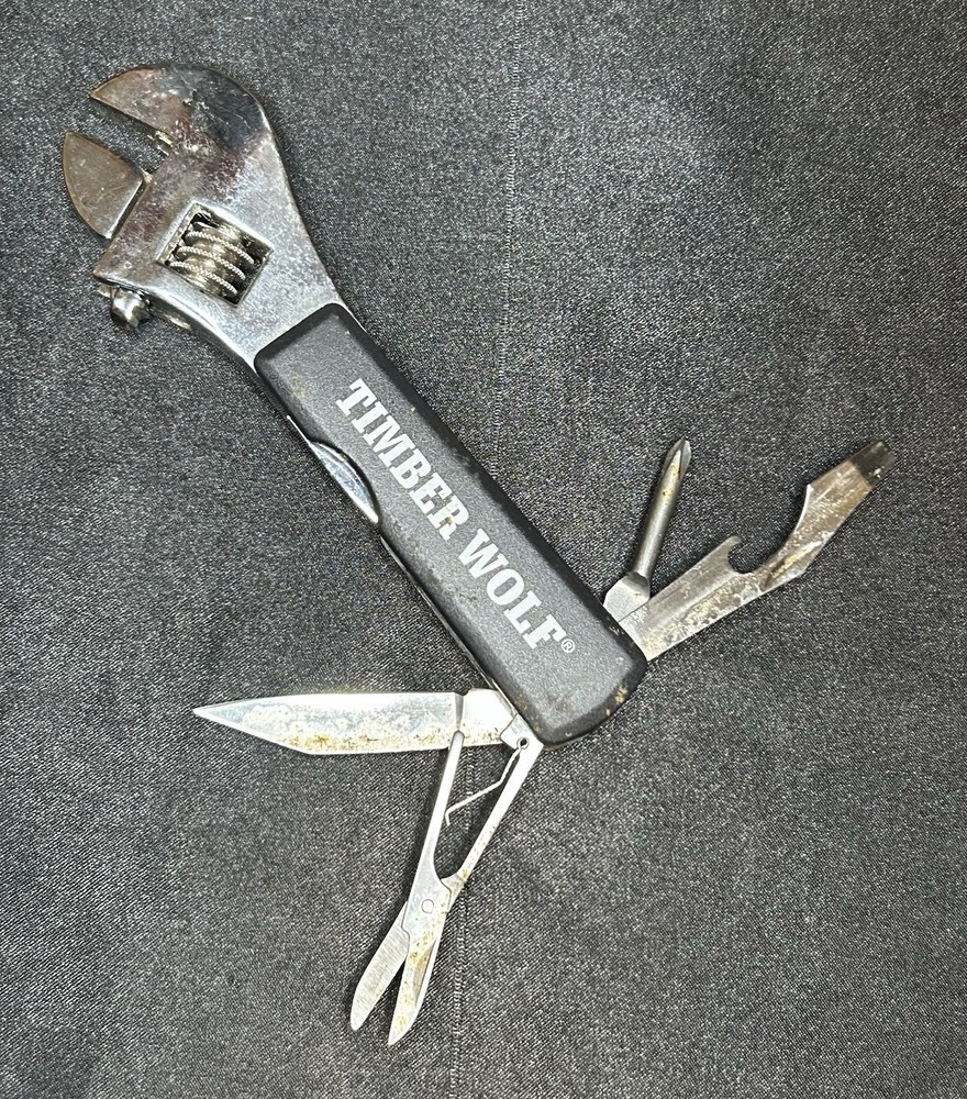 Timberwolf Advertising Pocket Multi-Tool Handy tool with a wrench, scissors, small knife, Phillips head screwdriver, and a bottle opener. It could use a good clean/polish but everything opens and closes as it should.