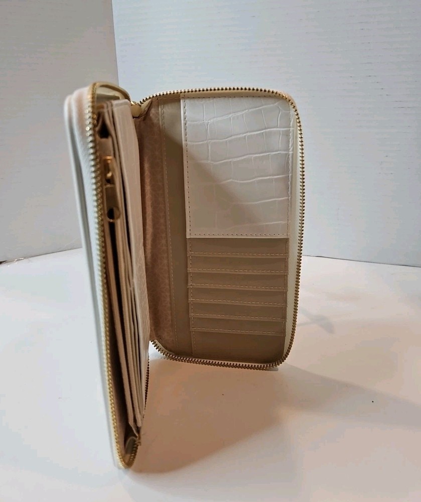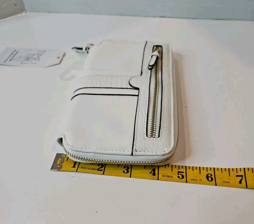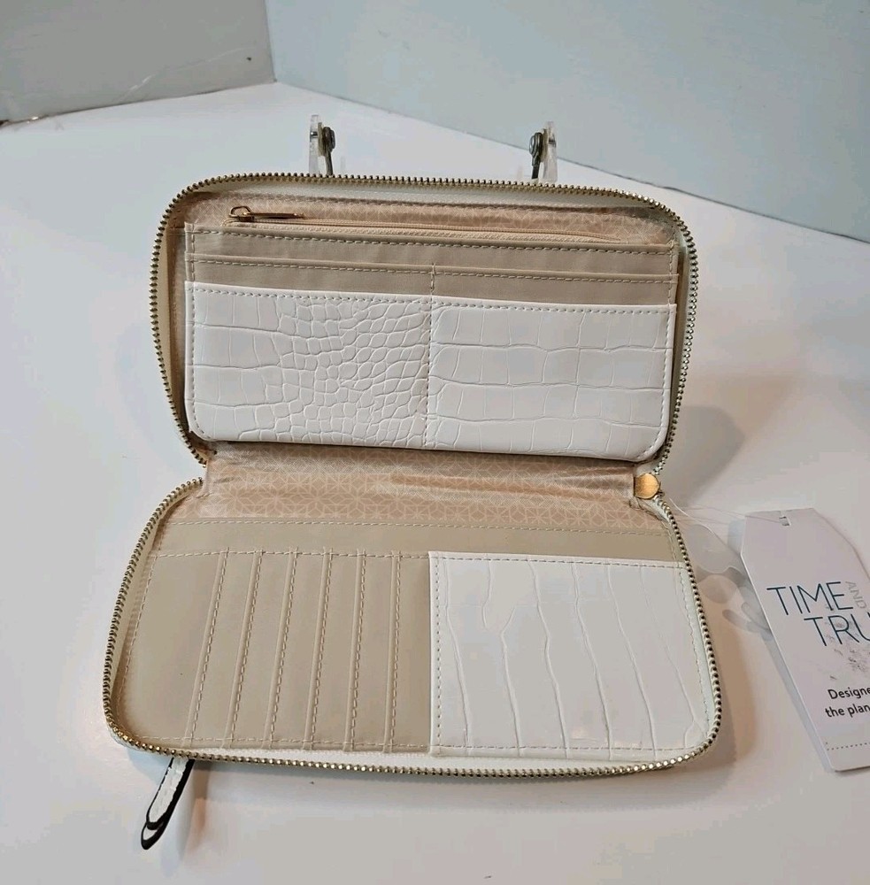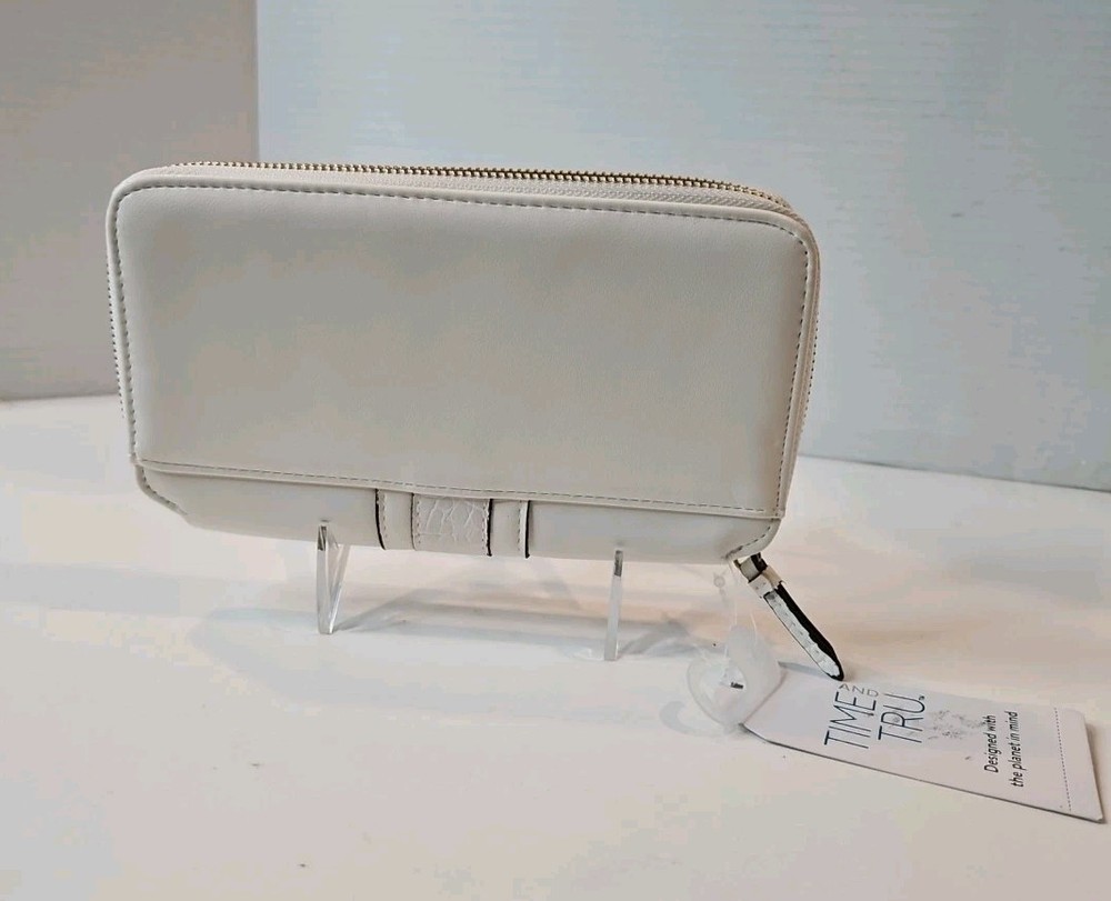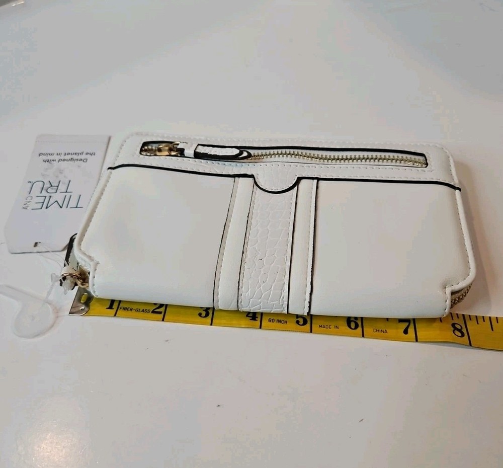 This Time And Tru wallet is the perfect accessory for any stylish woman. With its sleek white color and zip-around style, it's both chic and practical. The wallet is made of high-quality faux leather, ensuring that it will look great even with frequent use. It features ample space for credit cards and other essentials, making it a must-have for any everyday wallet. Whether you're running errands or going out for a night on the town, this wallet is sure to keep all your important items secure and organized. Add it to your collection today!