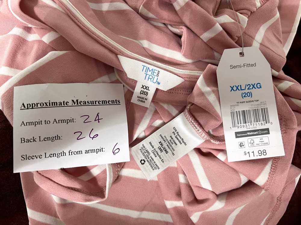 Welcome! ______________________________________________________ *** I do my best to list every inconsistency of item, if there are any, but it is the buyer's responsibility to look at all pictures, read description carefully, check measurements , and ask questions before bidding or buying. Thank You! *** If you are super picky about item condition, please do NOT bid on or buy my items. ______________________________________________________ Up for sale is an adorable Time and Tru top size 2XL, new with tags. **Please compare measurements to your favorite fitting garment to ensure accurate fit.** SEE LAST PHOTO FOR APPROXIMATE MEASUREMENTS _______________________________________________________________________ DISCLAIMER: Payment must be received within 48 hours of auction end date and time. An unpaid item case will automatically be opened after 48 hours if there is no communication. Please just let me know if you need to cancel a sale before a case is opened. For returns ALL shipping costs are NOT refunded. **You must go through eBay for the return process. I am unable to process refund otherwise.** All items must be in original condition when returned. Tags must still be attached (where applicable), no pet hair, stains, etc. _______________________________________________________________________ ****ALL DEFECTS MAY NOT BE LISTED . PLEASE use the zoom feature over photos to ensure you know what you are purchasing! I will not be held responsible if you try and use a not as described reason for return purposes because you failed to view the photos. A case will be opened against you and you will be reported if you try to falsify a return. _______________________________________________________________________ Please contact me with any questions or concerns. Thanks for looking!
