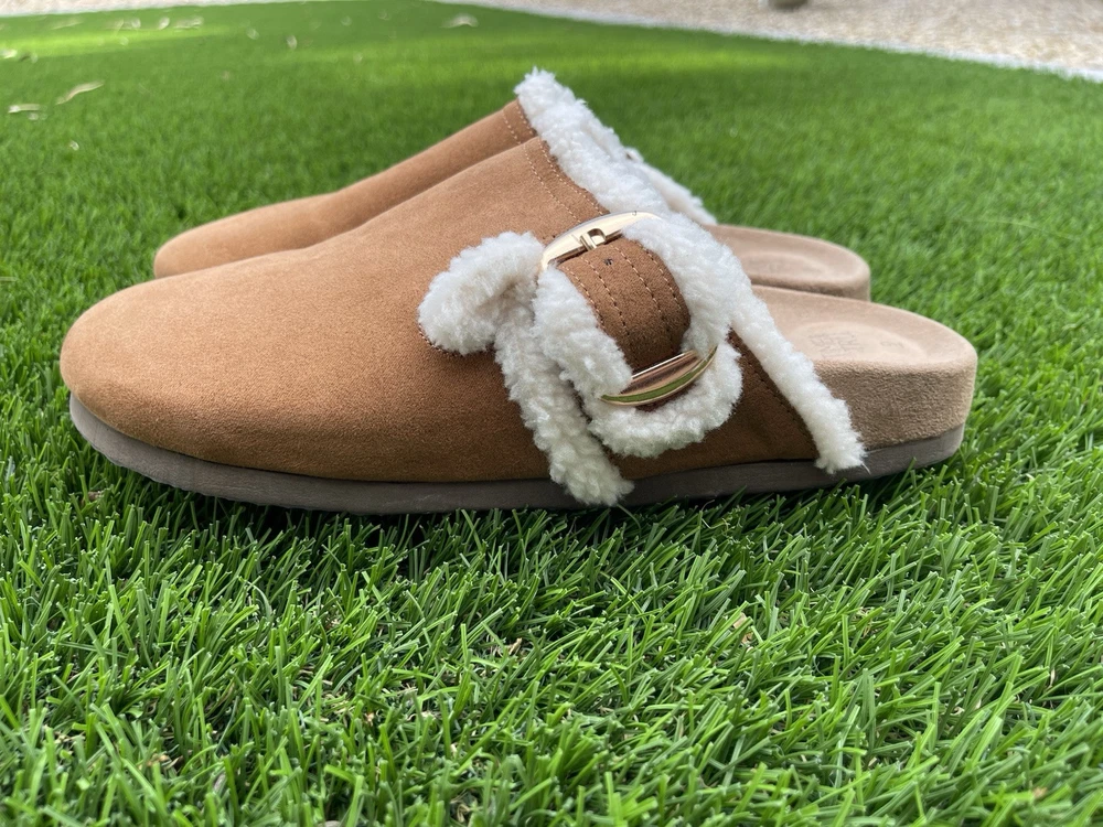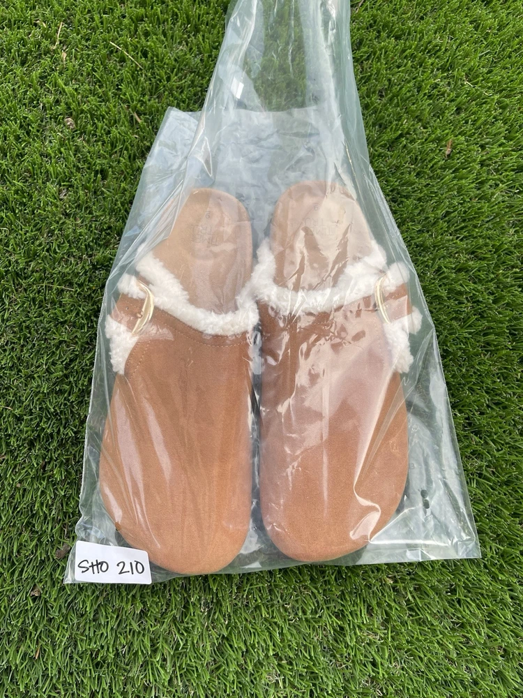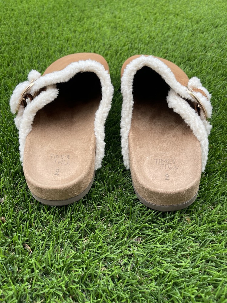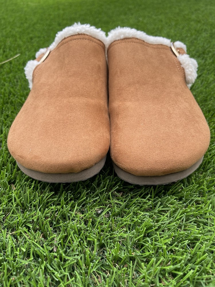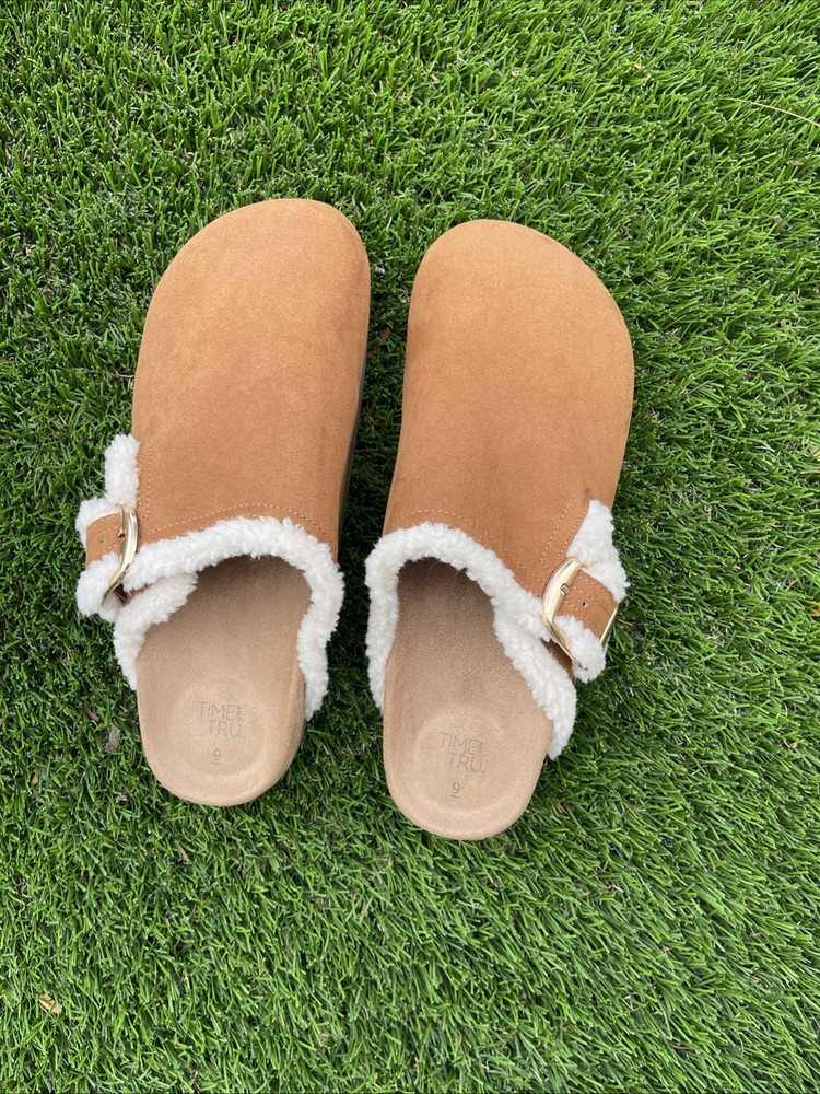 The Time and Tru Buckle Clogs in brown are a stylish and comfortable option for women in size 9. With a round toe, flat heel, and buckle closure, these clogs are perfect for casual occasions in the summer, fall, and spring. The faux suede upper material and rubber outsole provide durability and a modern style, while the synthetic insole ensures a comfortable fit for all-day wear. The low top shoe shaft style and solid brown color make these clogs versatile for various outfits and activities, making them a great addition to any woman's shoe collection. SKU 121