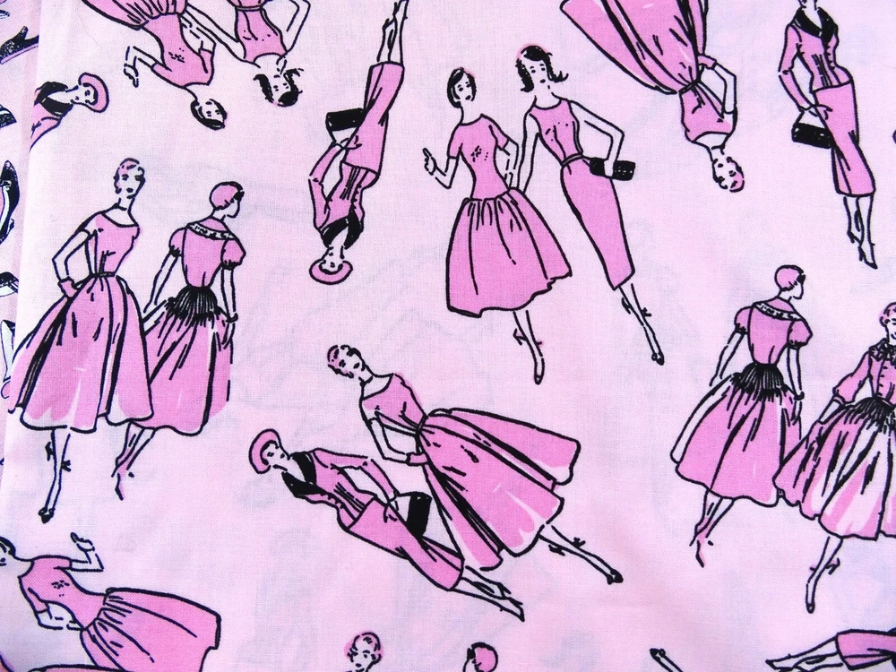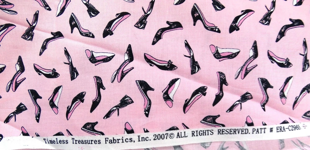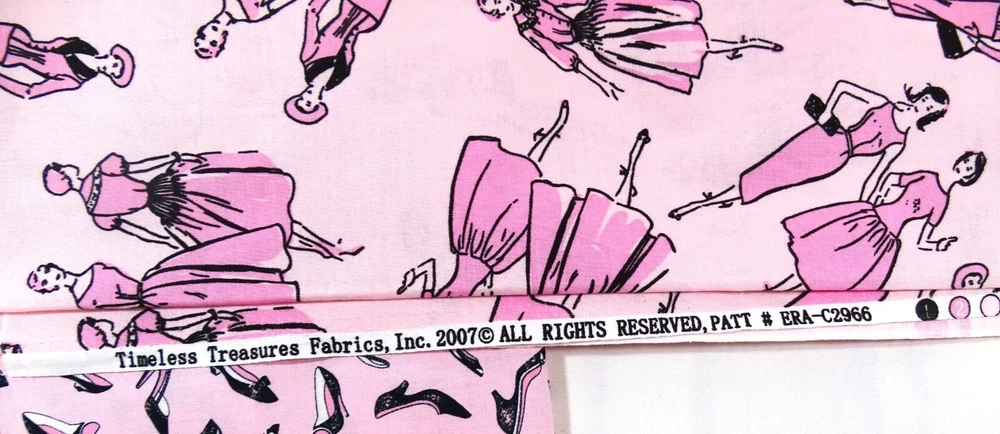 Timeless Treasures Fabric #C2966 #C2965 Vintage 2007 Lot of 2 44"x18" Cotton Both pieces of fabric are approximately 44" long x 18" tall. Both pieces are pink. One has illustrations of women dressed up in 50's style the other depicts womans high heels. Fabric is no longer in print.