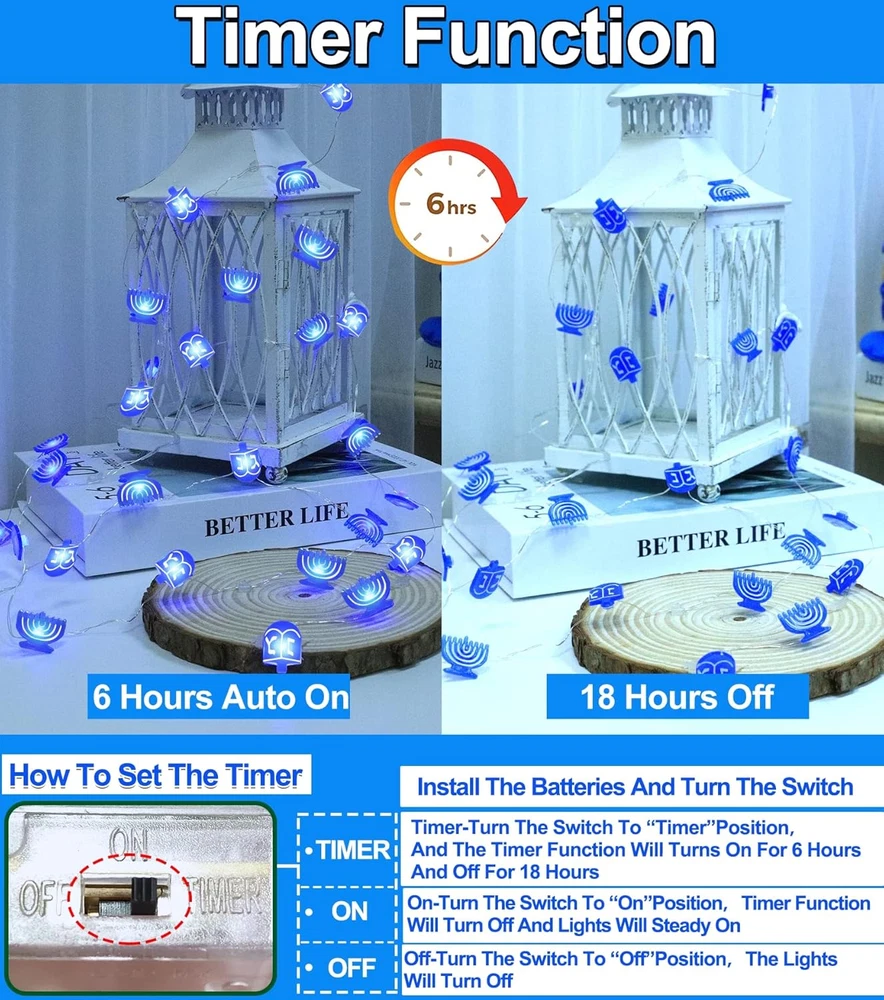 Menu Other Items Feedbacks About Us Contact Us Add To Favorites Timer 10 Ft 20 LED Hanukkah Decorations Menorah Dreidel String Lights Blue Fairy Twinkle Lights Battery Operated for Jewish Jews Synagogue Judaism Bedroom Party Candelabra Chanukah Decor Unique Design Hanukkah Lights : You will receive a 10 Ft 30 LED Hanukkah string lights with 2 shapes(Menorah and Dreidel). Each Menorah size is 0.8 x 0.6 inch(width x height). Each Dreidel size is 0.6 * 0.8 inch (width x height). Timer Function : Just switch into the "Timer" position, It will make the lights auto on for 6 hours and off for 18 hours per day. It will cycle everyday until you switch to the "Off" or "On" position Battery Operated & Safe : The Blue Hanukkah lights is in safe low voltage, so it will remain in cool state and safe to touch after long time use. It's safe for children and pets. Requires 3AA battery(not included). Lighting mode: steady on Flexible Copper Wire : The Hanukkah copper wire lights can be easily bent into any shape you like for indoor and outdoor use. It will add to the Hanukkah atmosphere for your room Hanukkah Party Decor : It can be used in Hanukkah decorations indoor, fireplaces, windows, children's rooms, bedrooms, walls, fireplaces, rooms, windows, fences, greenery, camping, front doors, courtyards, photo walls, small trees, cars,etc Specification Size/String: Total length: 10Ft Distance between two light: 4inch Single Menorah: 0.8 * 0.6 inch (W * H) Single Dreidel: 0.6*0.8 inch(W * H) Packing box: 5 * 4 * 1.8 inch (L * W * H) Product Appearance: Menorah and Dreidel. Number of lamps/string: 20 lights. Product Color: Blue Lighting mode: steady on Lighting Color: Blue Material: PVC + copper wire Power supply: 3AA battery (excluding battery). Other features: IP44 waterproof (battery case is not included) Applicable scene: Hanukkah decoration, fireplace, window, children's room, bedroom, wall, indoor. Package includes: 1 x Hanukkah Lights Item Specification Light Source Type LED Style Menorah and Dreidel Number of Items 1 Power Source Battery Powered Item Dimensions 1 x 1 x 1 inches Number of Light Sources 30 Control Method Touch Theme Jewish,Jews,Synagogue Controller Type Touch Control Product Dimensions 1 x 1 x 1 inches; 2.89 ounces Occasion Type Christmas Seasons Winter Additional Features Waterproof Indoor/Outdoor Usage Indoor Material Type Copper, Polyvinyl Chloride Light Color Blue Water Resistance Level Waterproof Occasion Christmas Special Feature Waterproof Color Dreidel & Menorah Indoor Outdoor Usage Indoor Style Name Menorah and Dreidel Shipping FREE FREE SHIPPING We are always working hard to ensure your package arrives as soon as possible. Please understand that some factors like weather, high postal traffic, and the performance of shipping companies are outside of our control. We offer free shipping to the lower 48 states. We do not accept P.O. Boxes. Please provide a physical address. If you have a problem or question regarding your transaction please contact us immediately. We will work with you to resolve any problem you may have. Thank you