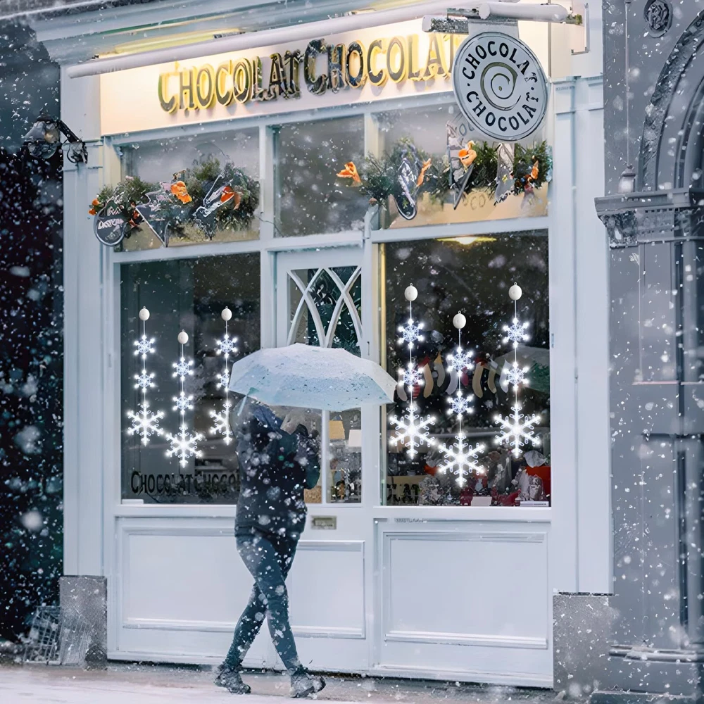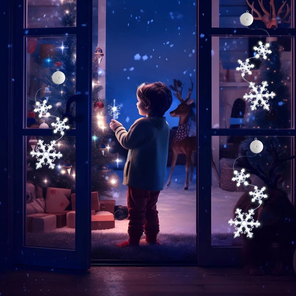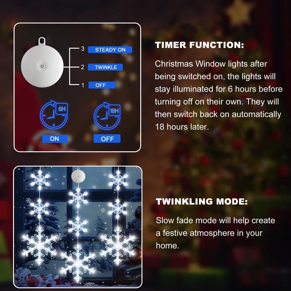 đăCHRISTMAS WINDOW LIGHTSă:The snowflake shaped Xmas window lights with suction cup, total 72 white LED bulbs, no harm to wall, You can place the lighted Christmas window lights ornaments wherever you want to brighten your Christmas night for your family. âď¸ăTIMER FUNCTIONă The timer function that automatically cycles on for 6 hours and off for 18 hours saves energy, and you don't have to set it up every day. The built-in timer function will automatically activate when you turn on the light. đăEASY TO USEă : the window decoration light comes with a suction cup, which can be easily installed on glass, gates, cabinets, etc., and the height can be adjusted according to the fixed position and press the ON/OFF button on the battery compartment to turn on/off the lights (Lighting Mode: Steady on, Twinkling).make sure that the suction cup is clean before installation, adding appropriate water to increase the adhesion. đăEASY TO USEă : the window decoration light comes with a suction cup, which can be easily installed on glass, gates, cabinets, etc., and the height can be adjusted according to the fixed position and press the ON/OFF button on the battery compartment to turn on/off the lights (Lighting Mode: Steady on, Twinkling).make sure that the suction cup is clean before installation, adding appropriate water to increase the adhesion. đ ăWIDE APPLICATIONSă: Christmas string lights decoration with hooks can be hung on door, porch, hallway, balcony, roof edge, bedroom, mantel, hearth, centerpiece, Christmas tree, garland, garland, railing, handrail, hallway, deck, patio, bar, Bistro, Cafe, Bar, Restaurant, Shopping Mall, Office, Private Car. âăGIFT LIGHTSă: With the Classic Christmas shaped lights, no extra bore and doubt on gift choosing, these reusable festival decor lights will be the first choice as the best wishes for family, friends, relatives or colleagues.