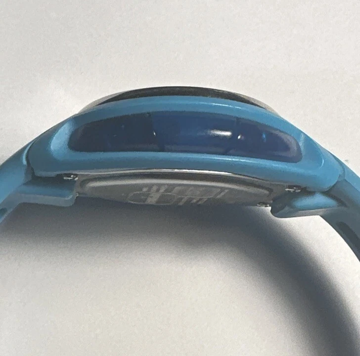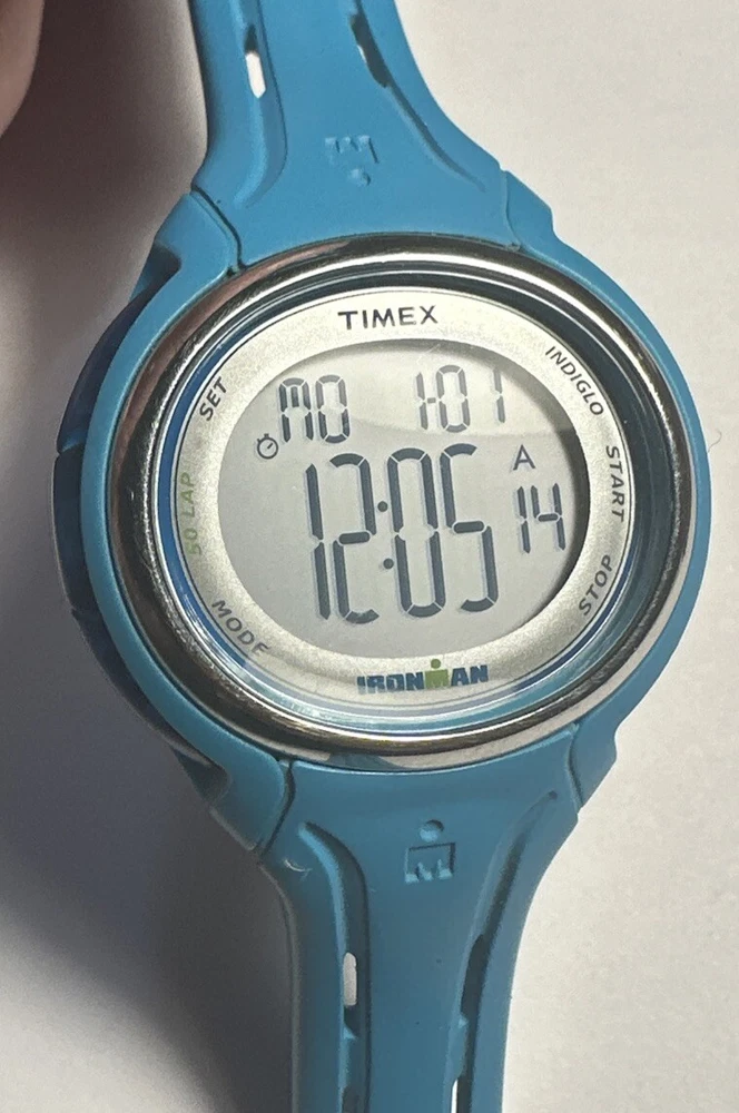 This Timex Ironman Light Blue Silicone 50 Lap Indiglo Watch is perfect for women who love sporty styles. With a 38mm rubber case and a two-piece silicone and rubber strap, this wristwatch is both durable and comfortable to wear. It features a digital display with Arabic numeral indices, a month indicator, a date indicator, and a day indicator. The watch is powered by a quartz movement and has a screwback caseback. The bezel color is blue, and the dial color is silver. This watch is suitable for wrist sizes between 7.26-7.5 inches and has a band width of 12mm. New Battery