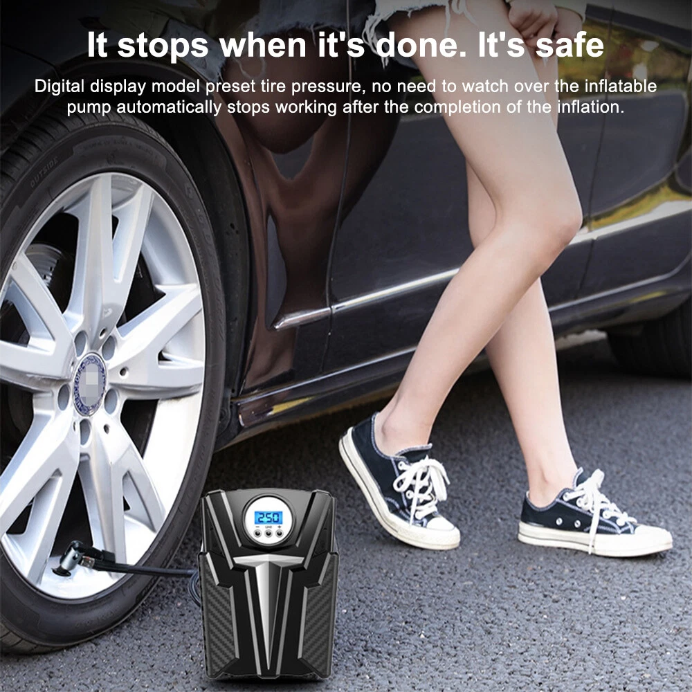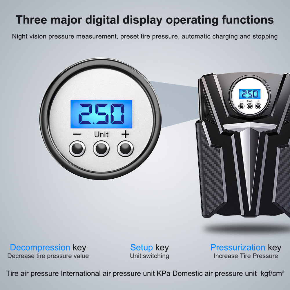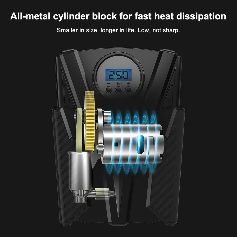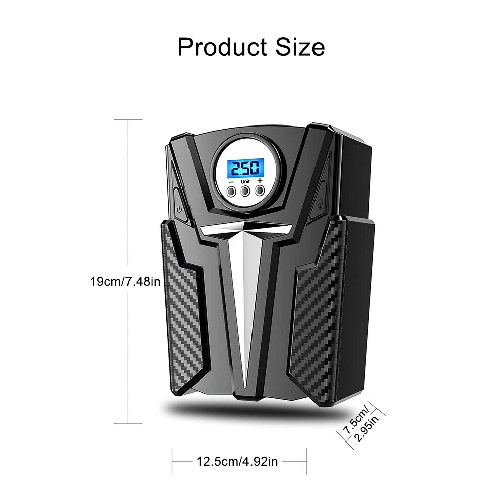 Specification: Material: ABS Operating voltage: 12V Rated input: 12V 2A Cylinder diameter: 22mm Rated power: 60W Pressure range: 3-150PSI Accuracy: ±1.5psi Air volume: 25L/min Continuous working time: 15min Time: Inflation time: 8-9min Power cord: 3m Input interface: DV 12V Usage time: 15min Hose length: 520mm±10mm Operating temperature: -20℃~60℃ Size: 19*12.5*7.5cm Package Included: 1 x Inflator pump 3 x Inflator nozzle 1 x Cigarette lighter 1 x Storage bag 1 x User manual