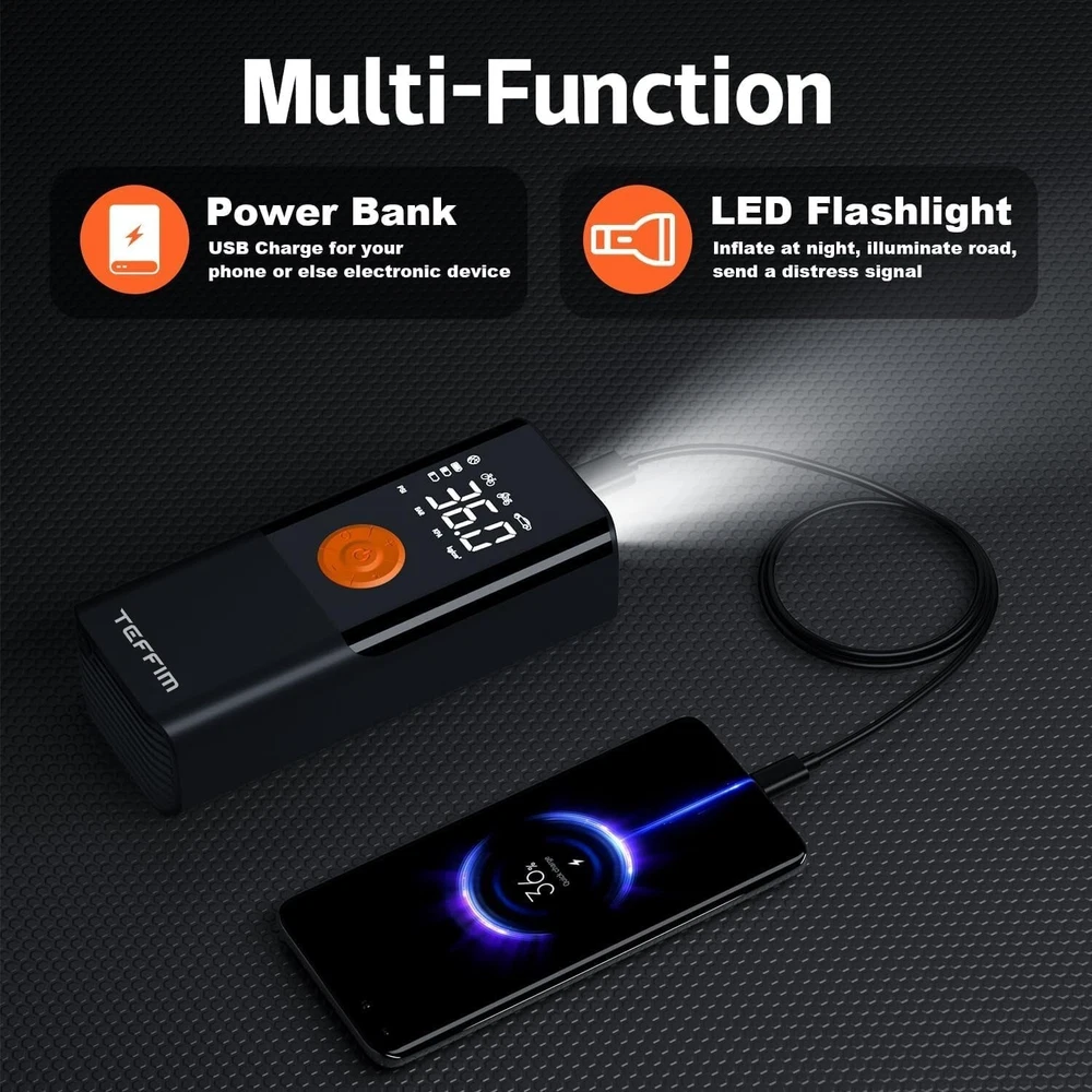 -Brand New - Never Used - Questions: Feel free to ask any Questions - BOX: Never Opened - DESCRIPTION: POWERFUL AND LONG-LASTING BATTERY LIFE: Equipped with a high-quality rechargeable 10000 mAh battery, this tire inflator offers triple the lifespan and extended usage time. With just one full charge, you can inflate four 195/55/R15 car tires (0-36 psi), and the battery can stay standby for over 365 days. Say goodbye to quick battery drain, insufficient power, and frequent charging LARGE SCREEN AND PRECISE GAUGES: This tire inflator features a next-generation high-precision sensor and dual LCD displays that show real-time and preset pressure values. It allows you to switch between four units (psi, kpa, bar, and kg/cm²) with accuracy within 0.5 psi, ensuring the correct tire pressure and enhancing safety. The automatic shut-off function stops inflation when the desired pressure is reached, preventing over-inflation 5 PERSONALIZED SETTINGS: The powerful cordless air compressor allows you to customize common units and preset values for car, motorcycle, bicycle, sports balls, basketball and manual mode, simplifying operation and eliminating repetitive settings. It comes with four additional adapters to meet various inflation needs, making it an ideal choice for motorcycle tires and bicycles DUAL INFLATION METHODS: This tire inflator is equipped with a 9.8-foot DC 12 V power cable and a USB charging cable, offering two ways to charge and inflate. After charging, you can use the USB cable for cordless inflation, or utilize the DC 12 V cable to inflate using your vehicle's power in outdoor emergency situations FAST CHARGING, LED LIGHT, AND PORTABLE POWER BANK FUNCTIONALITY: This portable air compressor features a super-bright LED light with 3 modes, providing assistance during tire inflation and in dark conditions. The 5 V USB-C input ensures quick charging, while the USB-A output transforms it into an emergency power source for your phone. Its compact size makes it highly suitable for storage in your car, bike rack, or backpack - OFFERS: Reasonable offers are considered, LOWBALLERS, Best price and Lowest askers will be ignored - all sales final/no refunds/ no exchanges/ no returns - Disclaimer: I do not own the brand's trademarks, logos, pictures, or products posted. I do not intend to infringe on copyright. I find such content available on the internet. Contents are considered fair use. - Tire Inflator Portable Air Compressor with Digital Pressure Gauge, 12V Smart Air Pump for Car Tires, Motorcycle, SUV, Electric Bike, Bicycle, Sports Balls with 10000mAh Battery & LED Light (1)