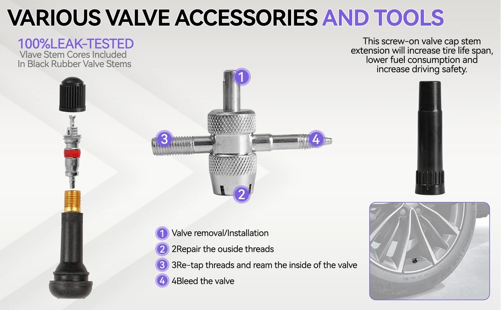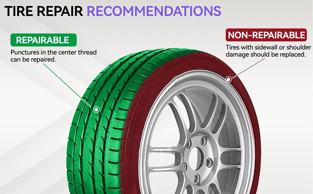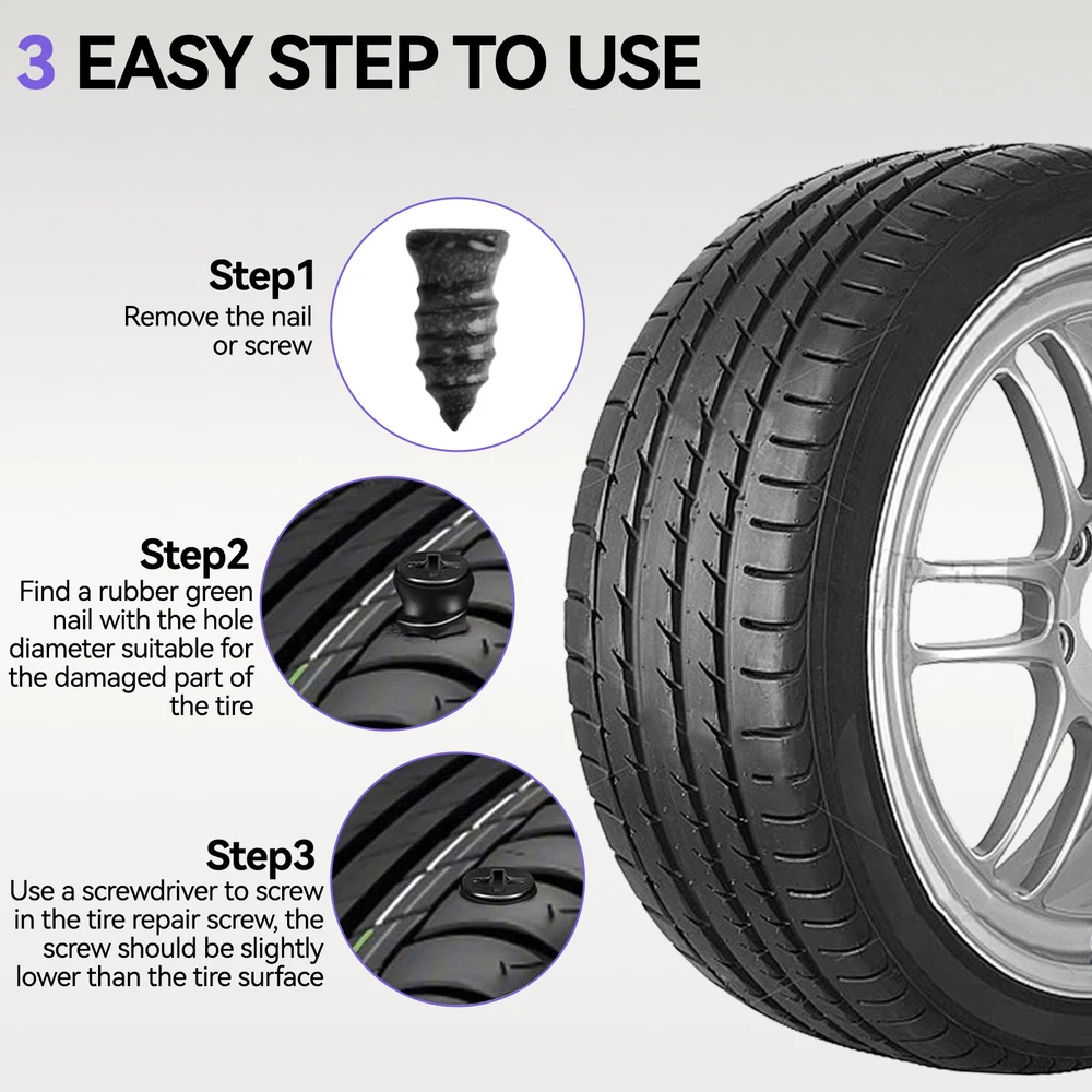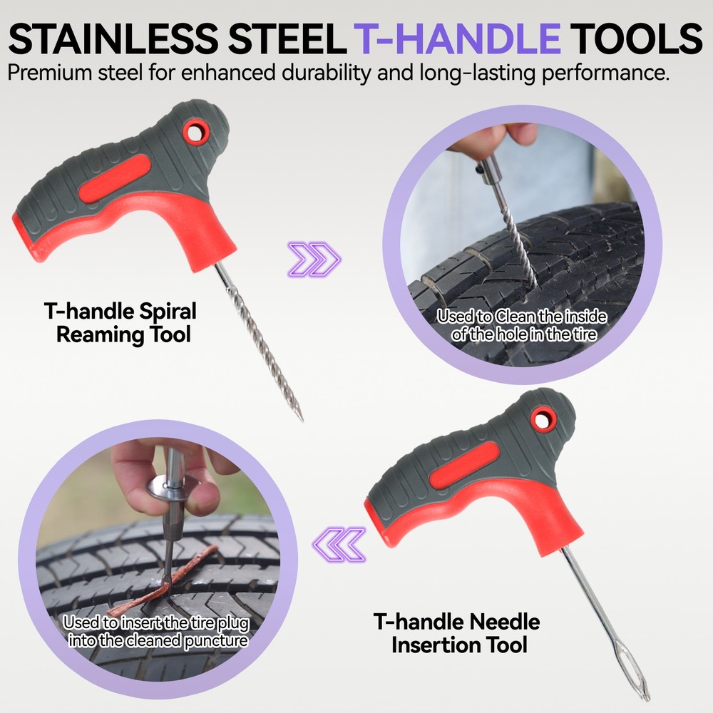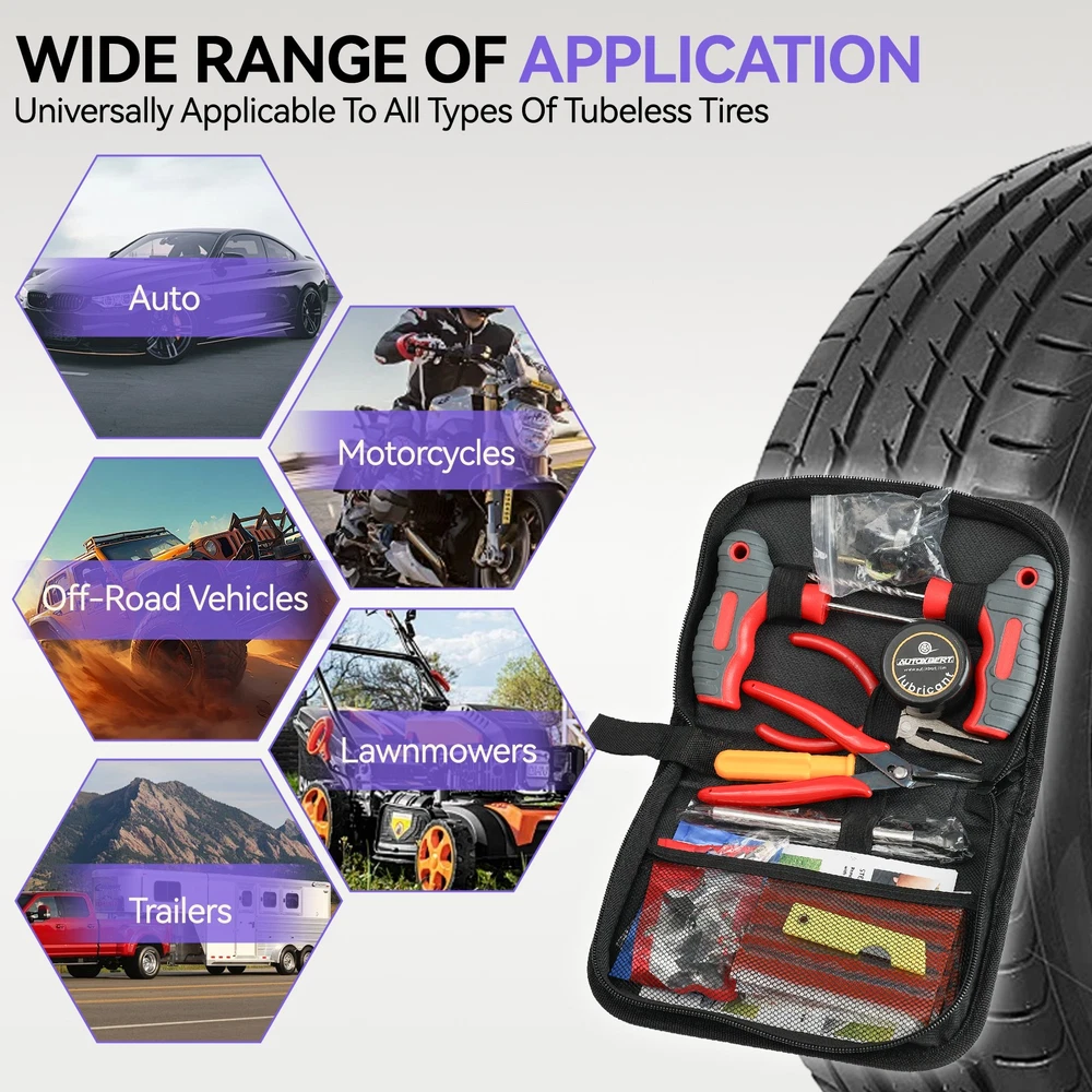 Feature: 1. Quick and Temporary Fix: The tire repair kit provides a fast and temporary solution to mend damaged tires, preventing air leakage and avoiding the need for vehicle towing, trailer assistance, or spare tire replacement. It's suitable for RVs, off-road vehicles, trucks, motorcycles, and tractors, ensuring you're prepared for any tire emergency. 2. Comprehensive Repair Tools: This heavy-duty tire plug kit contains all the necessary tools and accessories to address various types of tire damages. It's equipped to handle different tire puncture scenarios, making it a must-have for any vehicle owner. 3. Durable and Rust-Resistant: Our tire patch kit for fix a flat is crafted from high-quality steel and zinc alloy, ensuring durability and resistance to rust. The premium tire repair strips are made from vulcanized butyl rubber and natural rubber, maintaining flexibility and resistance to aging for long-lasting repairs. 4. User-Friendly: Designed for ease of use, the tubeless tire puncture change tool kit helps drivers quickly get back on the road after an unexpected flat tire. All the tire repair tools to fix punctures are conveniently housed in a portable case, which can be stored in your vehicle without taking up much space. This kit improves upon all the shortcomings of traditional tire repair tools, making it suitable for every use case and vehicle type, including emergency patches for any tubeless tire - trucks, bicycles, lawnmowers, cars, and more. 5. Versatile Application: Whether you're dealing with an emergency patch for a truck, bicycle, lawnmower, or car, this tire repair tools kit is designed to meet the needs of any situation and vehicle. Its versatility and ease of use make it an essential item for quick fixes on the go, ensuring you're always prepared for the unexpected. Note: Due to the different monitor and light effect, the actual color of the item might be slightly different from the color showed on the pictures. Thank you! Please allow 1-2cm measuring deviation due to manual measurement. Product List: 1*Instruction 1*Pliers 1*Flush Cutters Pliers 1*T-handle Spiral Probe Tool 1*T-handle Insert Tool 1*Double-ended screwdriver 1*Lubricant 1*Utility Knife 1*Tire Pressure Gauge 1*Tire Tread Depth Gauge 1*4-in-1 Valve Stem Tool 1*2-in-1 Valve Stem Tool 8*Black Plastic Valve Caps 10*Tire Rubber Nails (Large) 10*Tire Rubber Nails (Small) 10*Standard Valve Cores 25*Self-Vulcanization Repair Plugs