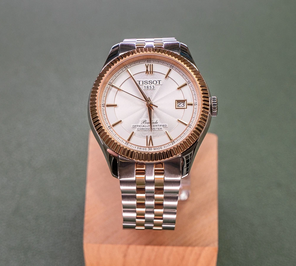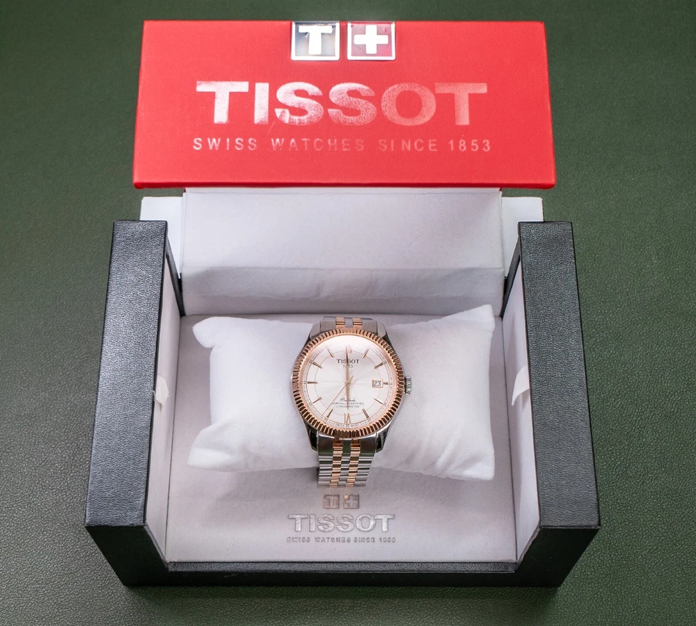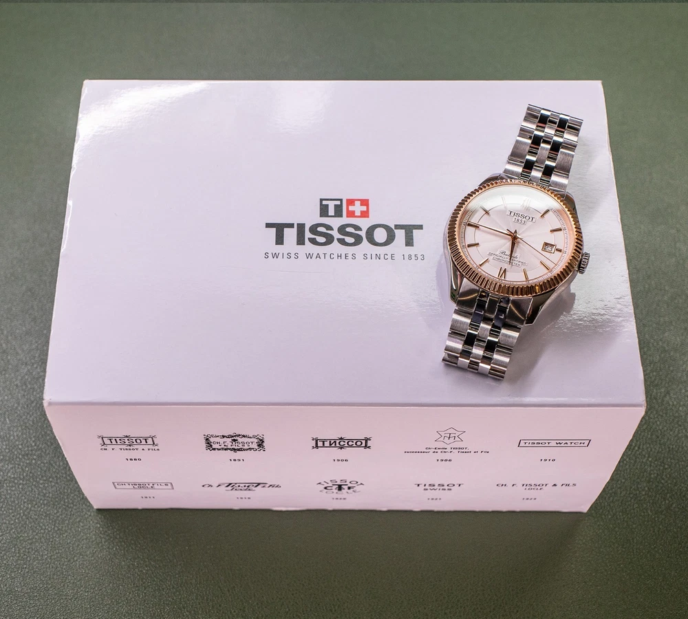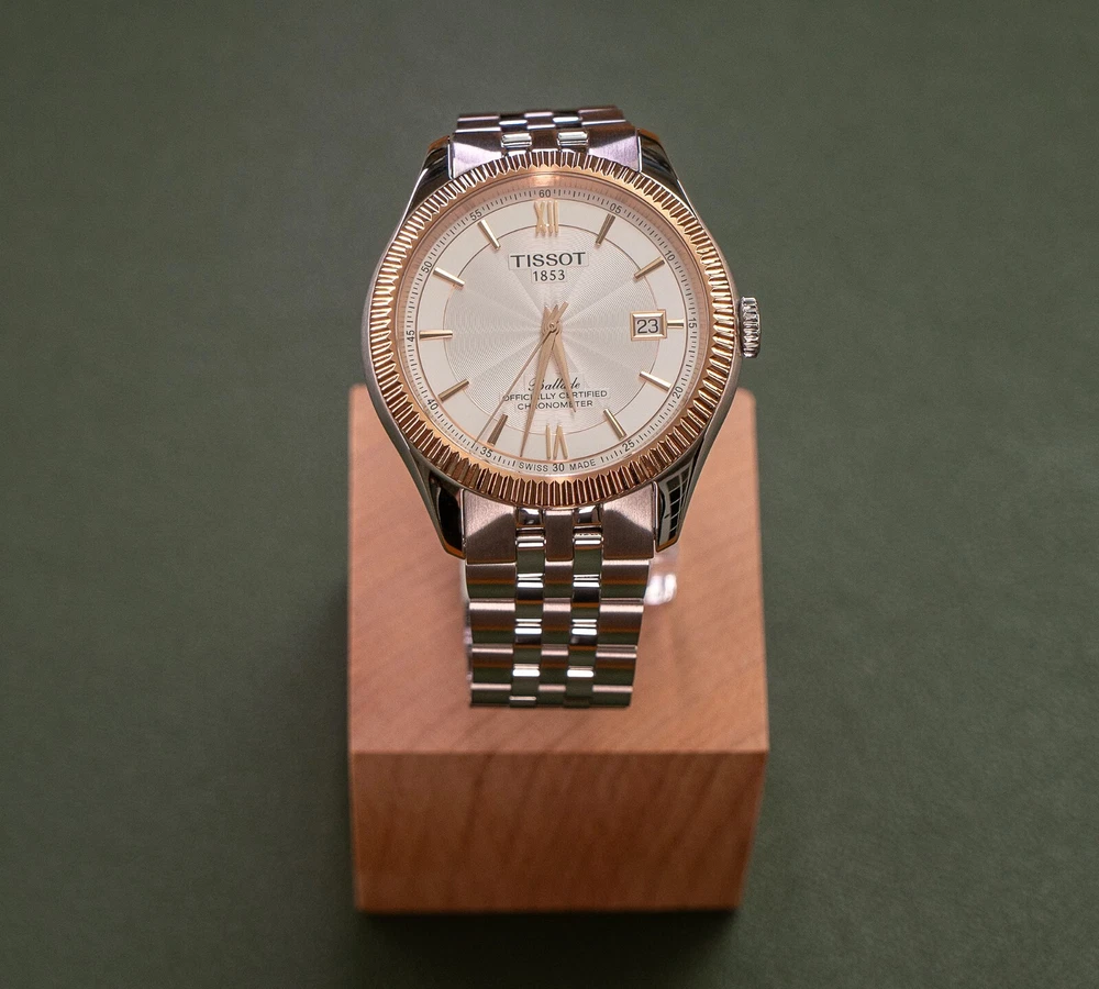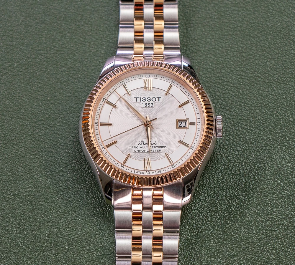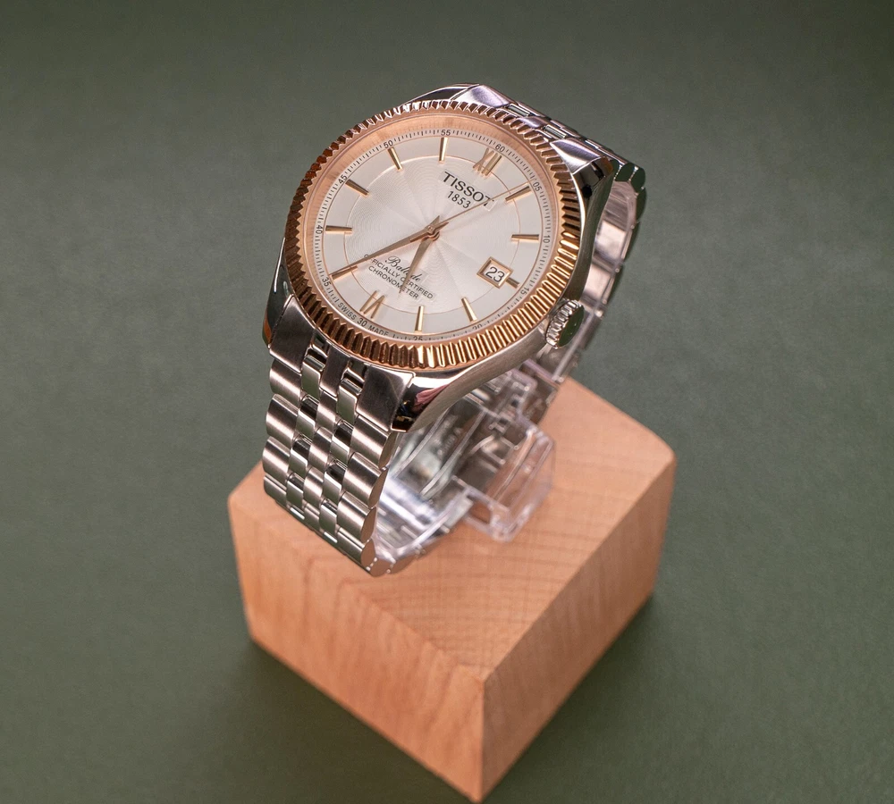 THIS WATCH INCLUDES TWO BRACELET OPTIONS: The stock two-toned rose gold bracelet with butterfly clasp, and the identical construction all-steel version of the same bracelet with butterfly clasp (an additional $250 retail value). The second bracelet was provided by Tissot and includes the original packaging. The dual bracelet option allows for additional flexibility that allows you to chose exactly how much two-toned goodness that you want to wear. Both bracelets quickly interchange with standard springbars, and are currently sized for a 7.5 inch wrist with additional links provided. This watch also includes a Tissot canvas zipper tote bag. TISSOT BALLADE POWERMATIC 80 SILICIUM The Tissot Ballade Powermatic 80 Silicium functions as one of Tissot's flagship models in their brand line up, offering an incredibly refined and sleek model that is great for both the seasoned collector and the high-end consumer alike. With the combination of fluted bezel, gilloche dial to sector dial layout, the ballade takes on a traditional look of elegance that you would often need to pay many thousands of dollars to achieve. The beauty of the Ballade design is the marriage of capability utilising Tissot's construction, both with highly competent movements and durable materials, placed into a platform that can take the knocks of daily life. If you've been looking for a semi-formal watch that can be worn in business formal environments, then dressed down to more casual events with the right strap and bracelet combination, the Ballade is a fantastic choice. This watch is now discontinued and is becoming quite rare and hard to find as a brand new watch. At the pinnacle of Tissot's platform and movement design, The Ballade COSC Silicium uses Tissot's high-end Powermatic Silicium COSC 80-81 movement that offers an 80 hour power reserve that is Swiss Chronometer Certified (COSC). Thanks to the Silicium model's silicone balance spring, the watch maintains a greater level of magnetic resistance when compared to regular watches with a steel balance spring. NOTE: The Powermatic 80 Silicium 80-81 movement is not the same movement used in the PRX. Due to the COSC requirements, the Silicium movement does not use the plastic escapement from the PRX and lower powermatic models. The Powermatic 80 Silicium COSC sits at the top of Tissot's current movement design and capabilities, as the most rugged and accurate movement available in the greater Tissot lineup. Please google "Tissot Powermatic 80 Silicium" for Tissot's video on the movements unique capabilities if you're interested in more information. The watch employs a time-tested and classic two-toned stainless steel case that implements rose gold accents, through to the fine details on the watches' dial. The original bracelet also implements the rose gold accents, however with the secondary bracelet can be swapped over to the steel-only option on the second bracelet. The Ballade uses a surprisingly thin 41mm case design that wears on considerably smaller than the size would suggest, feeling closer to 39mm mm. The watch uses 20mm lugs, making this one an incredible strap monster, capable of taking a range of formal and casual straps. The watch also uses saphire crystal front and back, to increase the durability and scratch resistance of the model. The Tissot Ballade Powermatic 80 Silicium offers an incredible platform to those looking for a more formal watch that doesn't need to be babied or handled with extreme care. While the watch has more formal-looks, the construction, materials and movement scream sports watch, giving the wearer an incredibly accurate and tough watch, that would look completely at home on in a corporate boardroom while also being fully capable on the hiking trail. The Ballade model became the halo watch of the Tissot brand, sitting above even the Gentlemen and PRX models as something a little bit special. This watch is brand new and was purchased for photography and review. The watch includes the original box, manuals, packaging, warranty card, and the additional packaging form the second bracelet. This watch was never worn outside of the photo studio and is in new condition, however there may be very minor surface scratches on the underside of the watch and bracelet from the photography process. The watch case and crystal are immaculate with no signs of wear. This watch sells and ships from Canada and is available for purchase internationally. The buyer assumes responsibility for import duties and taxes on international orders placed outside of Canada. Please refer to your government's websites for imports and international purchases for more information specific to your region. WATCH SPECIFICATIONS: Case Size 41 Case Thickness 9.6 mm Case Material Stainless Steel Case Shape Round Case Back Display Band Band Material Stainless Steel Band Type Bracelet Band Color Two-tone (Silver-tone and Rose Gold PVD), Stainless Steel Band Width 20 mm Clasp Butterfly Dial Dial Color Silver Opaline Type Analog Crystal Scratch Resistant Sapphire Hands Rose Gold-tone Dial Markers Index Second Markers Roman Numerals appear at the 6 and 12 o'clock positions. Arabic Numeral Minute Markers (at 5 minute intervals). Minute Markers around the outer rim Bezel Fixed Bezel Color Rose Gold PVD Bezel Material Stainless Steel Crown Pull / Push Information Brand Tissot Collection Name Ballade Gender Mens Model T108.408.22.278.00 Watch Label Swiss Made Movement Automatic Engine Powermatic 80.811 Power Reserve 80 hours Features Water Resistance 50 meters / 165 feet Calendar Date display at the 3 o'clock position Functions Date, Hour, Minute, Second, Chronometer Watch Features Analog, Stainless Steel, Gold, Chronometer Certified (COSC)