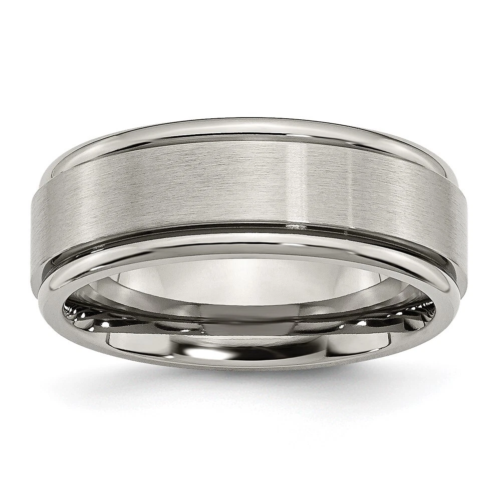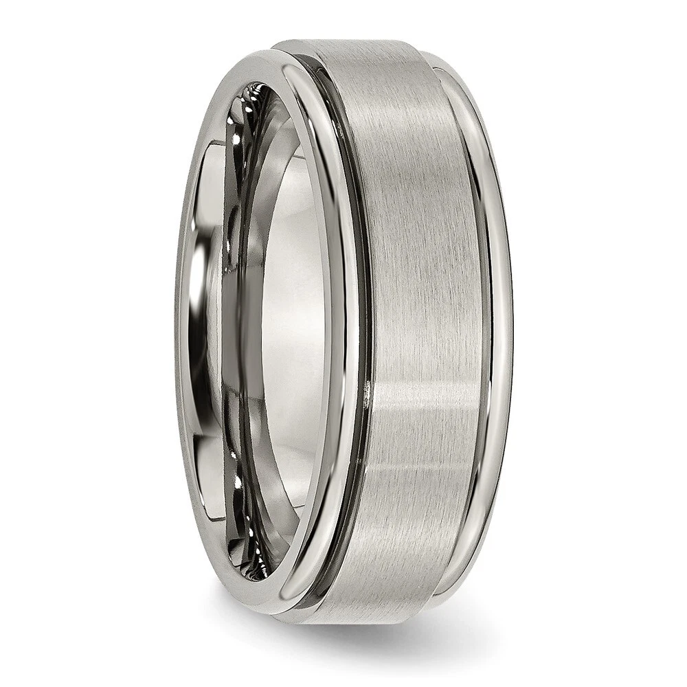 Finish:Polished & Brushed|Band Width:8 mm|Material: Primary:Titanium|Ring Fit:Standard|Sizeable:No|Thickness:< 2.5 mm|Item Weight U/M:gm|Width of Item:8 mm|Engravable:Yes|Packaging:Gift Pouch|Product Type:Jewelry|Jewelry Type:Rings|Sold By Unit:Each|Gender:Unisex|Material: Primary - Color:Grey|Ring Type:Wedding Bands|Edge Type:Ridged All weights and measurements are approximate and may vary slightly from the listed information. Welcome to diamond_6720 Payments We accept all Ebay approved payment. Please sent the payment to us within 8 days after the auction has ended, or you will have unpaid case auto open by eBay. Shipping Policy We will ship all items within 1 business days of purchase during the work week (M-F) excluding holidays. If you order on Friday, your order will be shipped the following business day. Tracking will be provided when it becomes available. We will only ship to a PayPal Verified Address. Please make sure your address is current and correct. If the information does not match, your order may be canceled. Buyers are responsible for all customs, duties and taxes for your respective countries. Delivery times for International Shipping will vary. California Buyers Pay 9.0% Tax on all orders. case auto open by eBay. Return Policy & Exchange Returns or Exchange are accepted. Buyer must contact us within 30 days after the item is received. Item must be returned in unworn and resalable condition. We will only issue a refund for the purchase price, excluding any shipping fees. If we are at fault, we will provide a full refund. Buyer is responsible for all return shipping costs. BUYERS FEEDBACK If you have any concerns regarding your purchase, please contact us via eBay Message, we assure you that a satisfactory resolution will be reached. Your feedback is very important to us Do remember to give us 5 star rating(*****) if you are satisfied with our product & service .