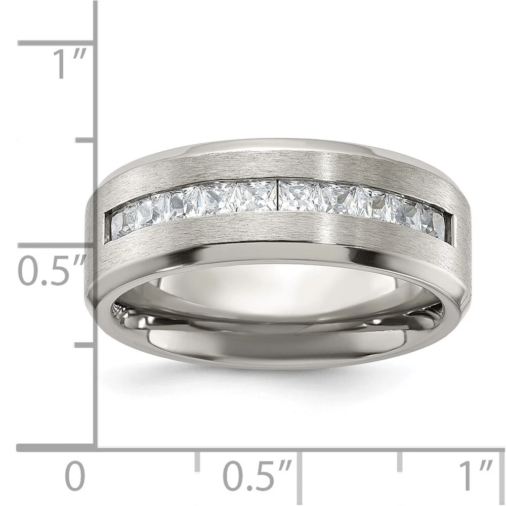 Finish:Polished & Brushed|Stone Type_1:Cubic Zirconia (CZ)|Stone Quantity_1:10|Band Width:8 mm|Stone Setting_1:Channel Set|Material: Primary:Titanium|Stone Shape_1:Square|Stone Size_1:2.5 mm|Stone Treatment_1:Synthetic|Item Weight U/M:gm|Width of Item:8 mm|Packaging:Gift Pouch|Product Type:Jewelry|Jewelry Type:Rings|Sold By Unit:Each|Gender:Unisex|Material: Primary - Color:Grey|Ring Type:Wedding Bands|Stone Creation Method_1:Synthetic All weights and measurements are approximate and may vary slightly from the listed information. Welcome to diamond_6720 Payments We accept all Ebay approved payment. Please sent the payment to us within 8 days after the auction has ended, or you will have unpaid case auto open by eBay. Shipping Policy We will ship all items within 1 business days of purchase during the work week (M-F) excluding holidays. If you order on Friday, your order will be shipped the following business day. Tracking will be provided when it becomes available. We will only ship to a PayPal Verified Address. Please make sure your address is current and correct. If the information does not match, your order may be canceled. Buyers are responsible for all customs, duties and taxes for your respective countries. Delivery times for International Shipping will vary. California Buyers Pay 9.0% Tax on all orders. case auto open by eBay. Return Policy & Exchange Returns or Exchange are accepted. Buyer must contact us within 30 days after the item is received. Item must be returned in unworn and resalable condition. We will only issue a refund for the purchase price, excluding any shipping fees. If we are at fault, we will provide a full refund. Buyer is responsible for all return shipping costs. BUYERS FEEDBACK If you have any concerns regarding your purchase, please contact us via eBay Message, we assure you that a satisfactory resolution will be reached. Your feedback is very important to us Do remember to give us 5 star rating(*****) if you are satisfied with our product & service .