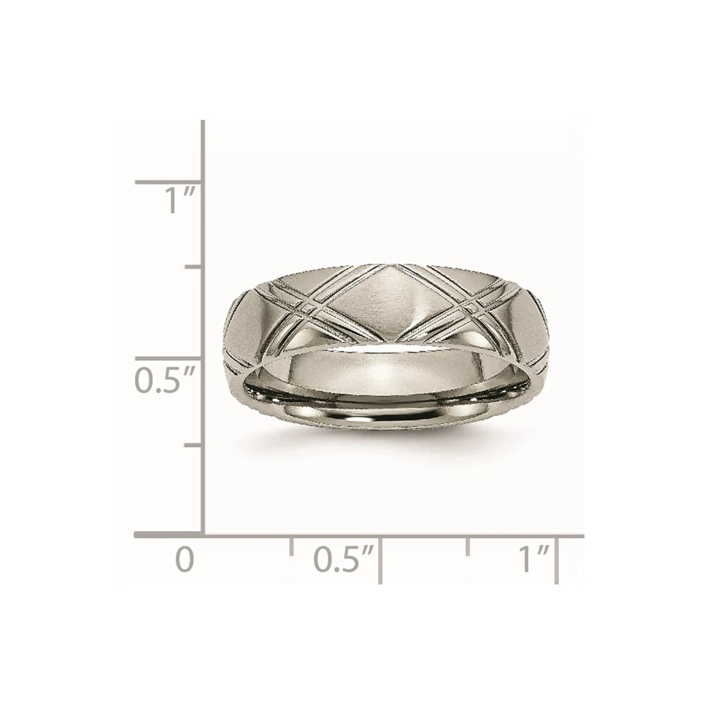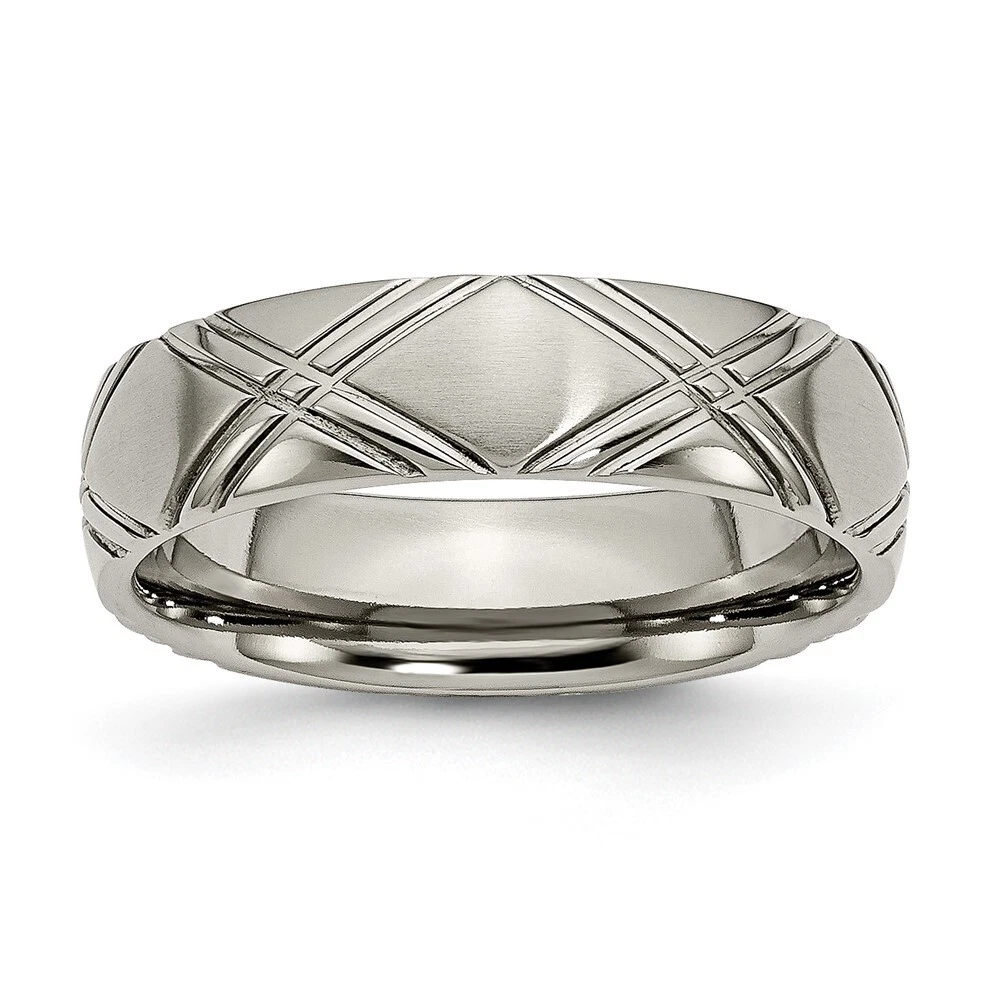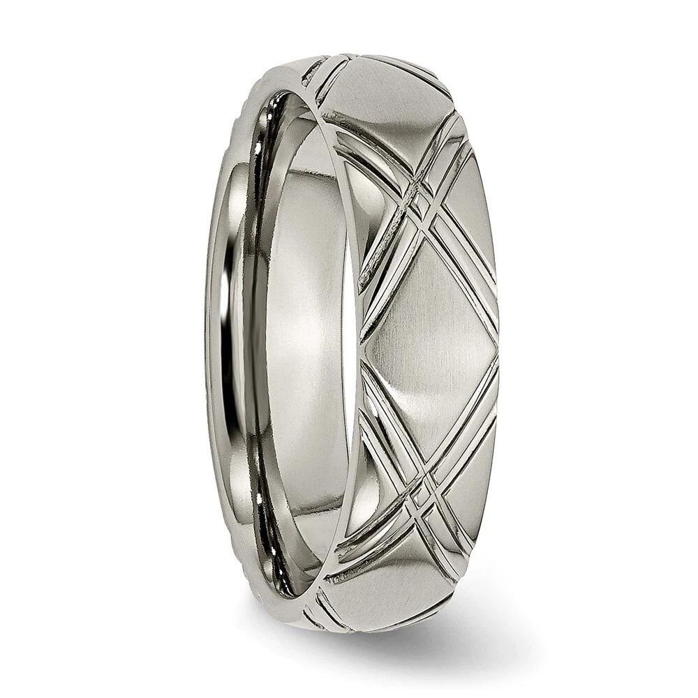 Finish:Polished & Brushed|Band Width:6 mm|Material: Primary:Titanium|Ring Fit:Standard|Sizeable:No|Thickness:< 2 mm|Item Weight U/M:gm|Width of Item:6 mm|Engravable:Yes|Packaging:Gift Pouch|Product Type:Jewelry|Jewelry Type:Rings|Sold By Unit:Each|Gender:Unisex|Texture:Crisscross|Material: Primary - Color:Grey|Ring Type:Wedding Bands|Edge Type:Flat|Ring Shape:Half Round All weights and measurements are approximate and may vary slightly from the listed information. Welcome to diamond_6720 Payments We accept all Ebay approved payment. Please sent the payment to us within 8 days after the auction has ended, or you will have unpaid case auto open by eBay. Shipping Policy We will ship all items within 1 business days of purchase during the work week (M-F) excluding holidays. If you order on Friday, your order will be shipped the following business day. Tracking will be provided when it becomes available. We will only ship to a PayPal Verified Address. Please make sure your address is current and correct. If the information does not match, your order may be canceled. Buyers are responsible for all customs, duties and taxes for your respective countries. Delivery times for International Shipping will vary. California Buyers Pay 9.0% Tax on all orders. case auto open by eBay. Return Policy & Exchange Returns or Exchange are accepted. Buyer must contact us within 30 days after the item is received. Item must be returned in unworn and resalable condition. We will only issue a refund for the purchase price, excluding any shipping fees. If we are at fault, we will provide a full refund. Buyer is responsible for all return shipping costs. BUYERS FEEDBACK If you have any concerns regarding your purchase, please contact us via eBay Message, we assure you that a satisfactory resolution will be reached. Your feedback is very important to us Do remember to give us 5 star rating(*****) if you are satisfied with our product & service .
