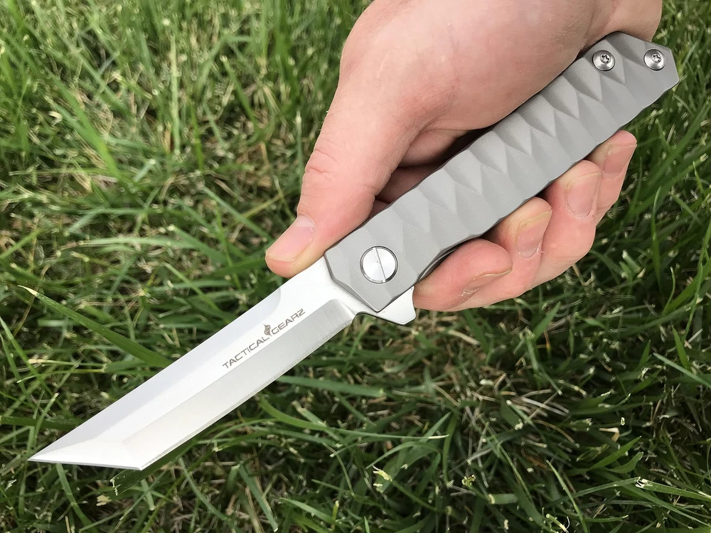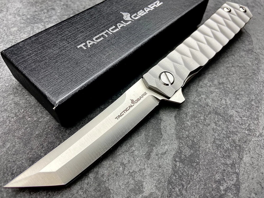 TacticalGearz TG Saint Tanto! Solid Tc4 Titanium Premium EDC Pocket Knife! High Quality Polished D2 Blade! Perfect size for EDC Features Include: Full Tc4 Titanium Handle! Razor Sharp CPM-D2 Tanto Steel Blade! Frame Lock! Titanium Belt Clip, Custom Gift Box & Sheath! Handle Construction: Solid Tc4 Titanium Handle w/Textured Scales for a Tight Grip! Knife features the full strength of Titanium at only 4.41oz! Blade: High Quality CPM-D2 Steel Blade! Features the Tanto Tip, Hardness: 60-62 HRC, Blade thickness: .14", Heat Treatment: Vacuum Blade Length: 3.5", Handle Length: 4.75", Overall Length: 8.25", Weight: 4.41oz, Package includes Custom Gift Box & Nylon Storage Sheath!